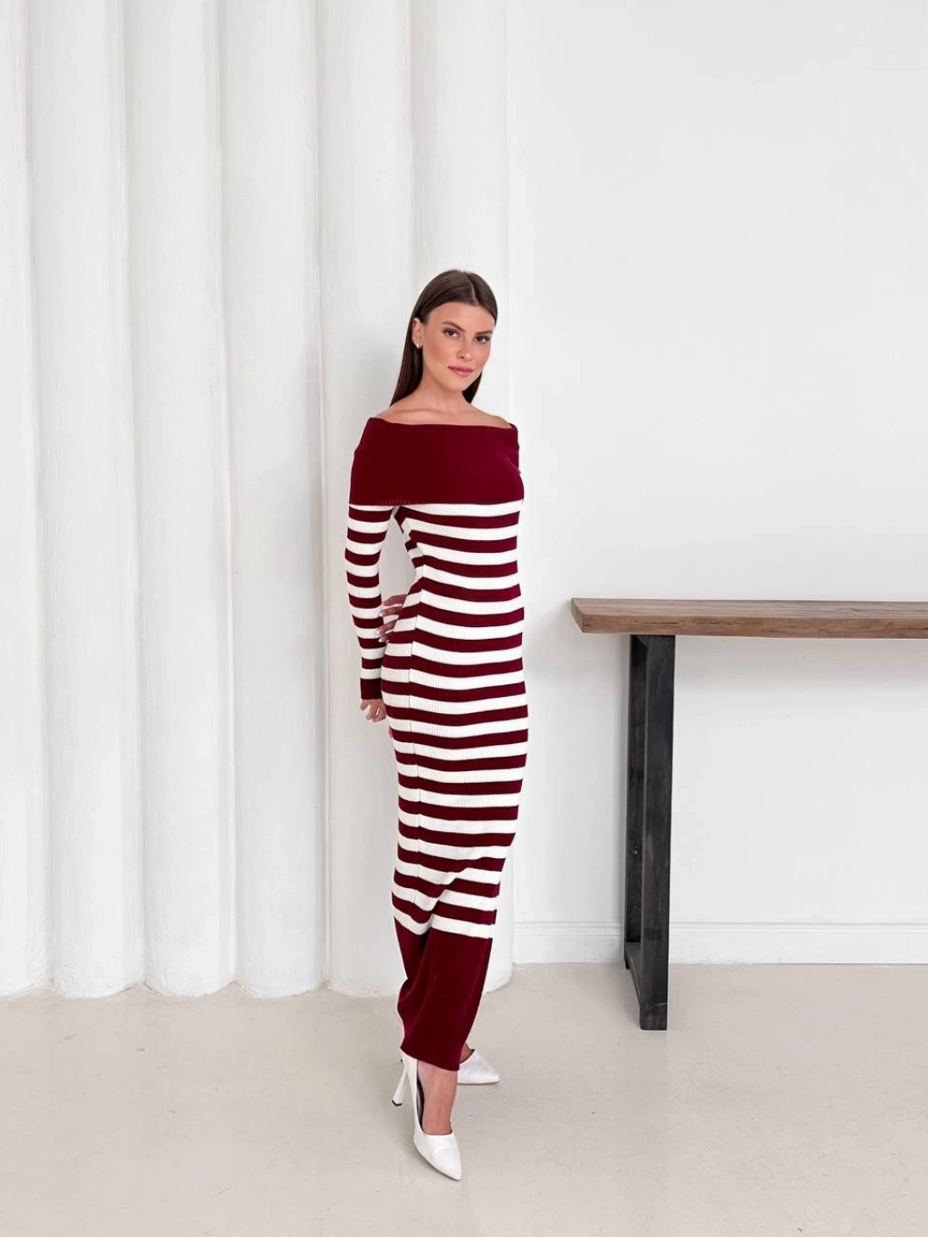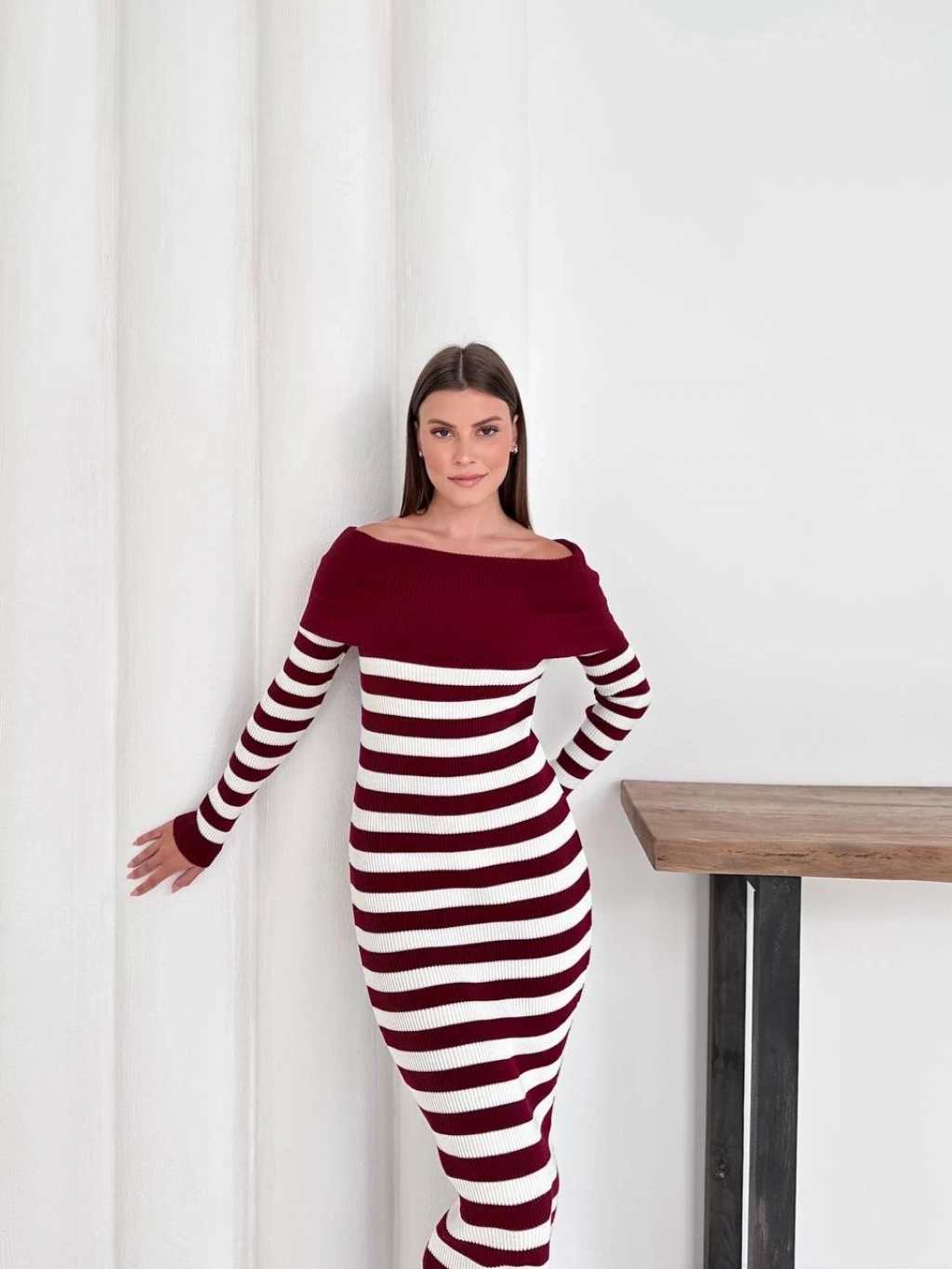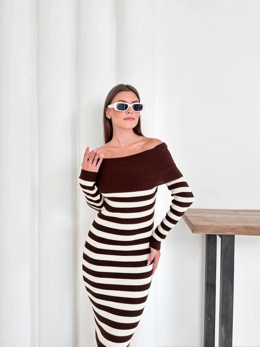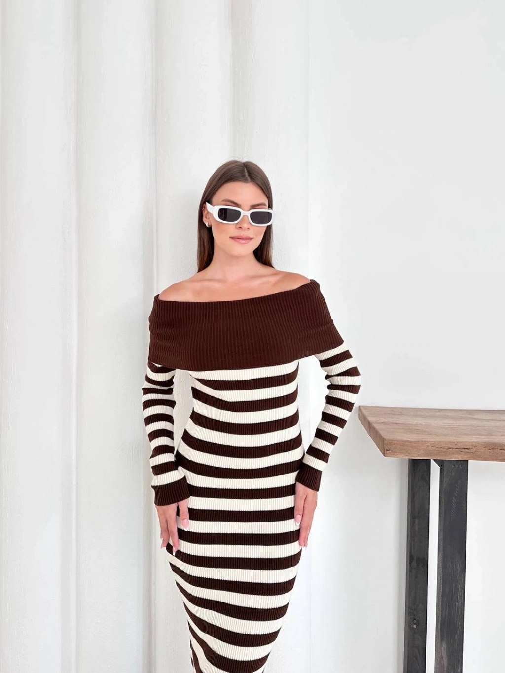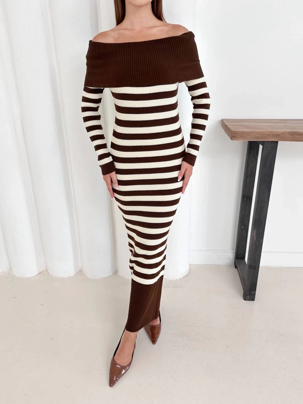 Kadın Kahverengi Madonna Kayık Yaka Esnek Midi Boy Triko Elbise