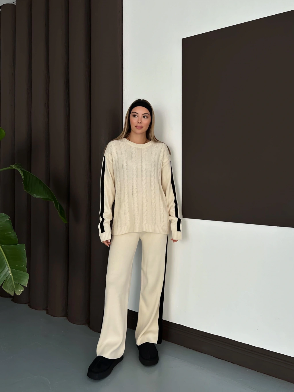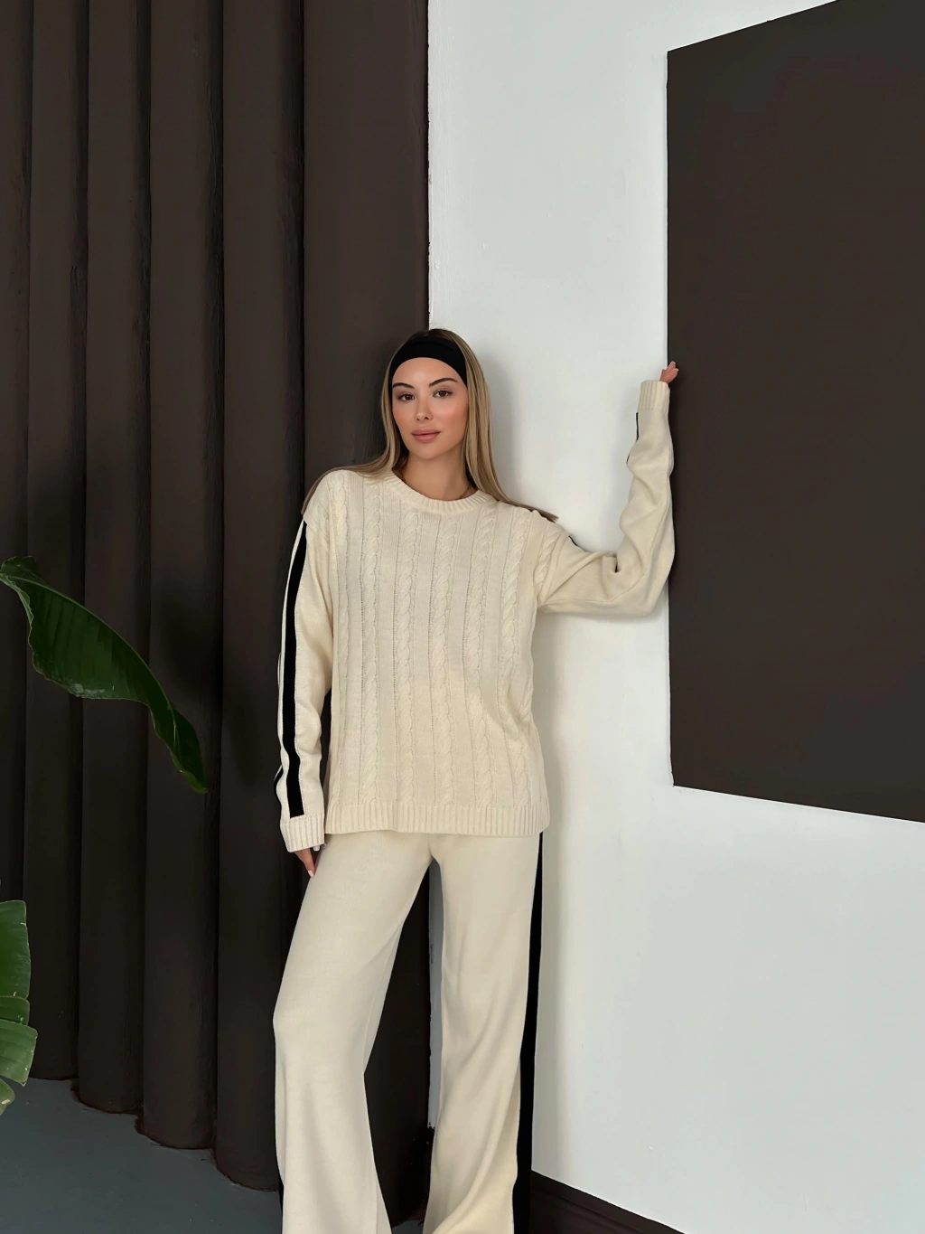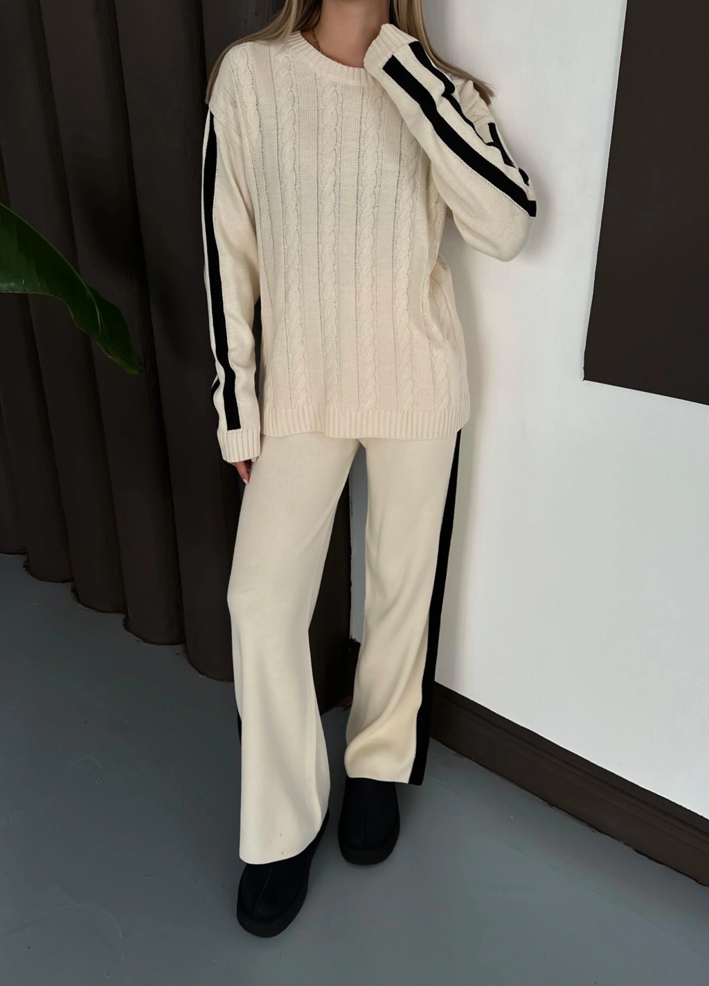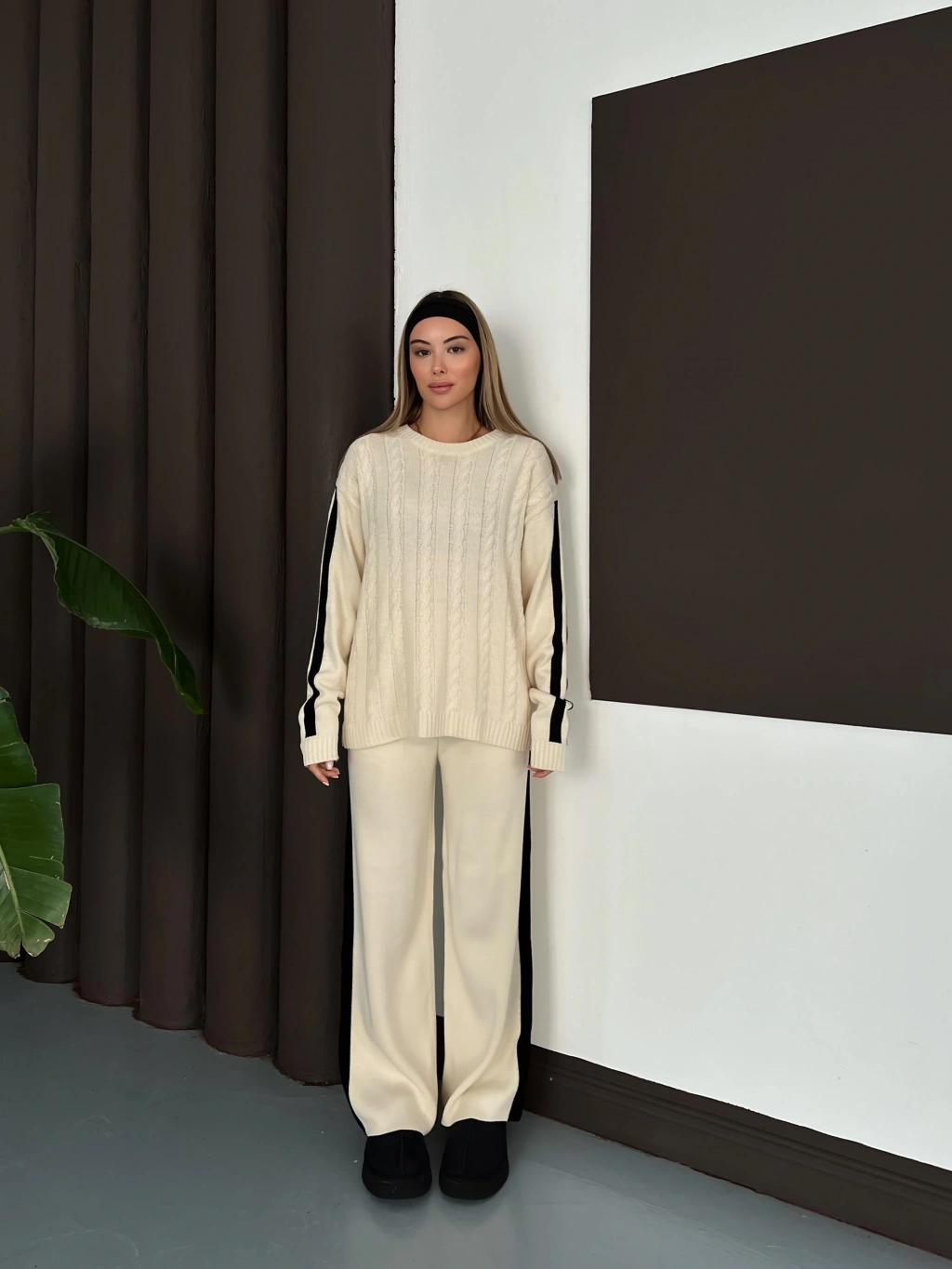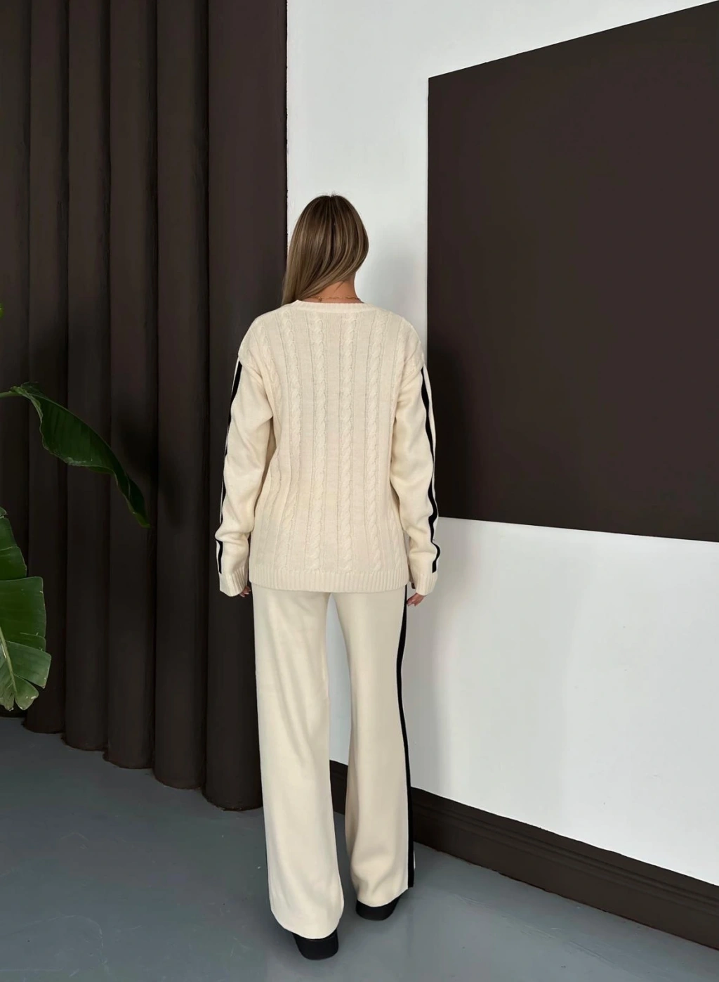 Kadın Ekru Şerit Detaylı Kazak Pantolon Alt Üst İkili Triko Takım