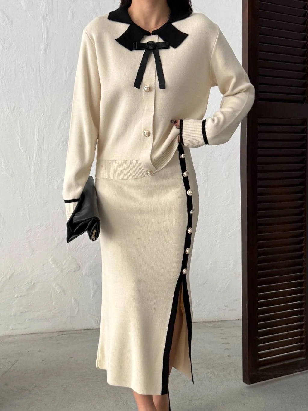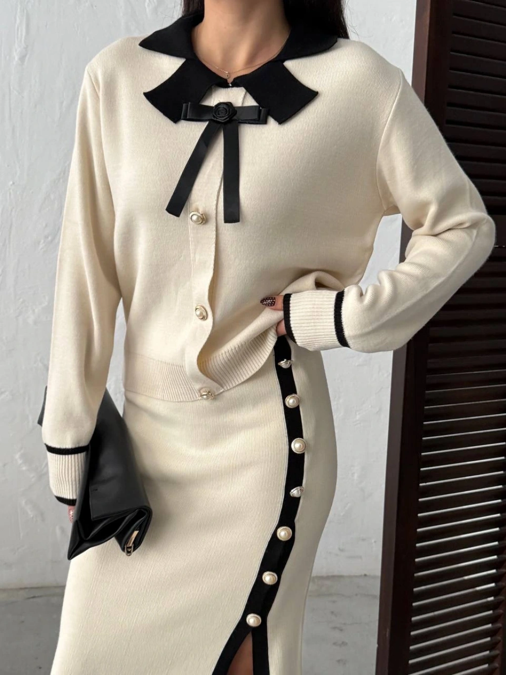 Kadın Siyah Kol Düğme Detaylı Bluz Etek Alt Üst İkili Triko Takım