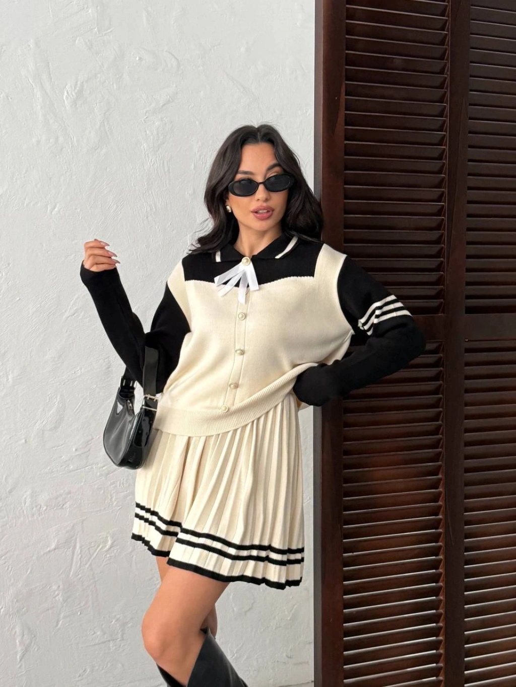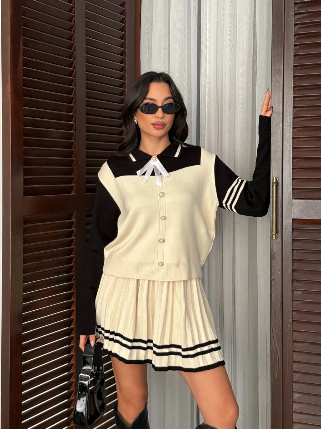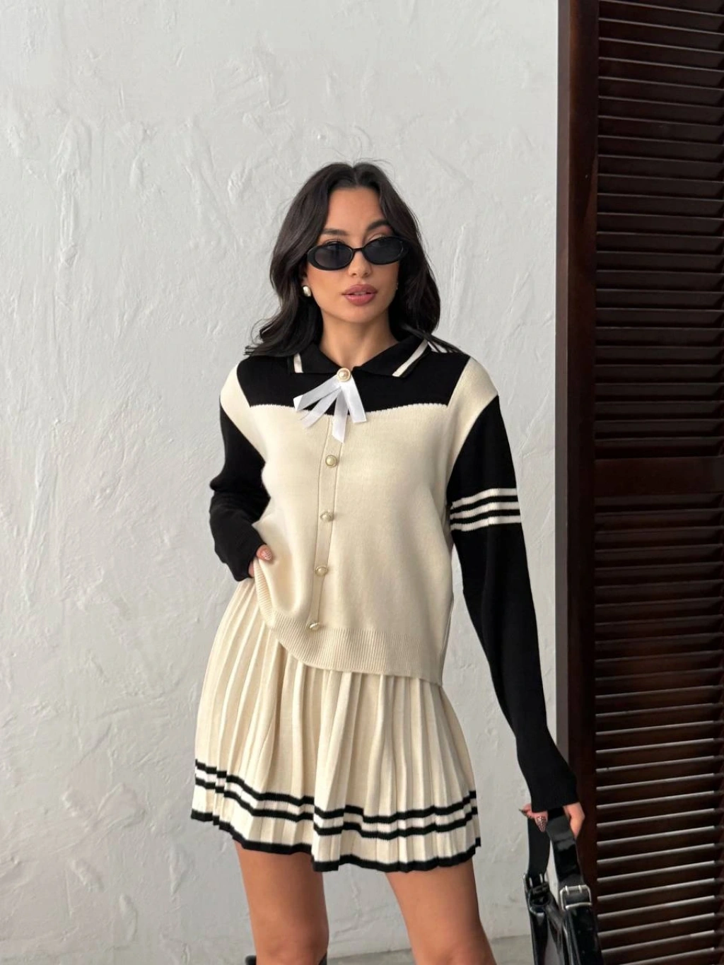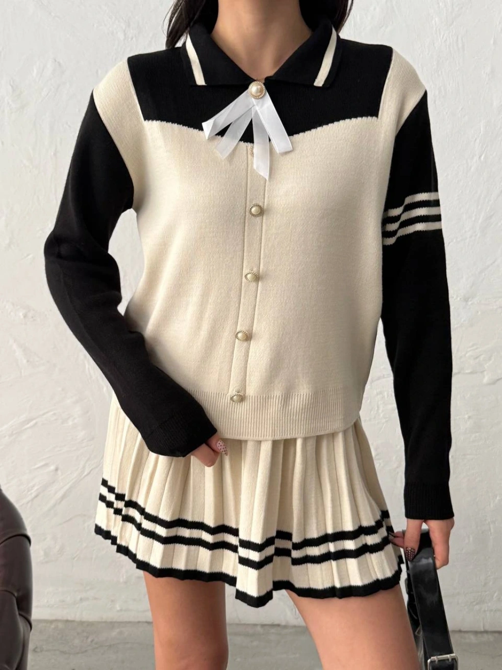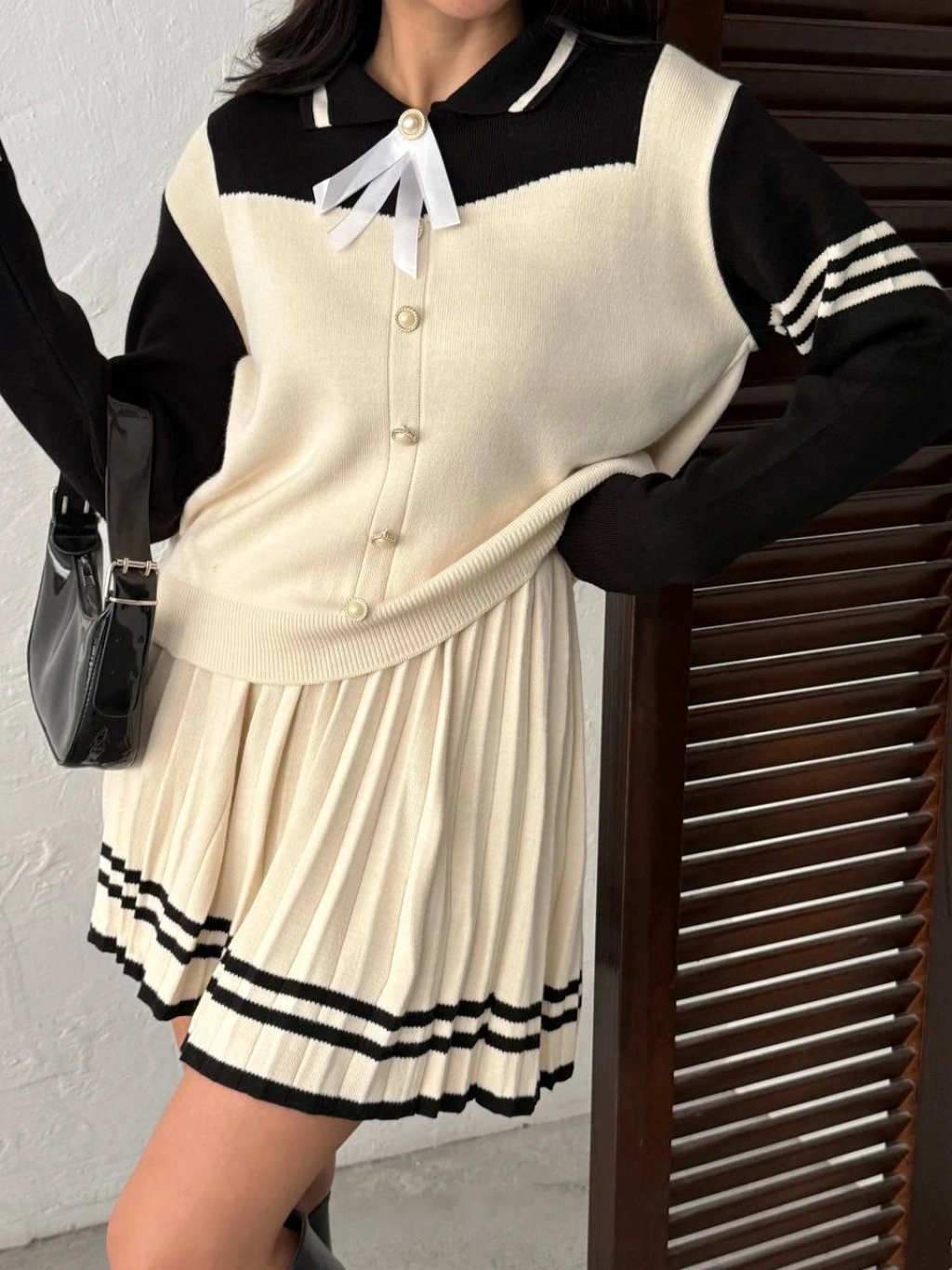 Kadın Siyah Çizgili Polo Yaka Kazak Etek İkili Triko Takım