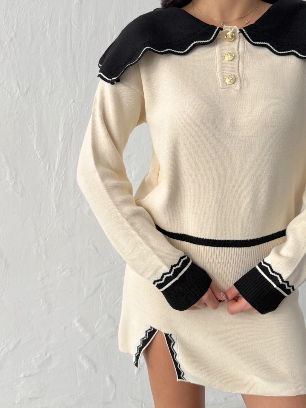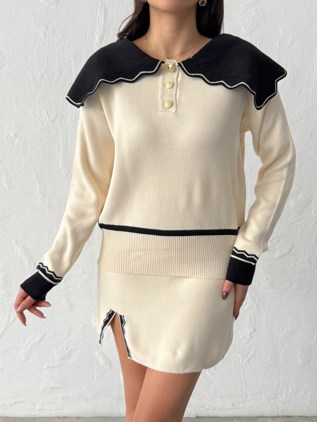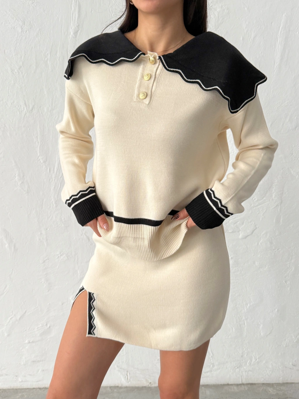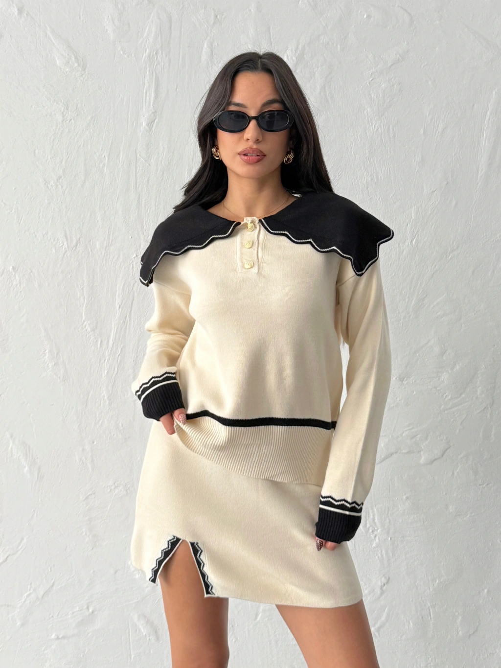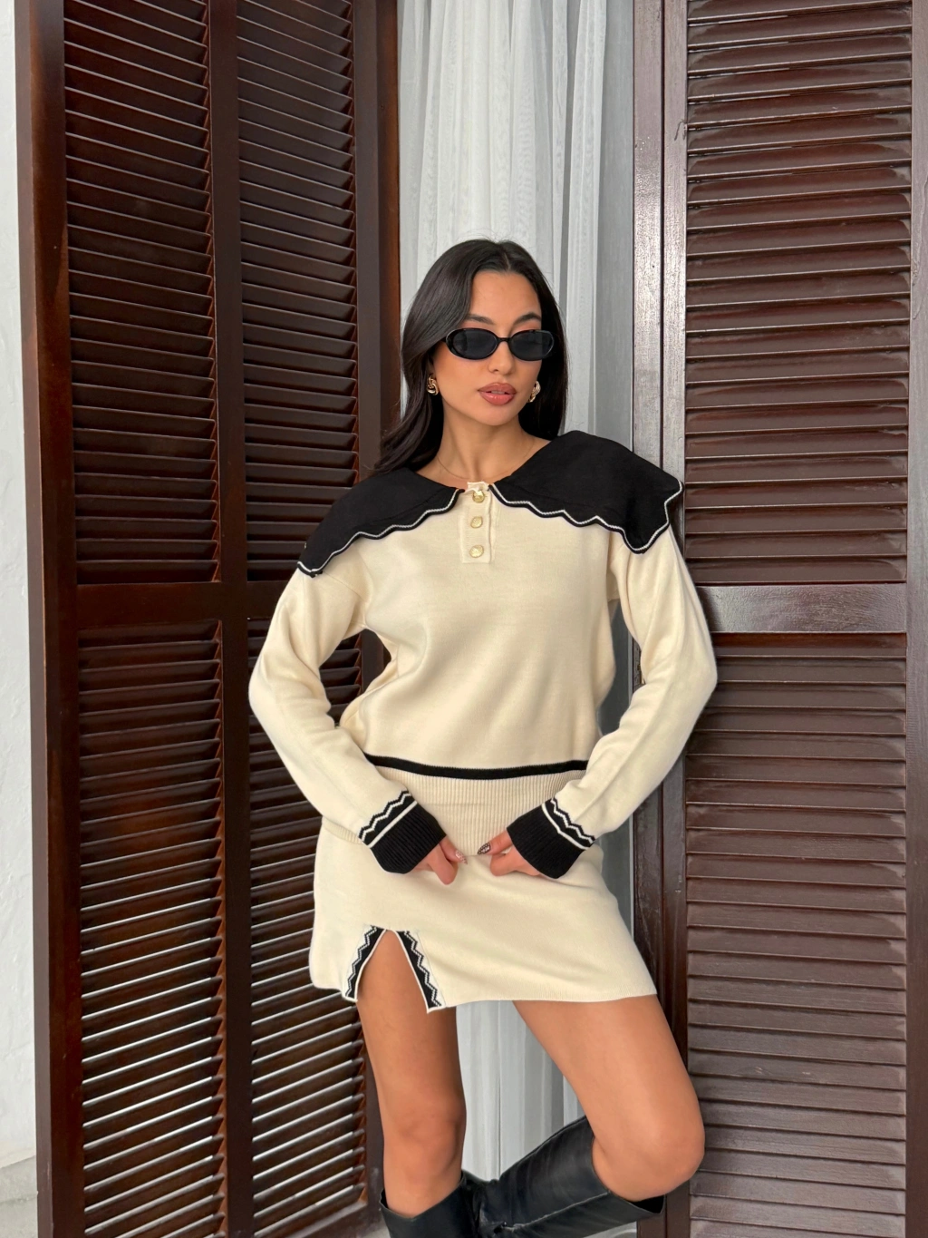 Kadın Krem Kol Düğme Detaylı Bluz Etek Alt Üst İkili Triko Takım