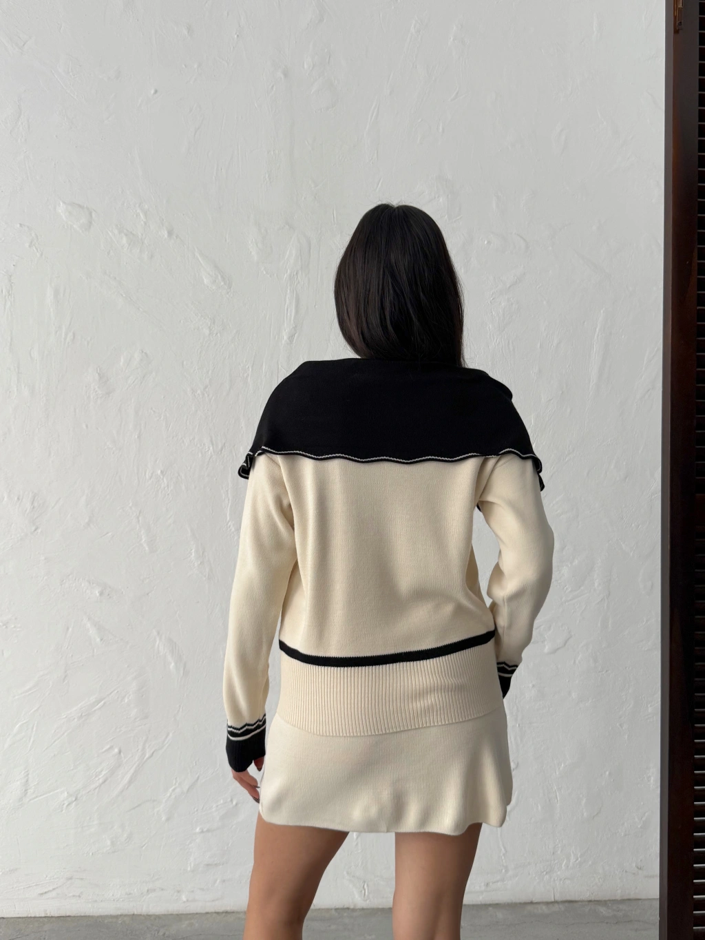 Kadın Ekru Yaka Ve Yırtmaç detaylı Bluz Mini Etek Alt Üst İkili Triko takım