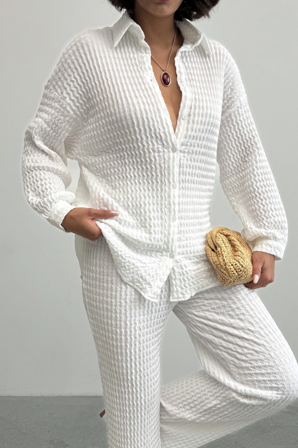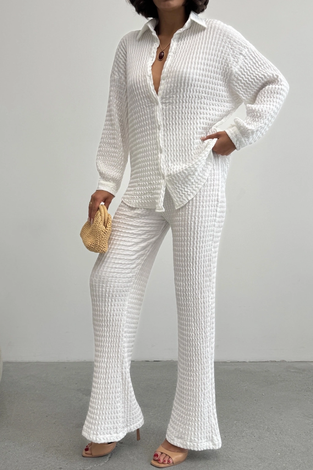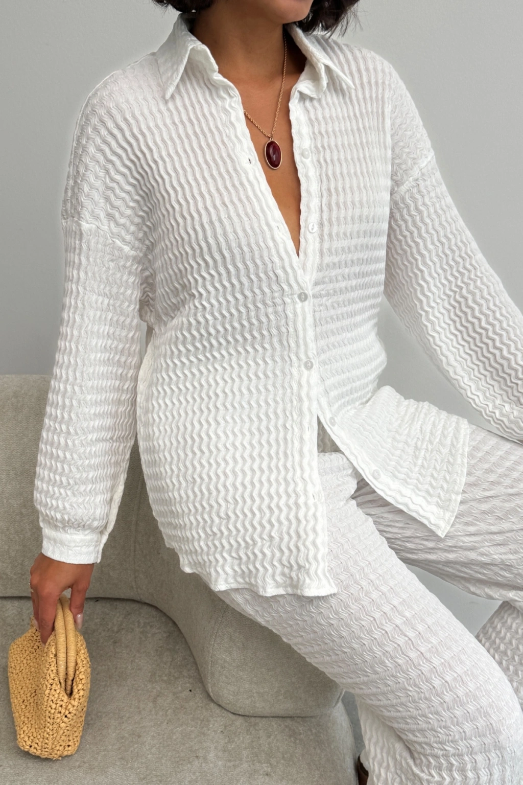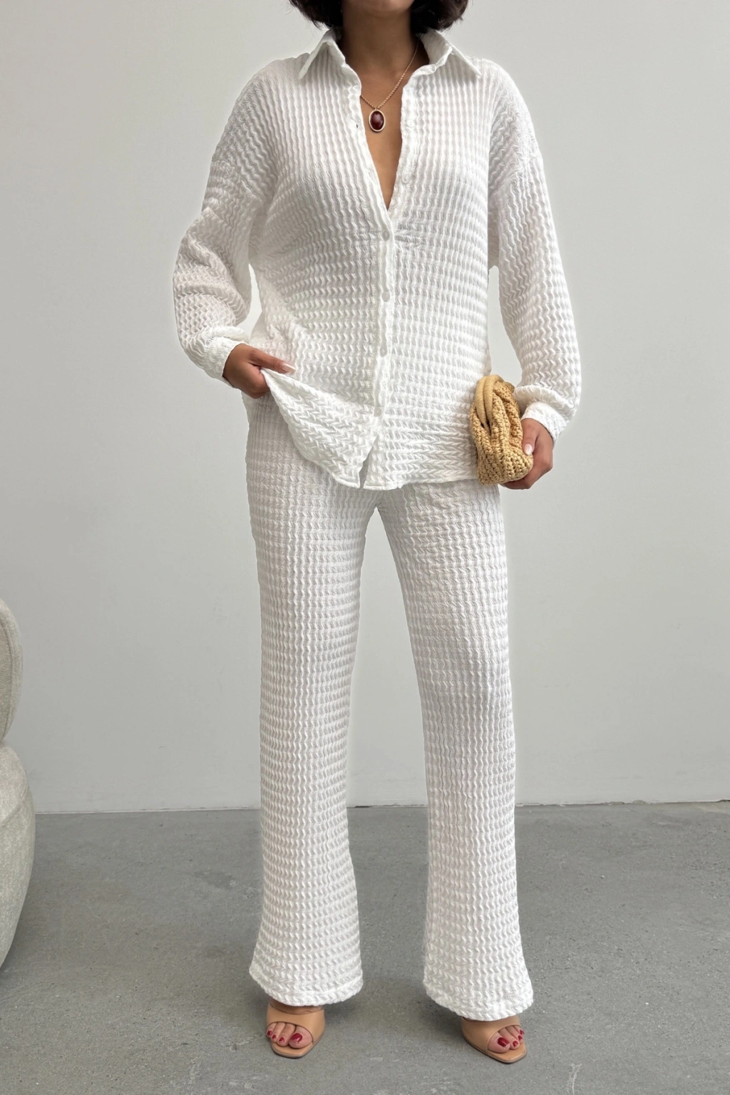 Kadın Ekru Yumuşak Dokulu Gömlek Pantolon İkili Premium Kalite Takım
