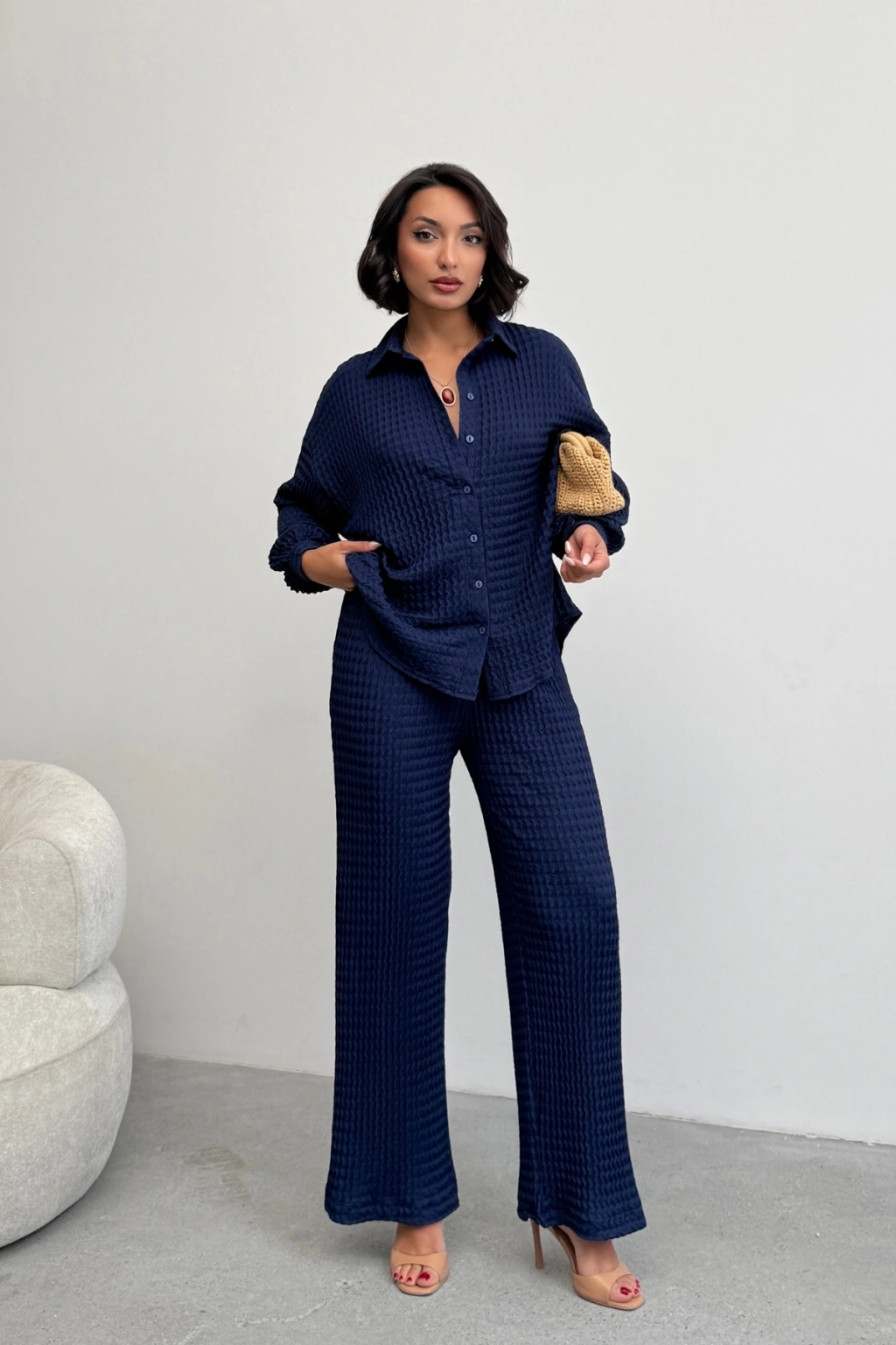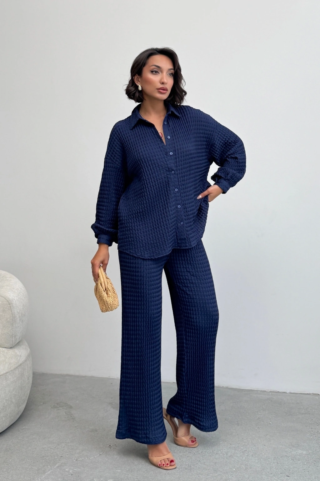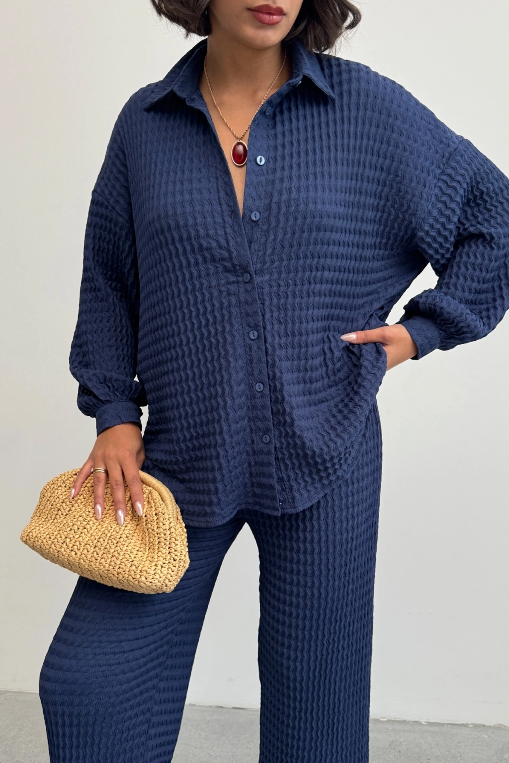 Kadın Lacivert Yumuşak Dokulu Gömlek Pantolon İkili Premium Kalite Takım