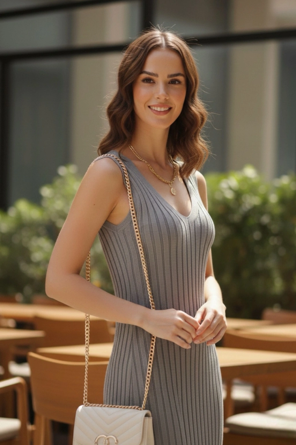 Kadın Gri Fitilli Askılı Midi Elbise (S/M Beden)