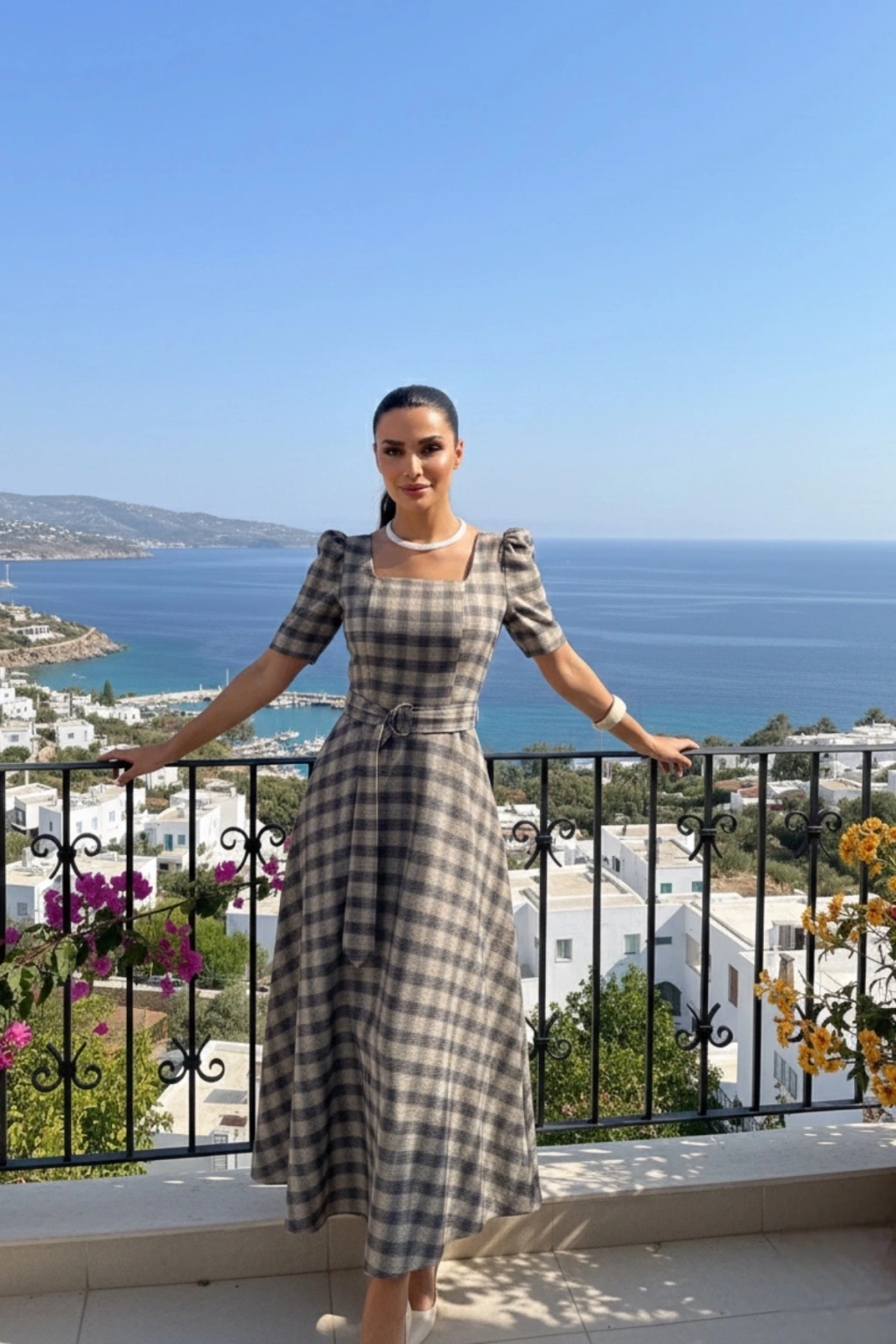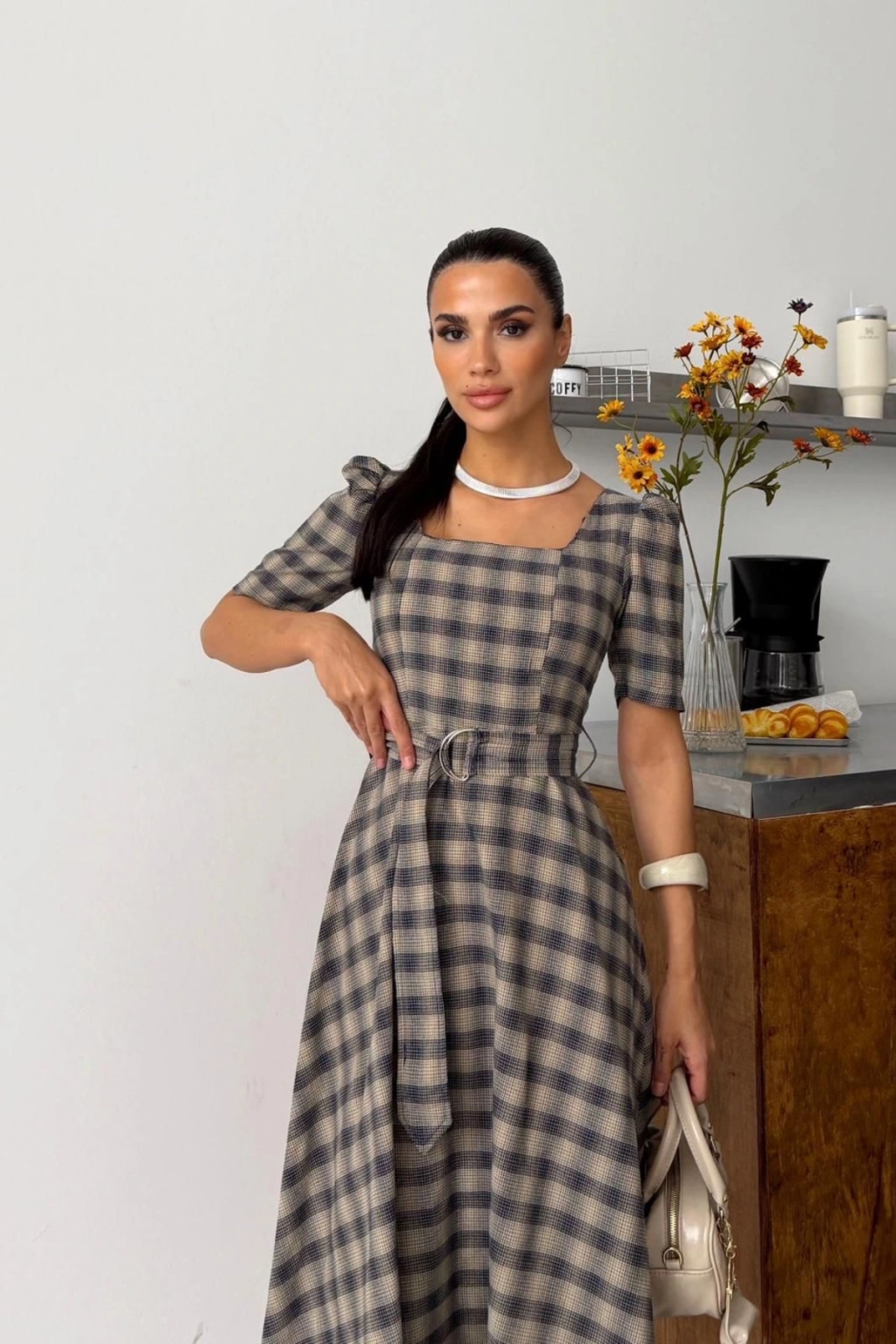 Kadın Gri Kare Yaka Ekose Desenli Kemerli Kısa Kol Midi Boy Kloş Elbise