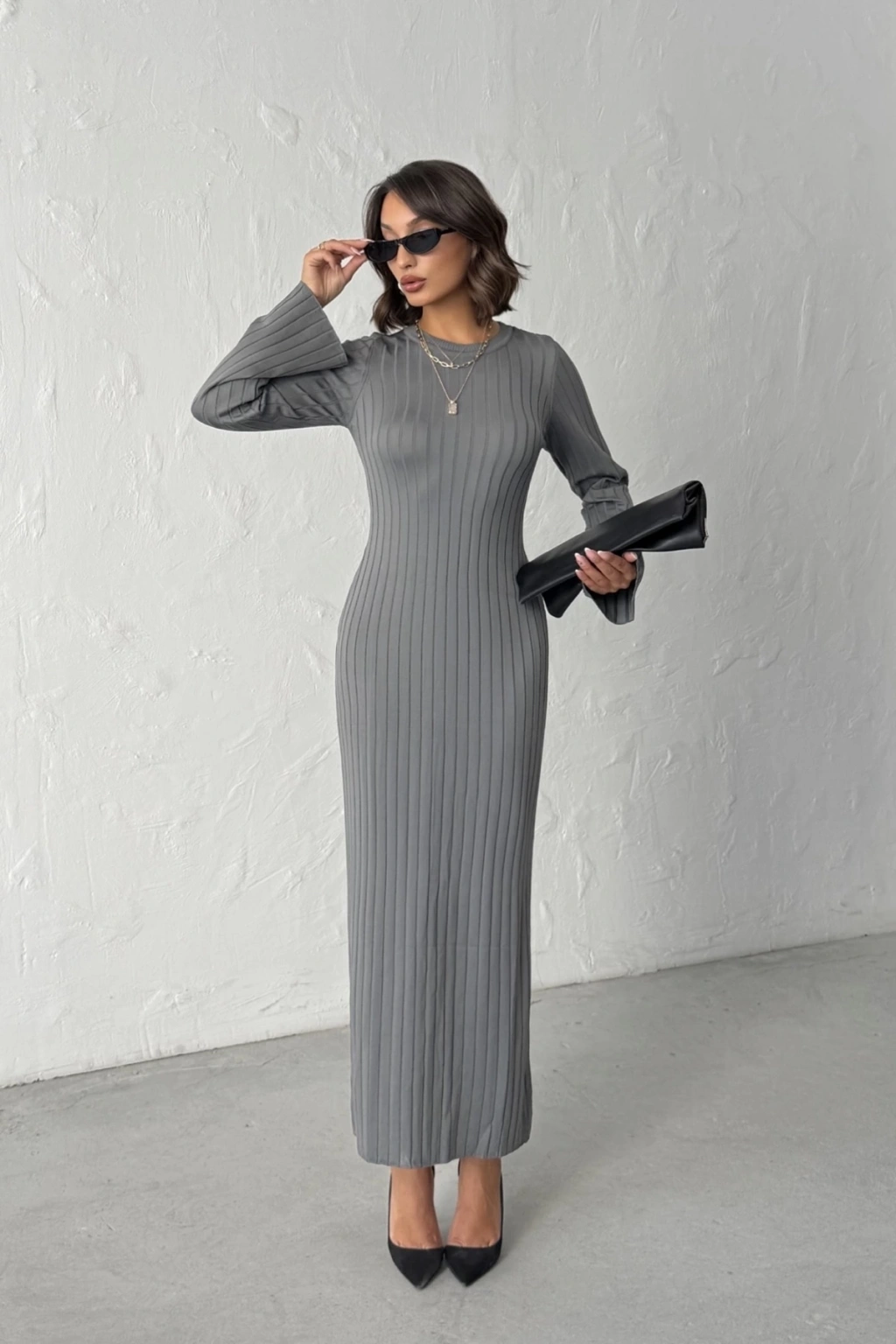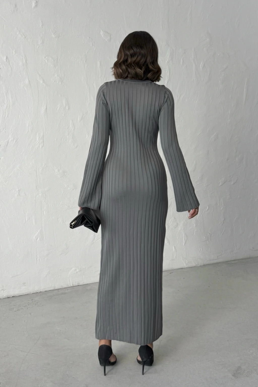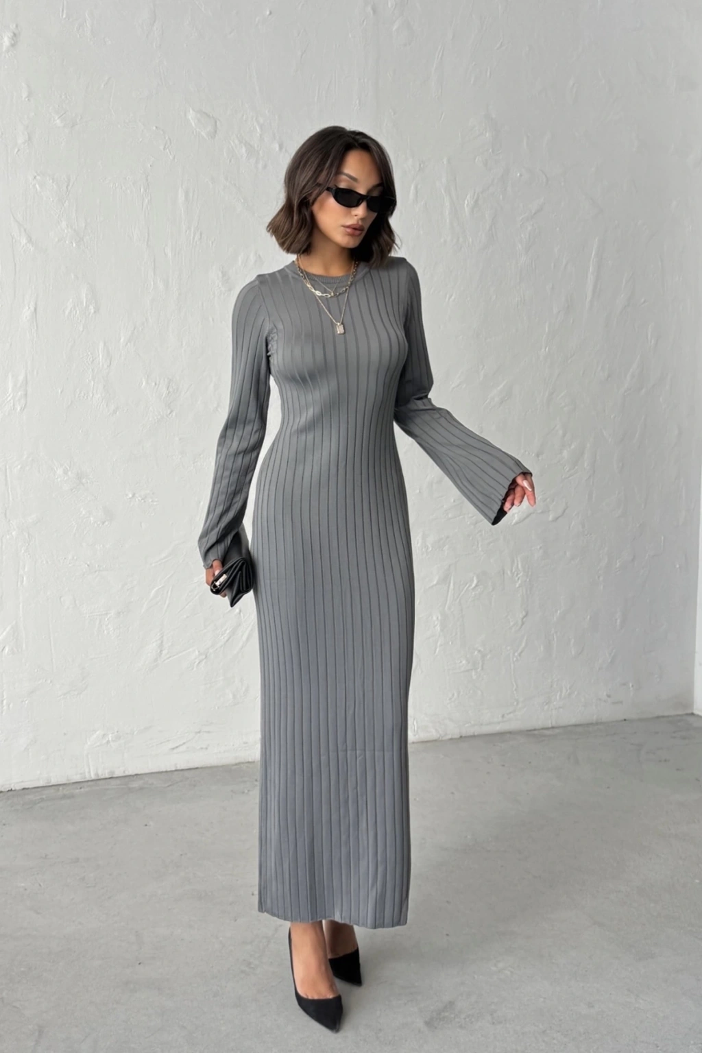 Kadın Gri Uzun kol Şık Zarif Midi Boy Triko Elbise