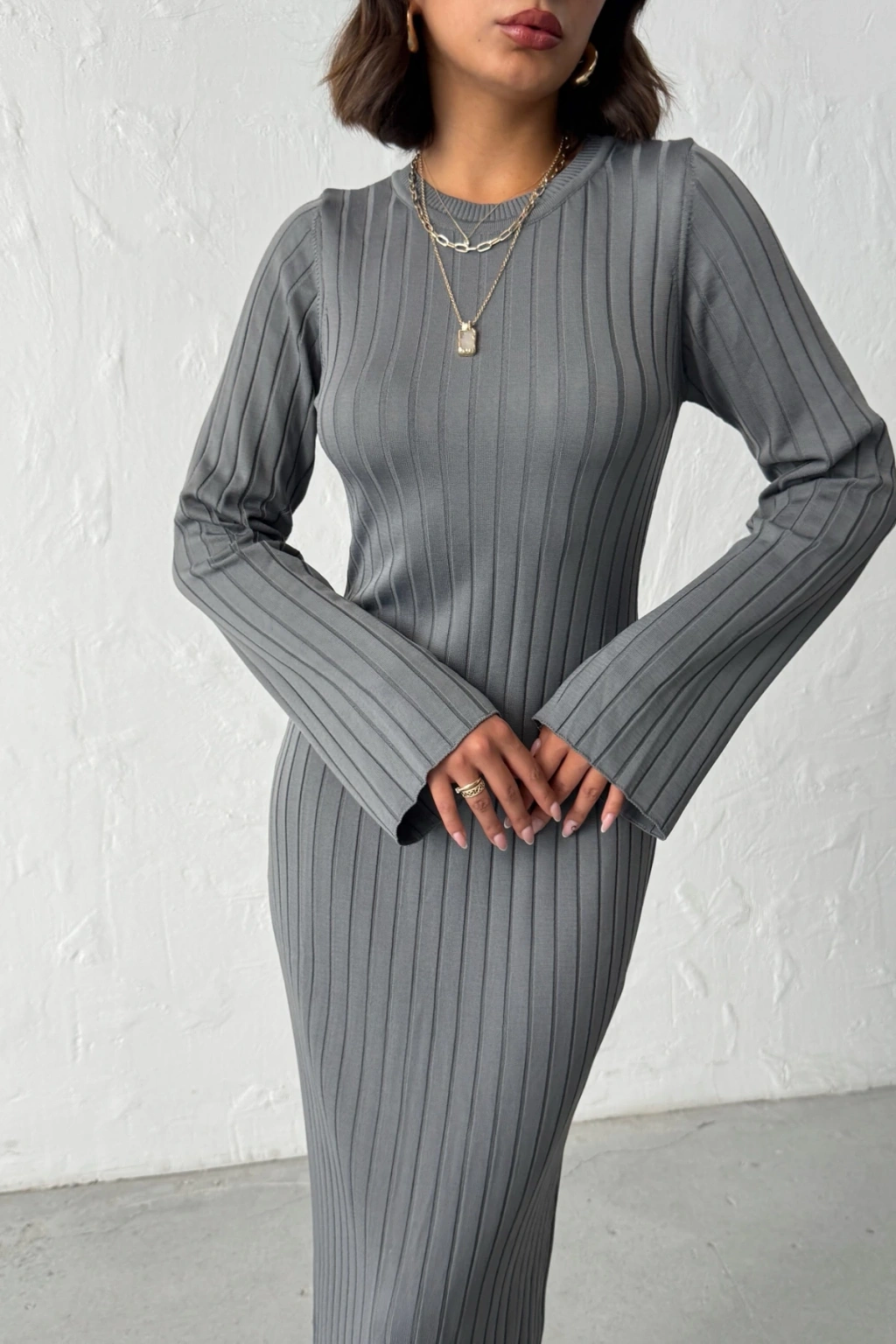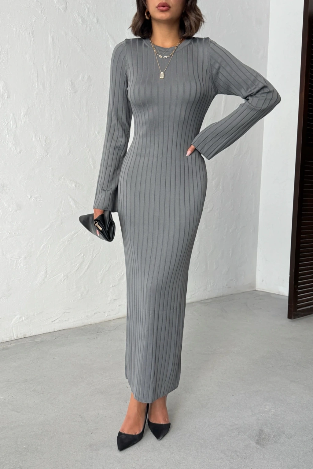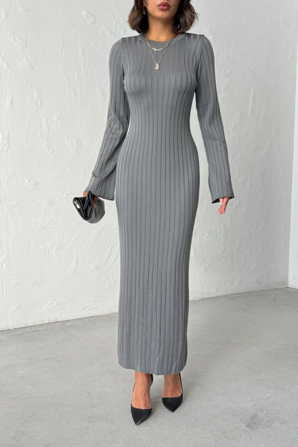 Kadın Gri Uzun kol Şık Zarif Midi Boy Triko Elbise