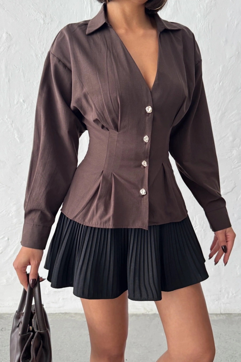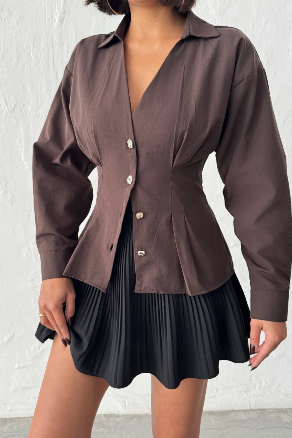 Kadın Acı Kahverengi Belden Oturtmalı Pens Detaylı Beli Pileli Şık Düğmeli V Yaka Gömlek