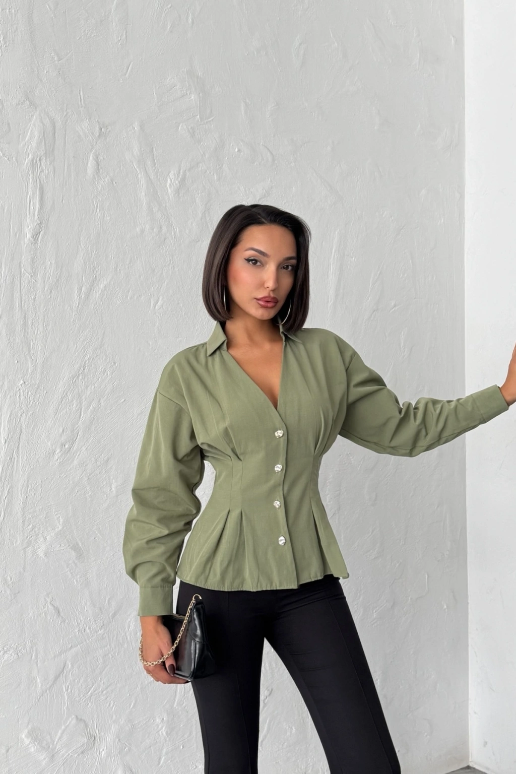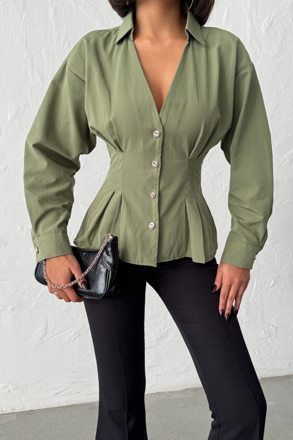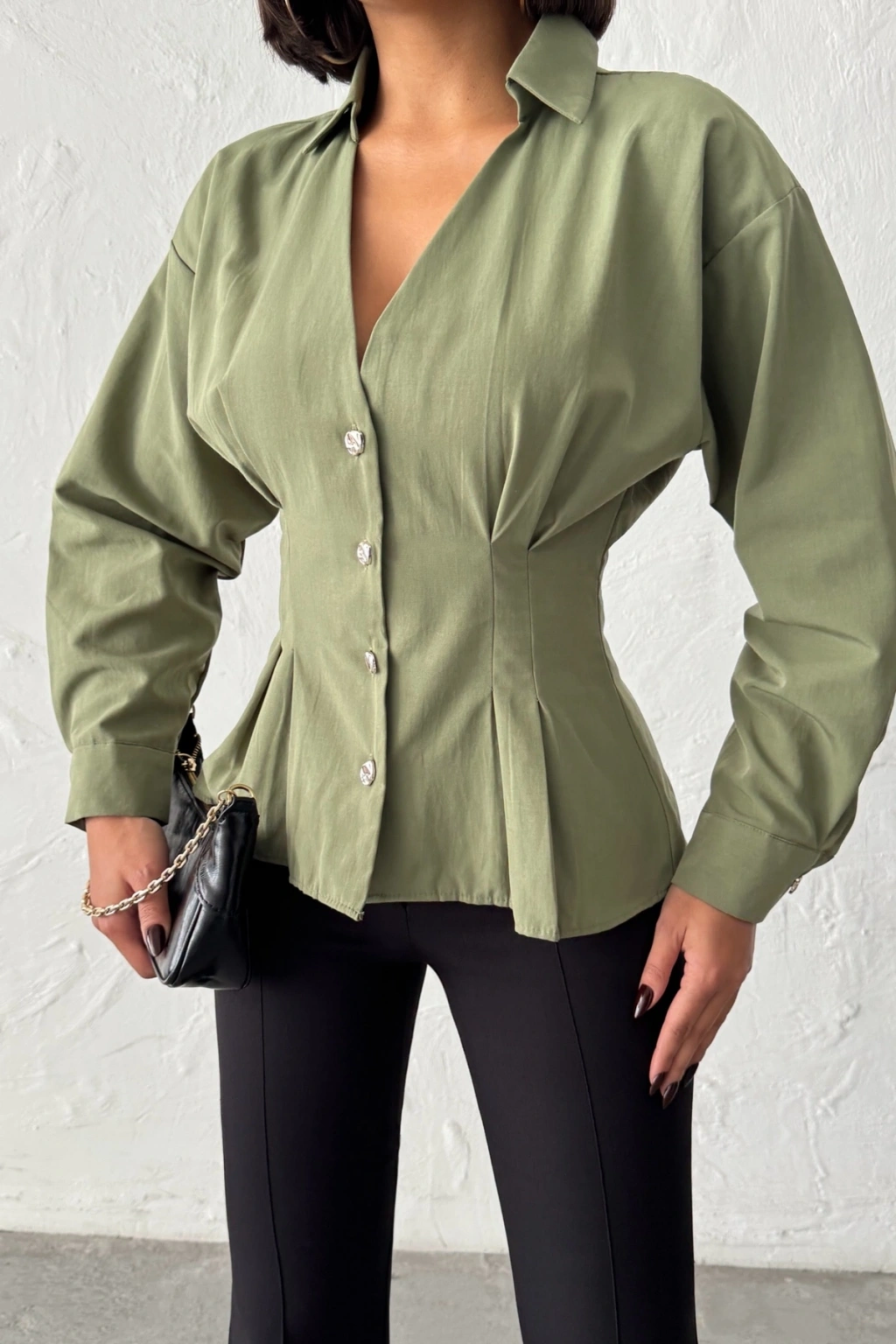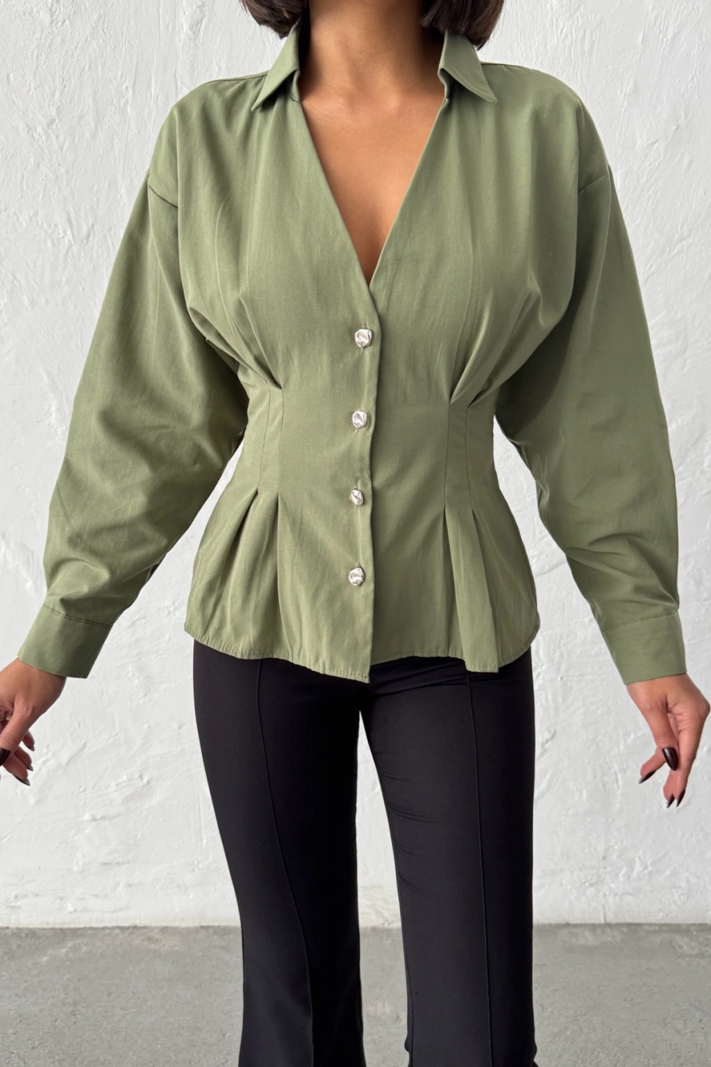 Kadın Haki Belden Oturtmalı Pens Detaylı Beli Pileli Şık Düğmeli V Yaka Gömlek