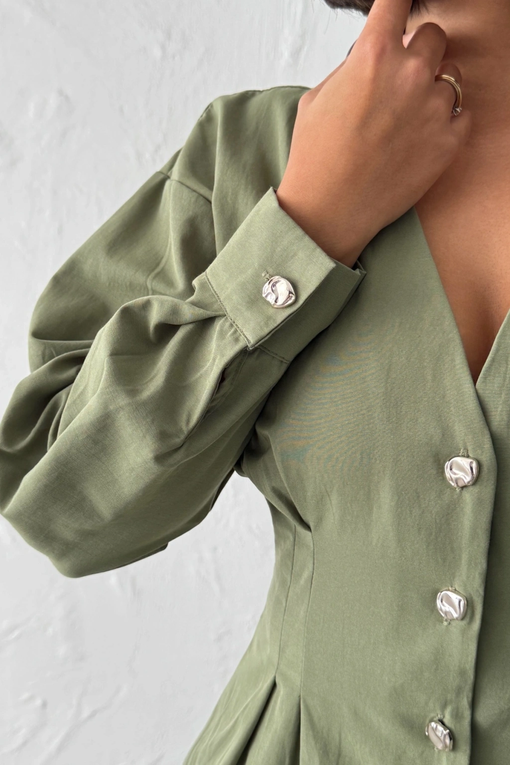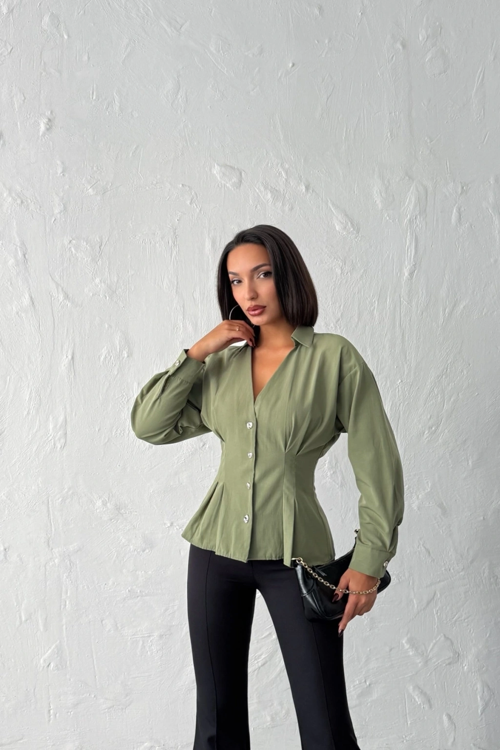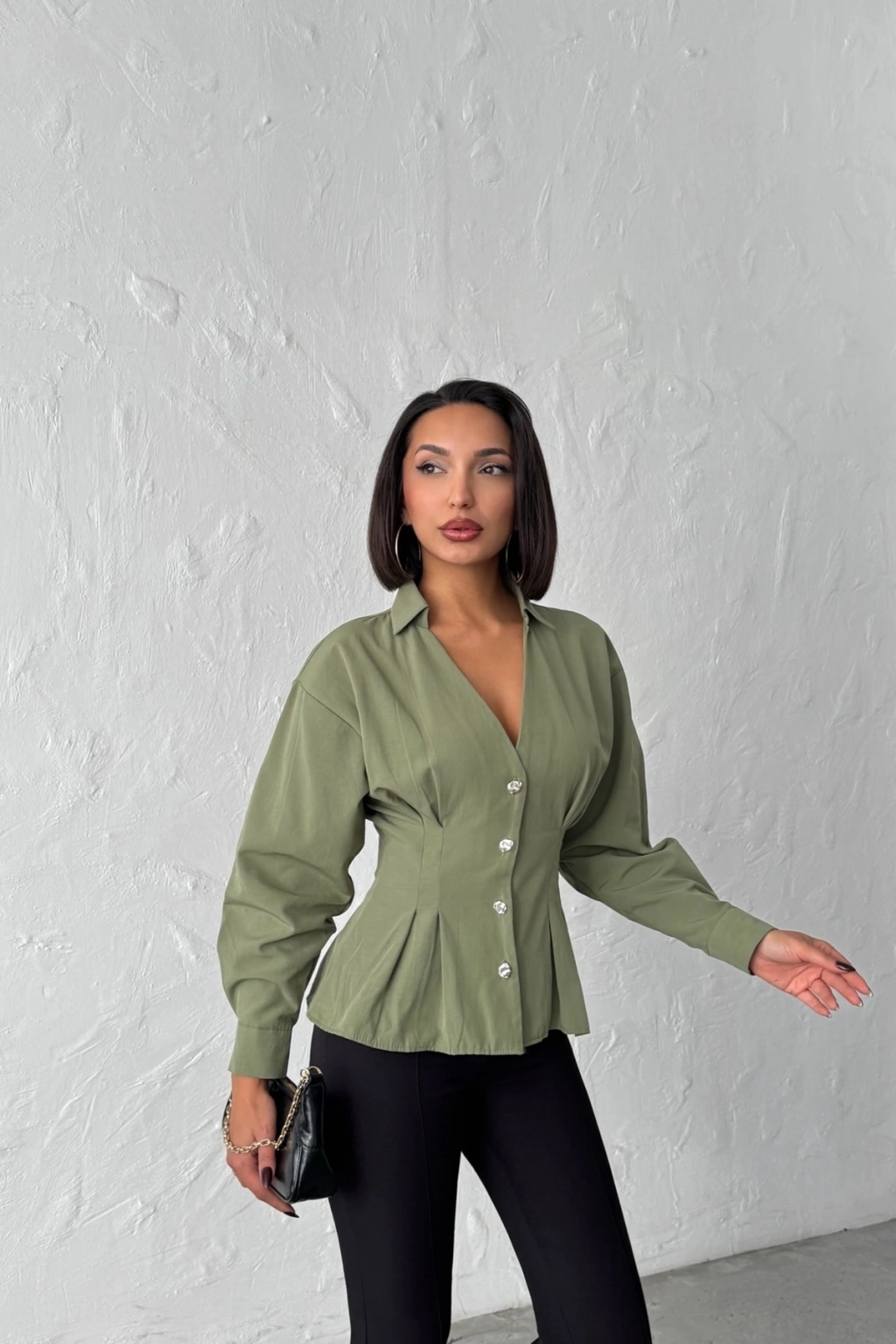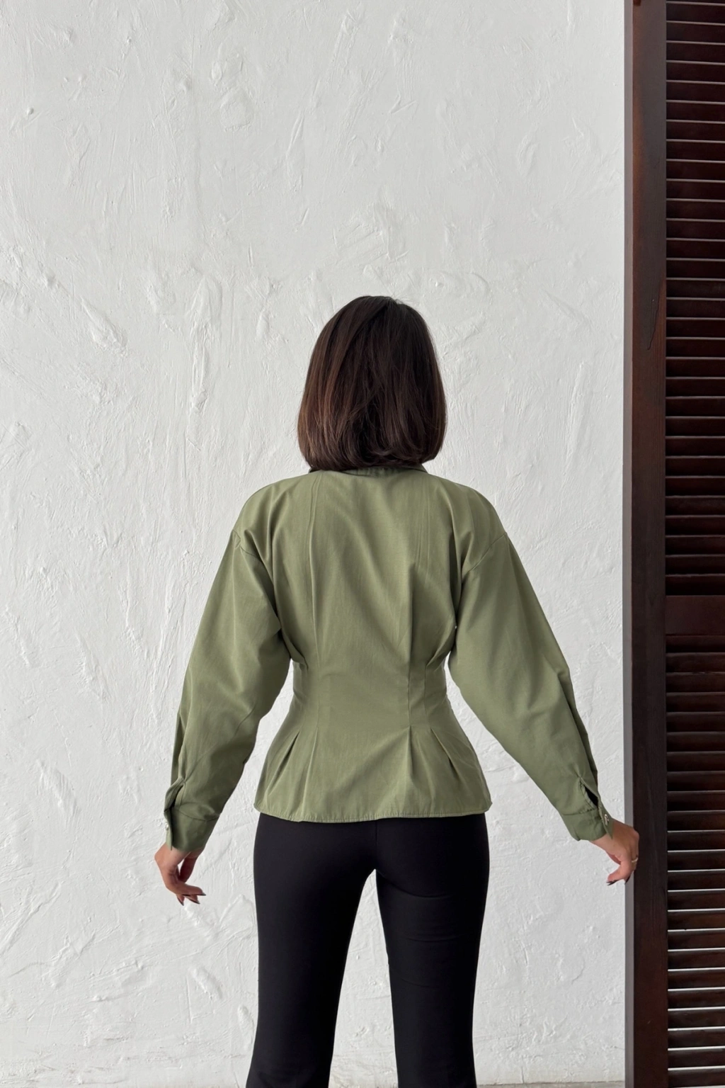Kadın Haki Belden Oturtmalı Pens Detaylı Beli Pileli Şık Düğmeli V Yaka Gömlek