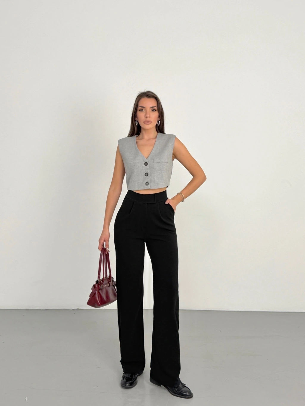 Kadın Siyah Şık Belden Oturmalı Pensli Uzun Kol Gömlek