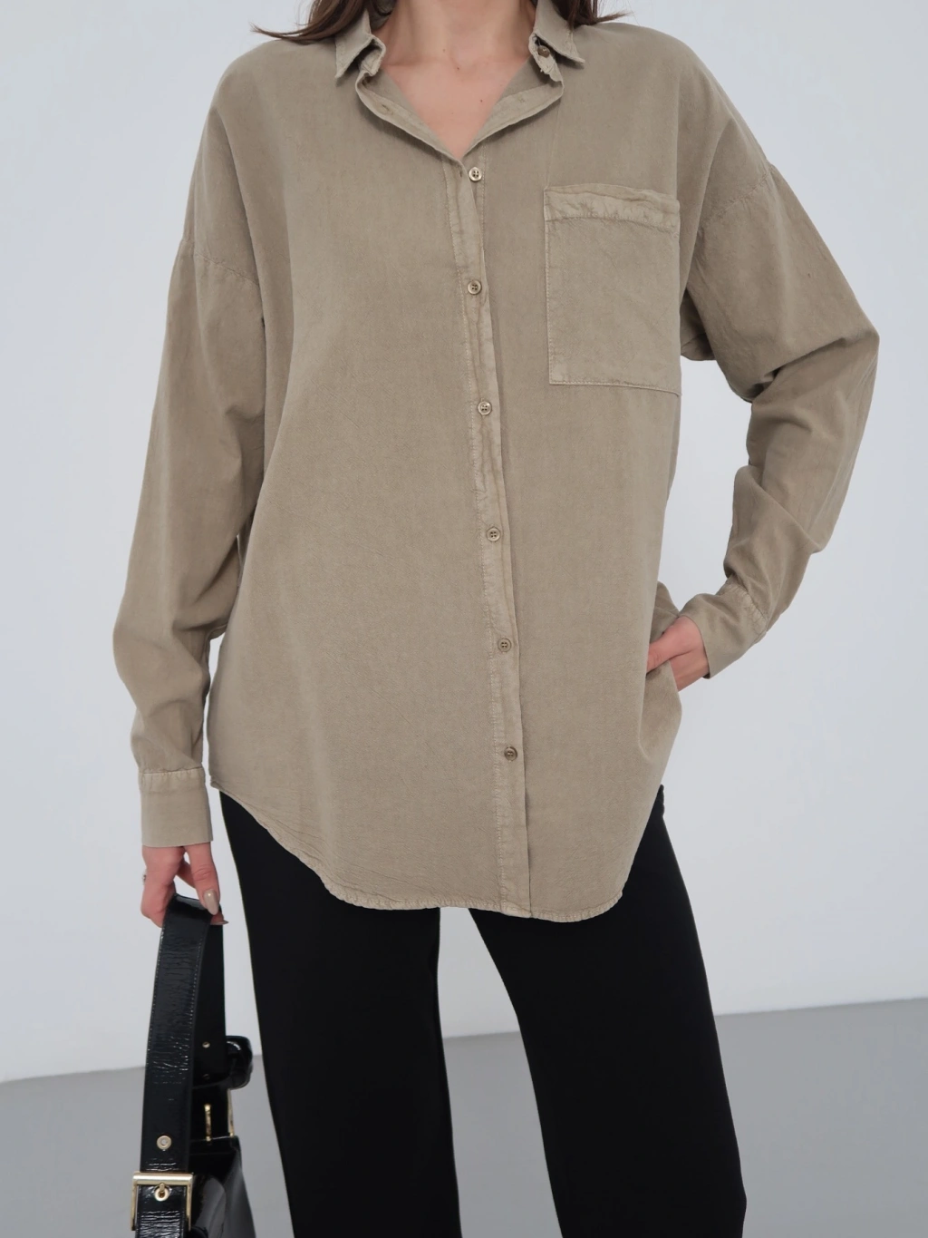 Kadın Kahverengi Ham Kumaş Cepli Gömlek