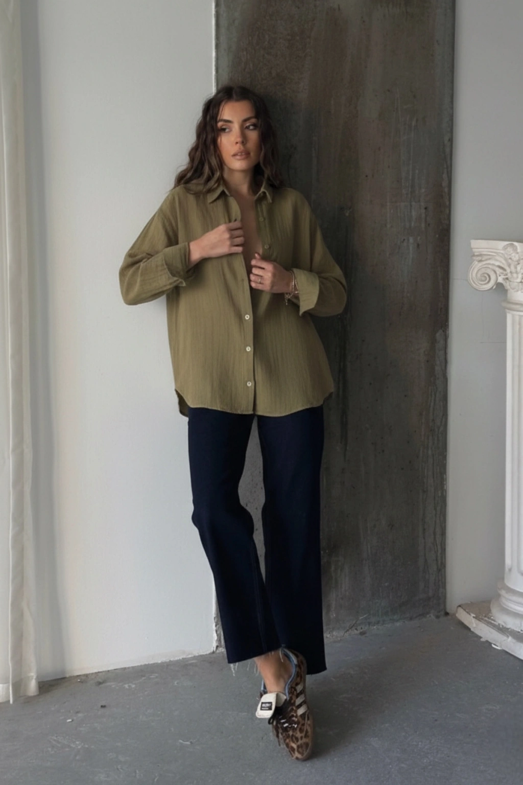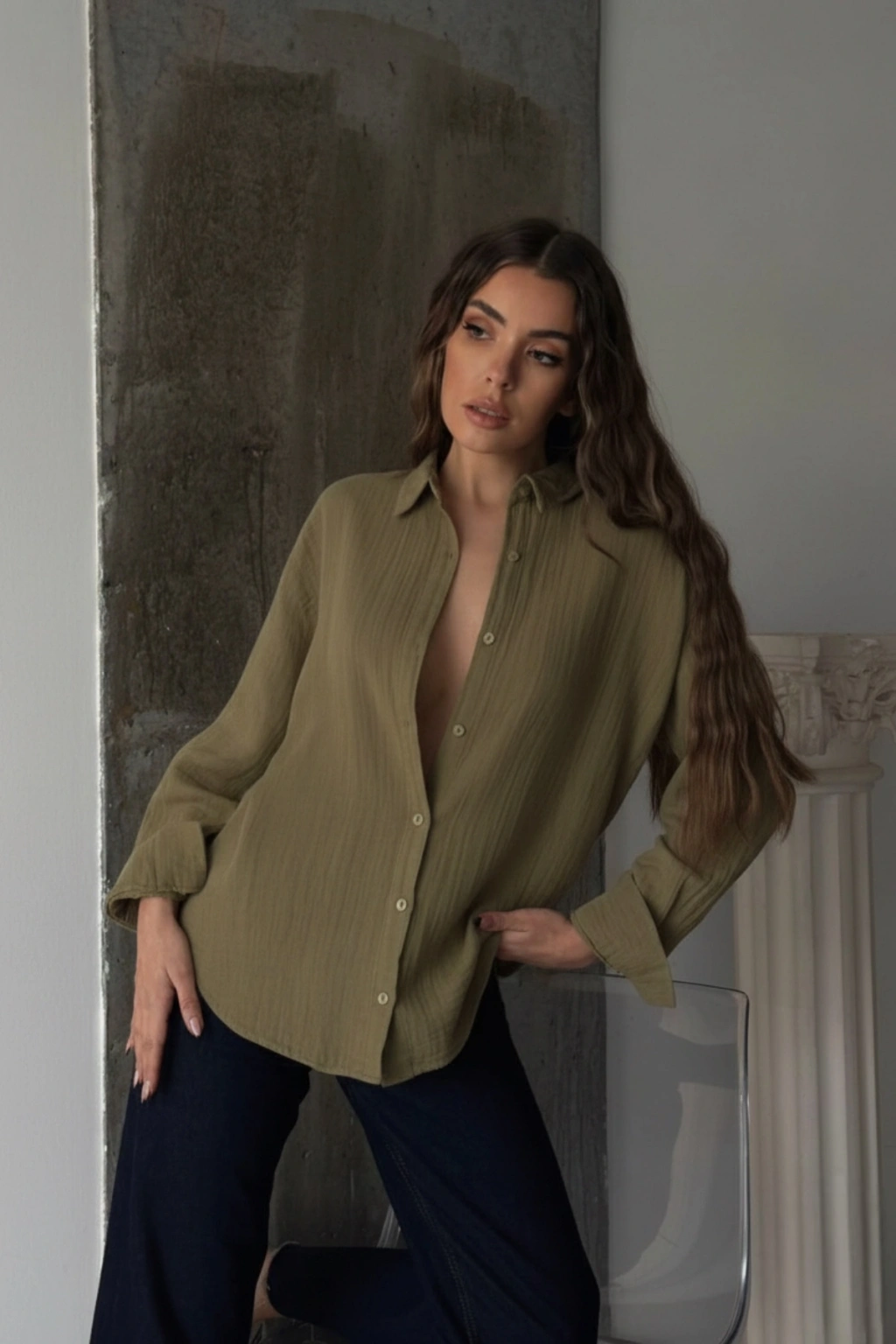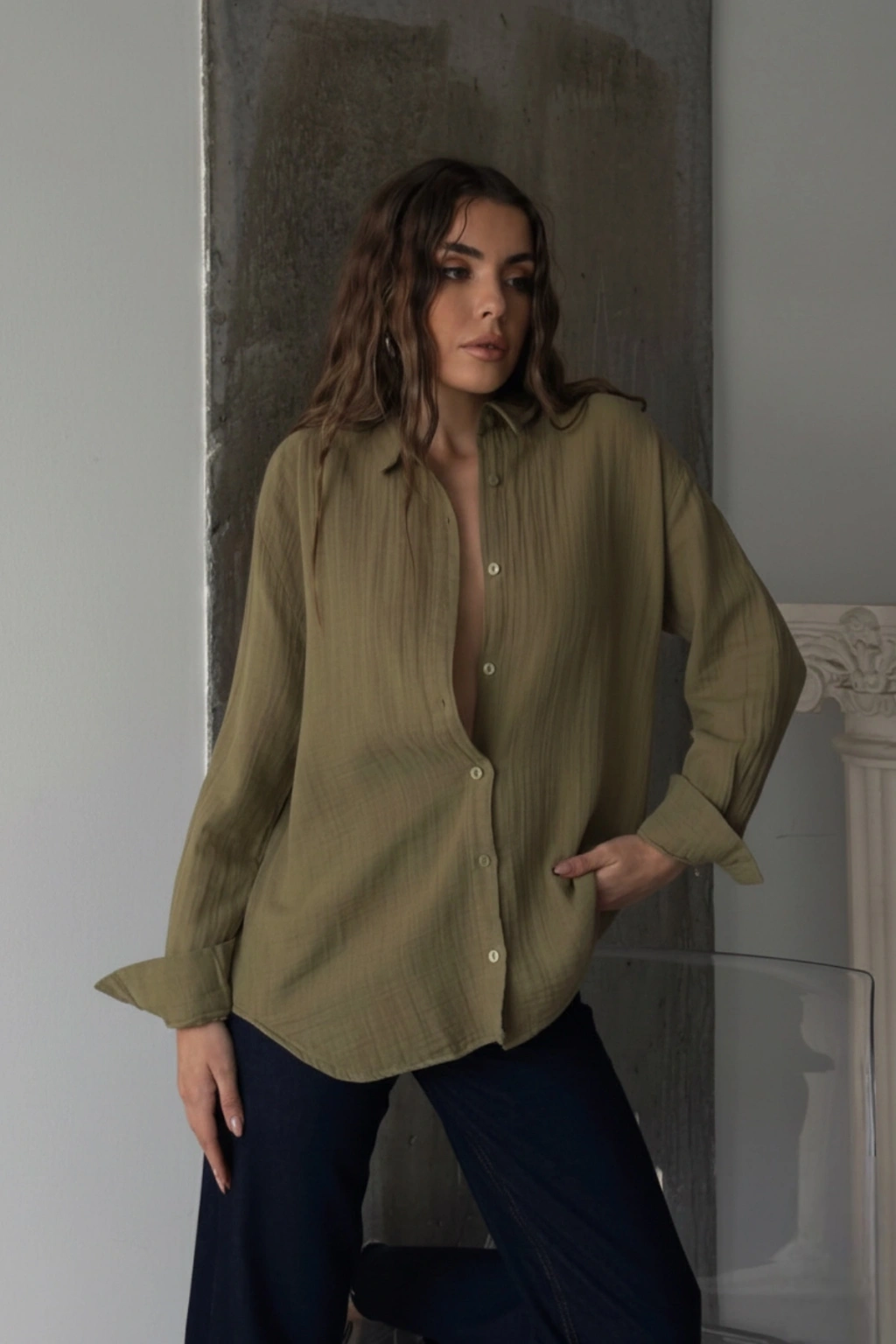 Kadın Haki Müslin Kumaş Premium Gömlek