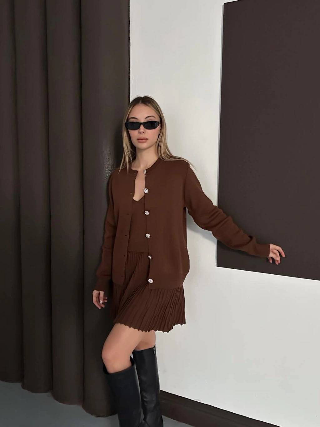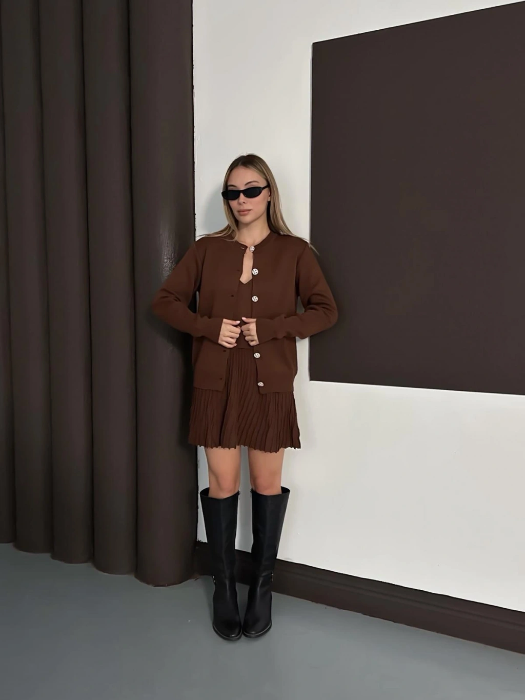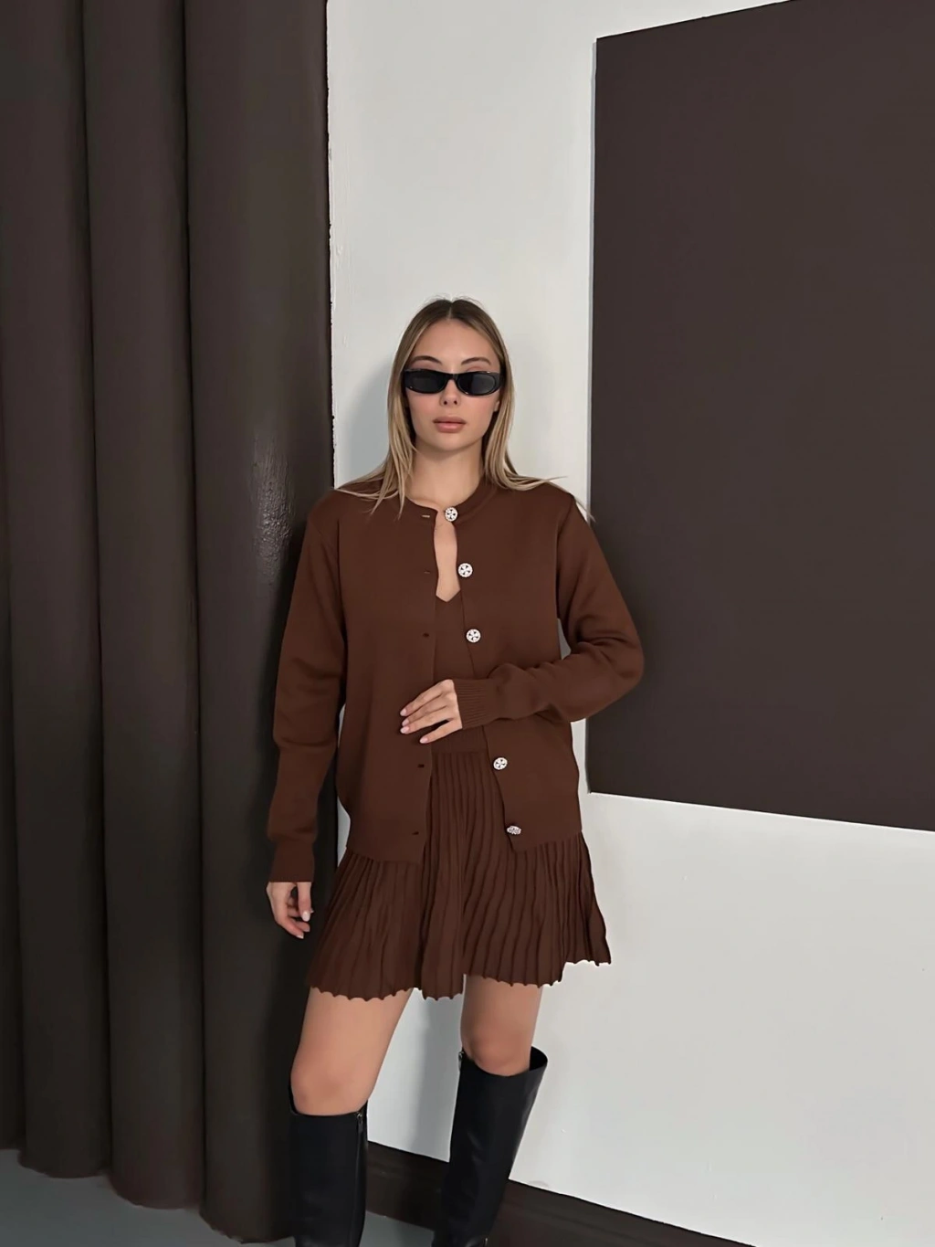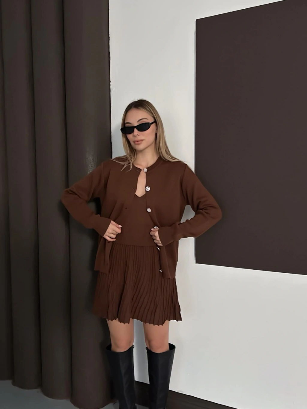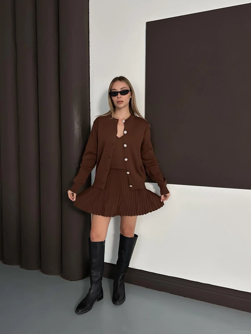 Kadın Kahverengi Hırka Crop Etek Üçlü Triko Takım