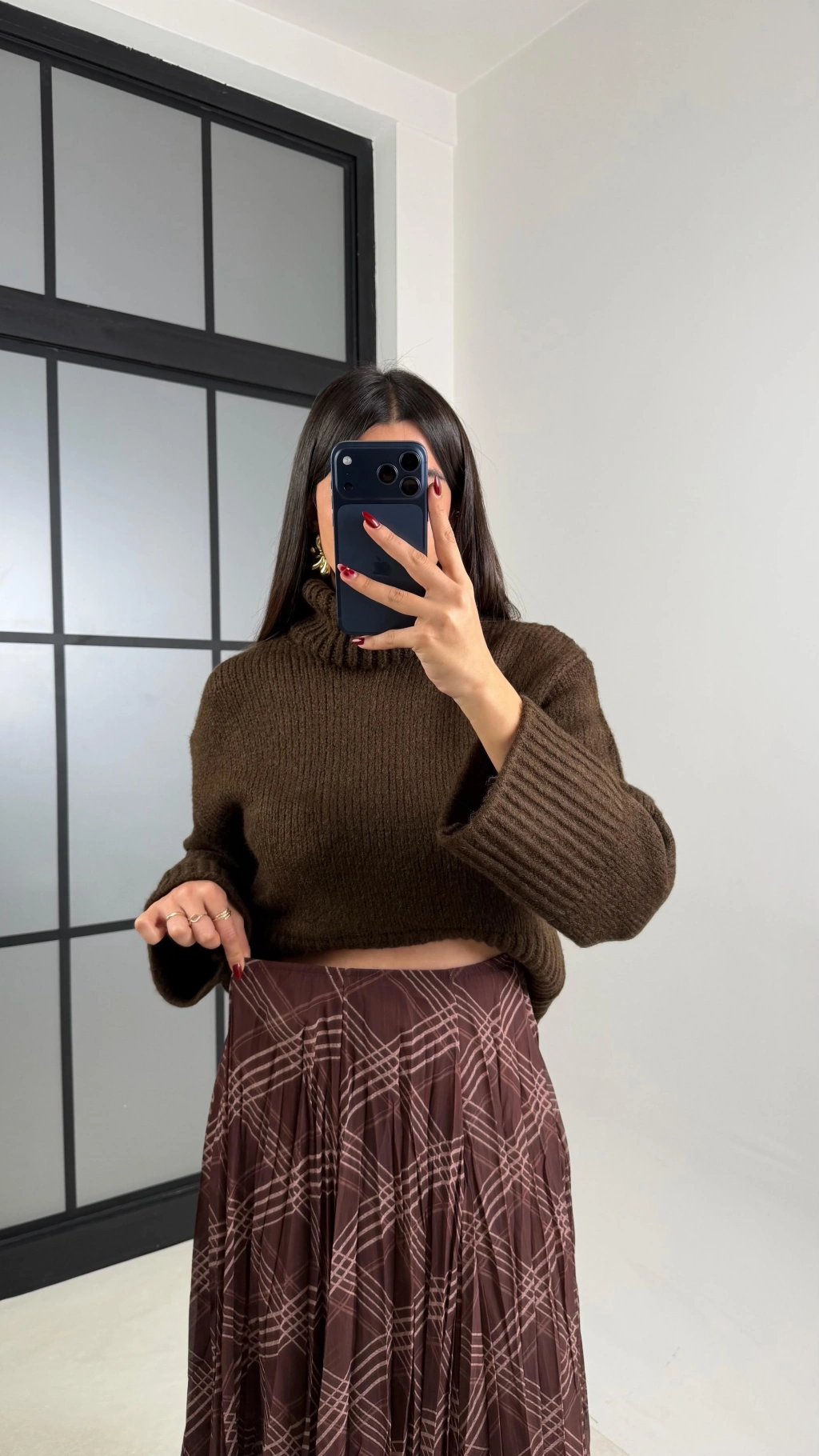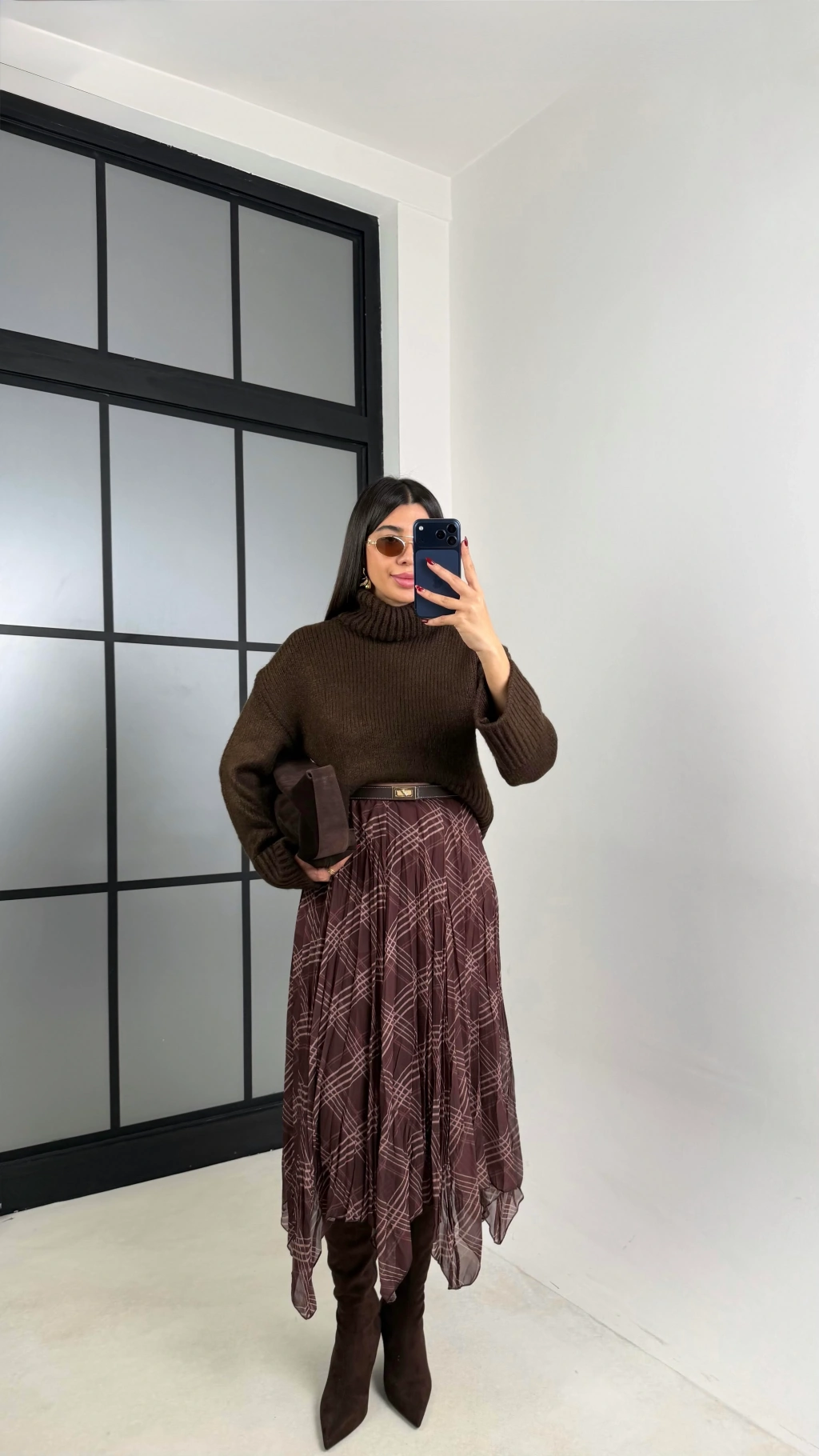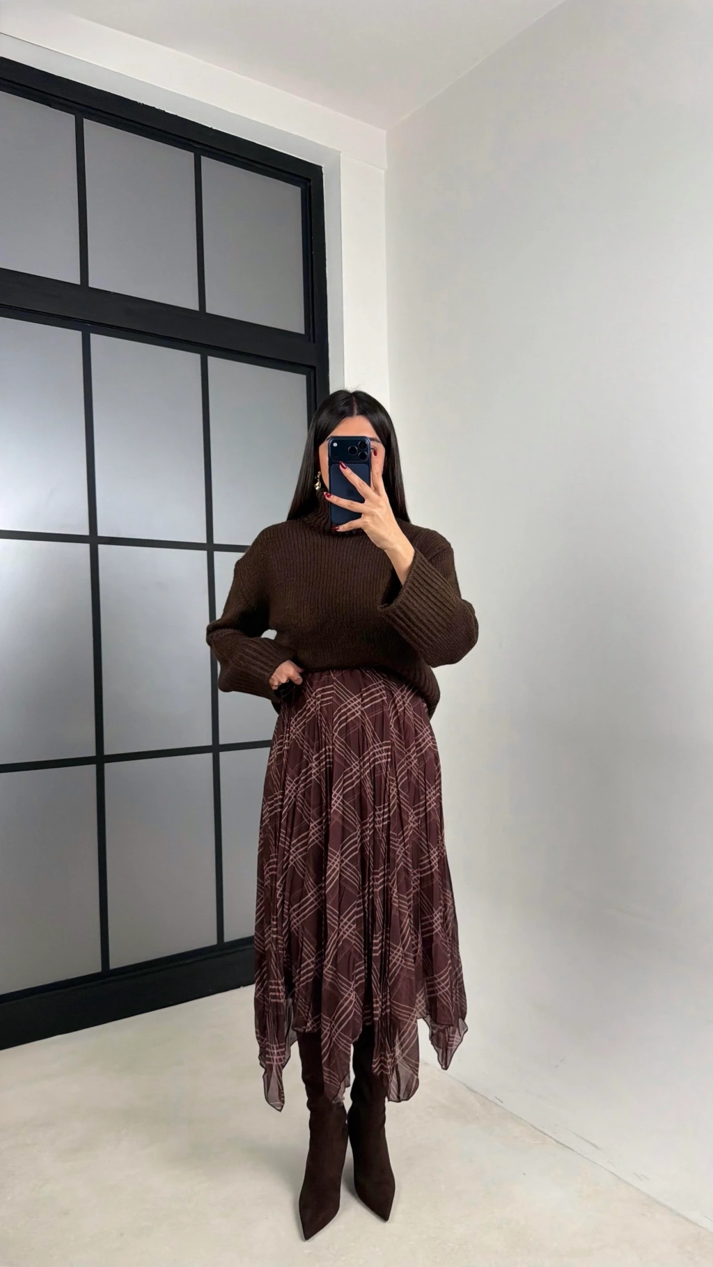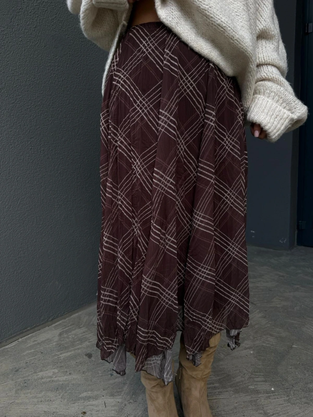 Kadın Kahverengi Astarlı Ekose Desenli Şifon Etek