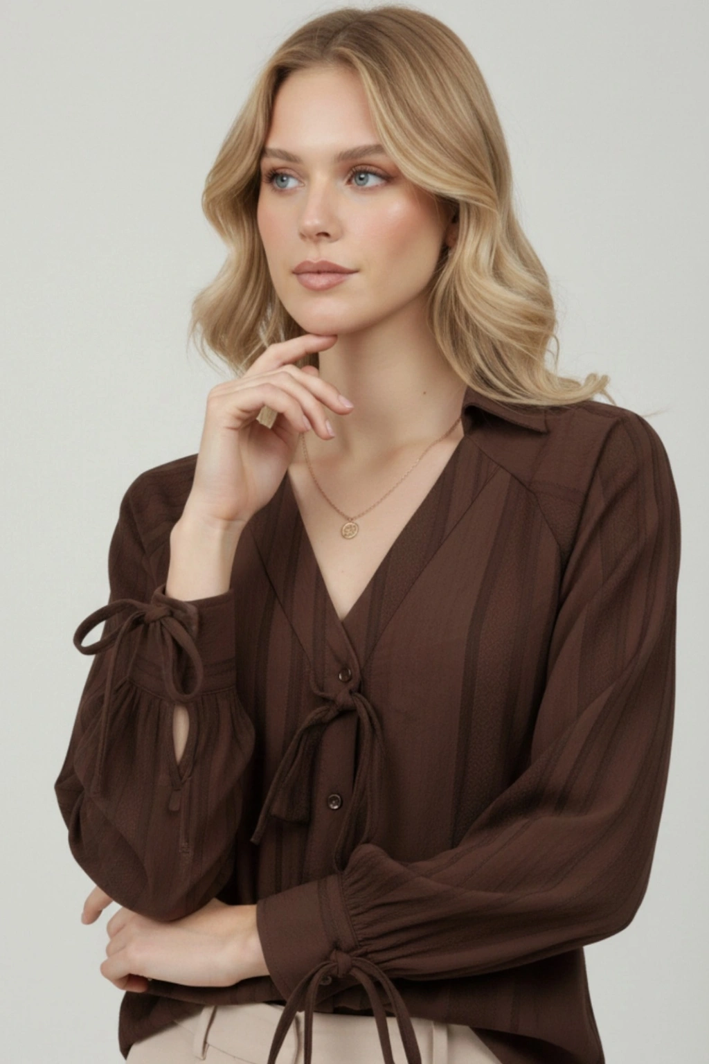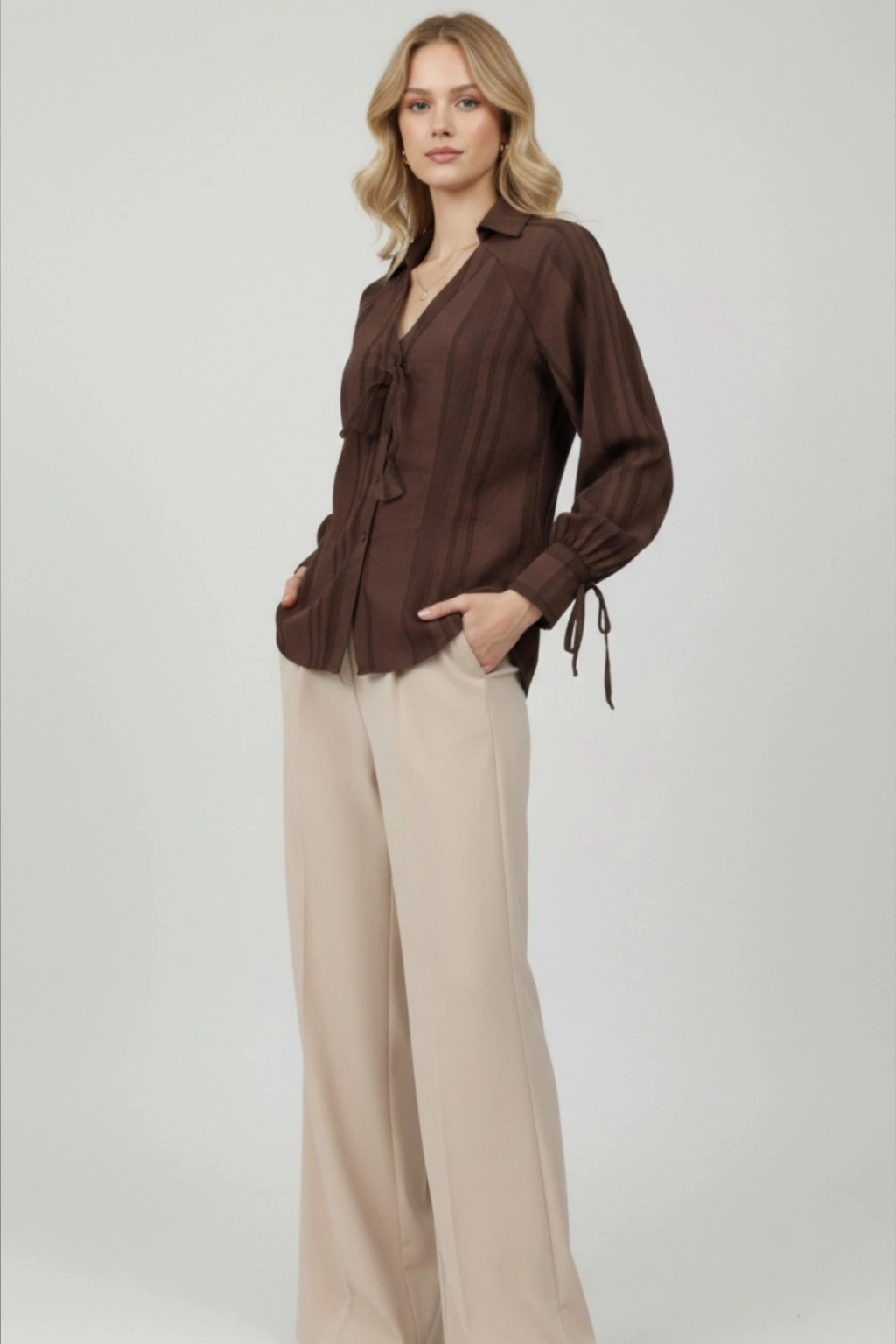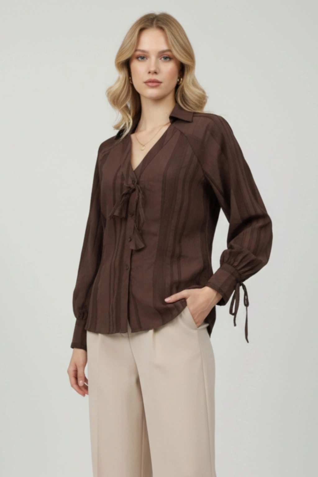 Kadın Kahverengi Fiyonk ve Detaylı Şık Gömlek