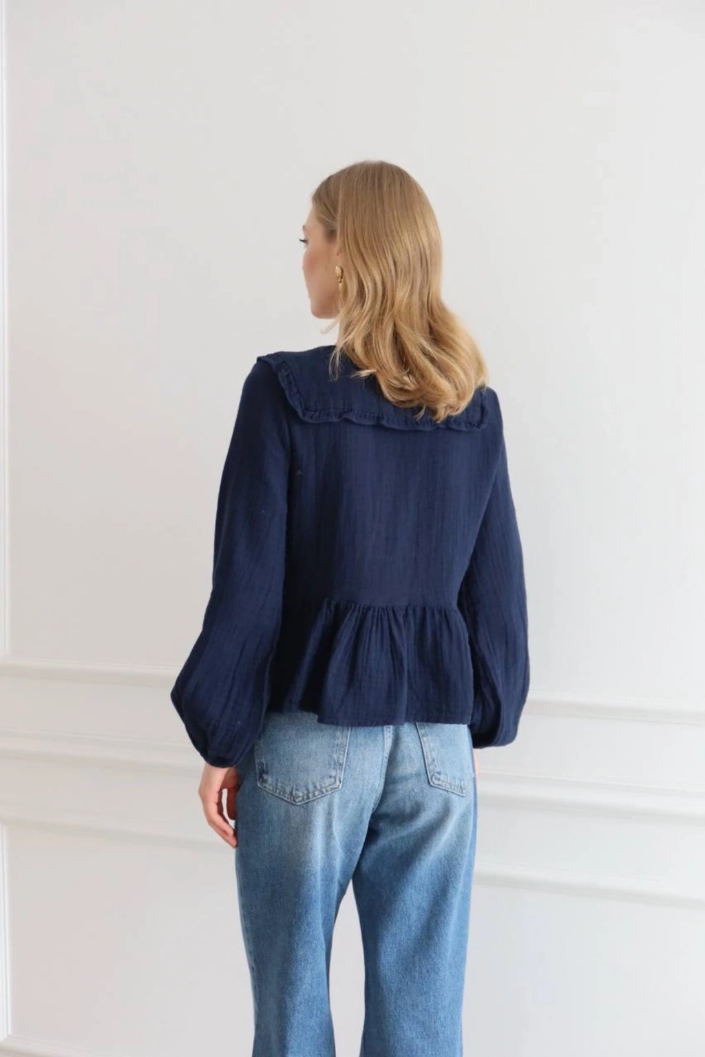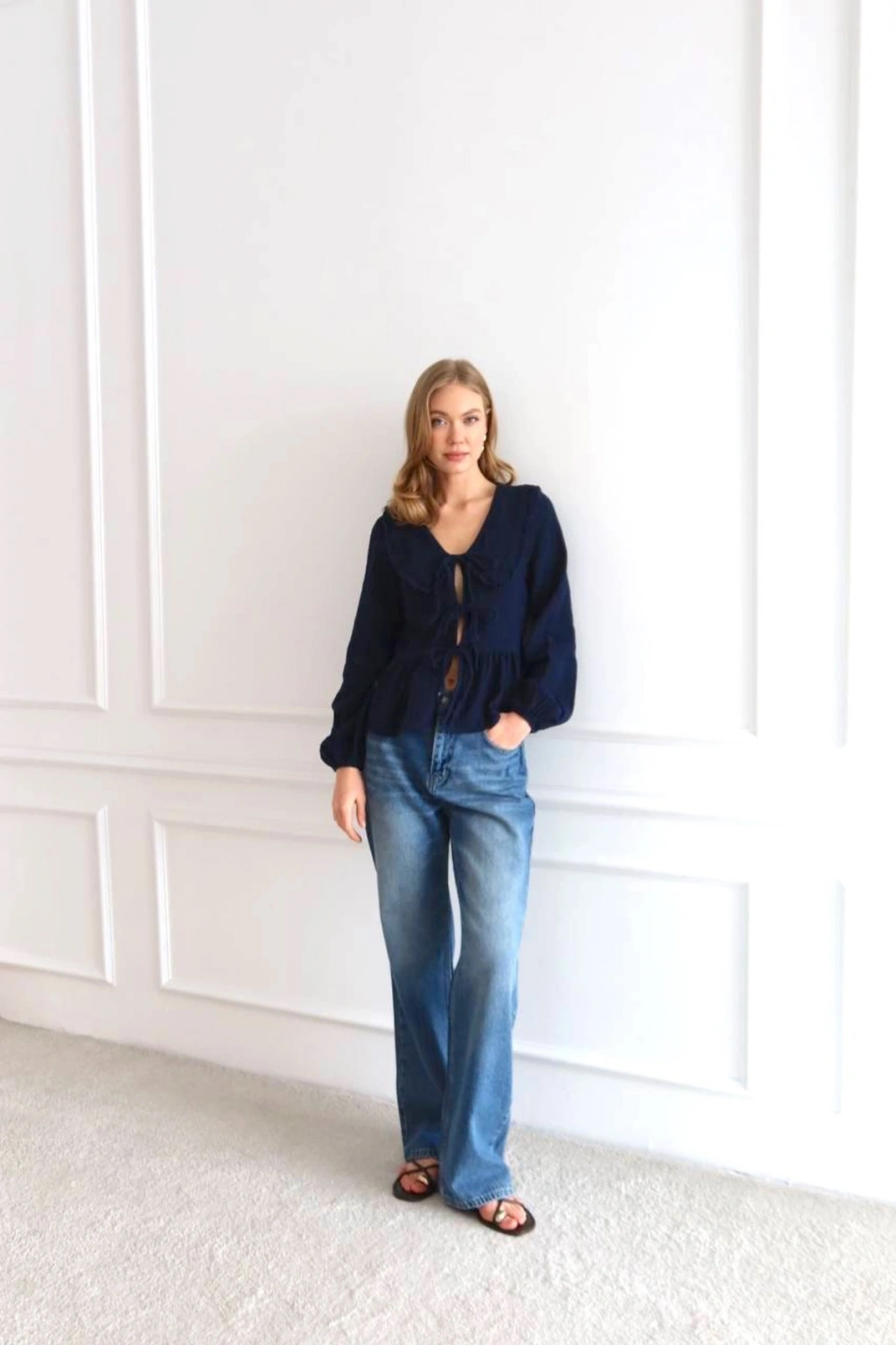 Kadın Lacivert Bohem Tarz Önden Bağlamalı Bebe Yaka Uzun Kol Müslin Bluz