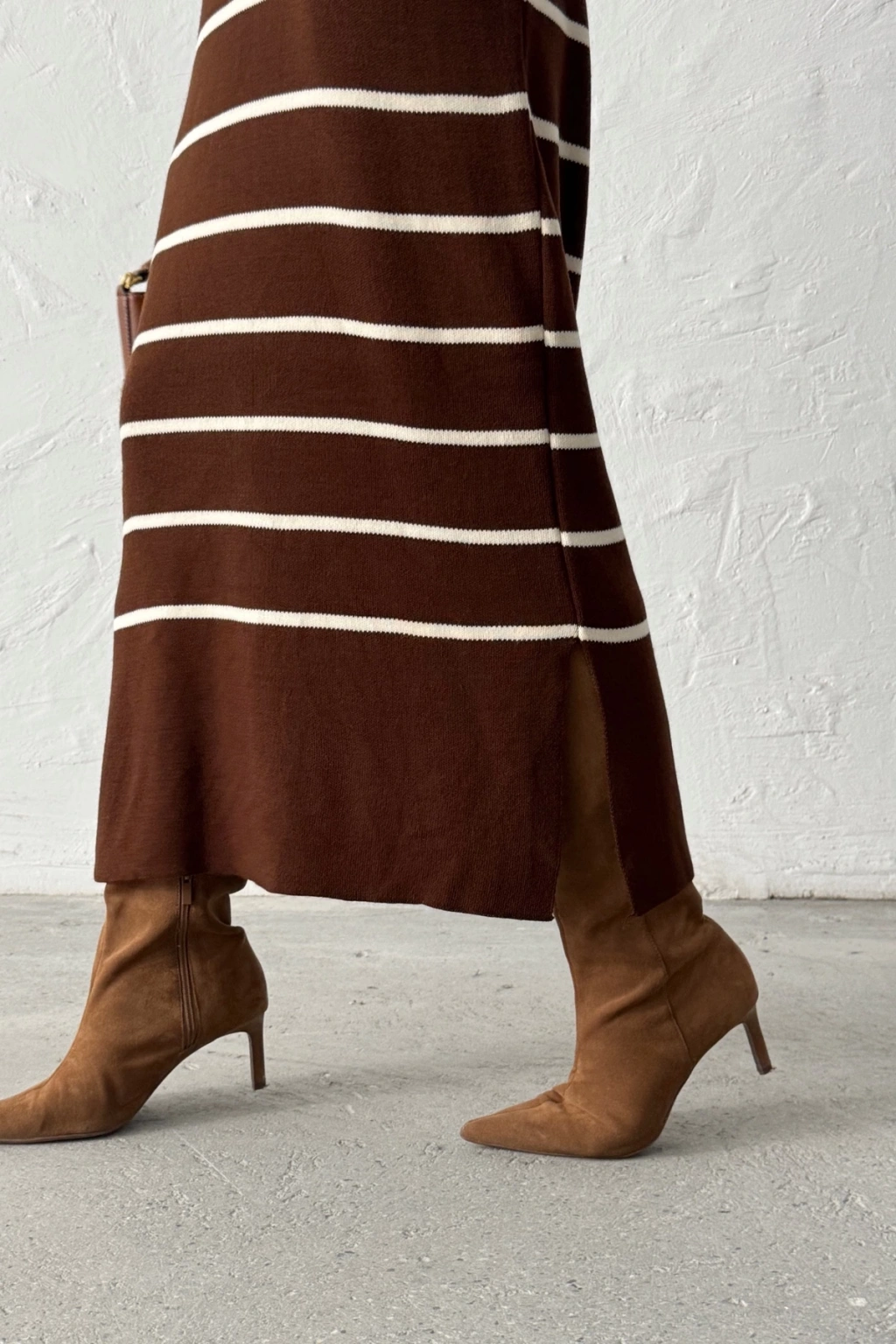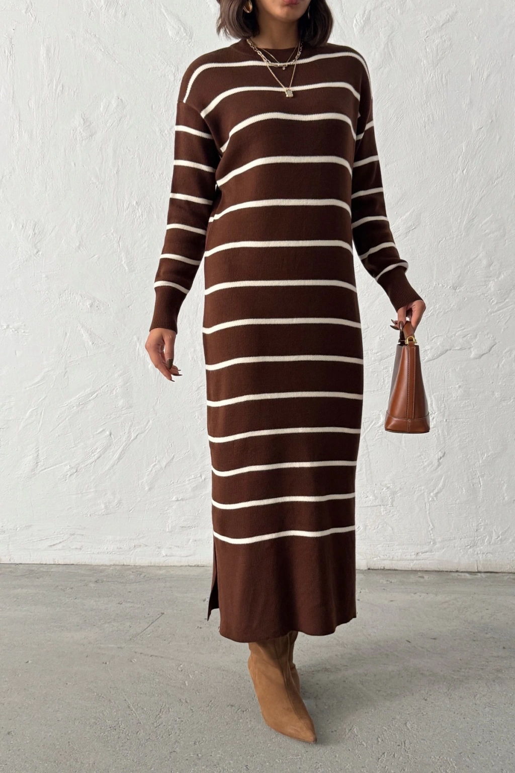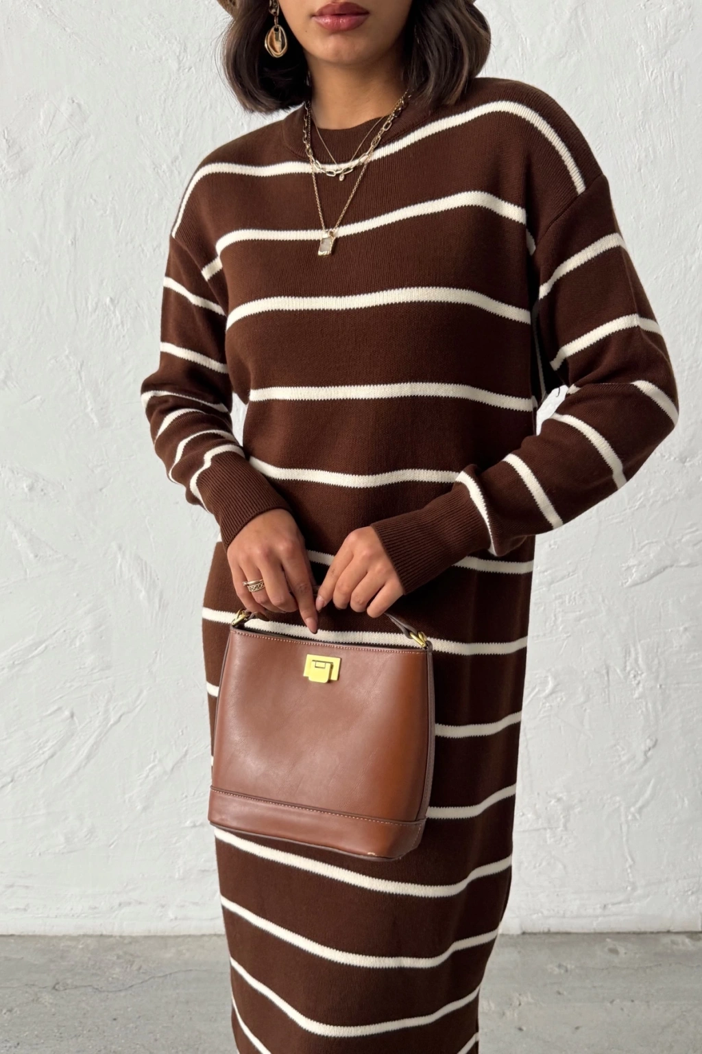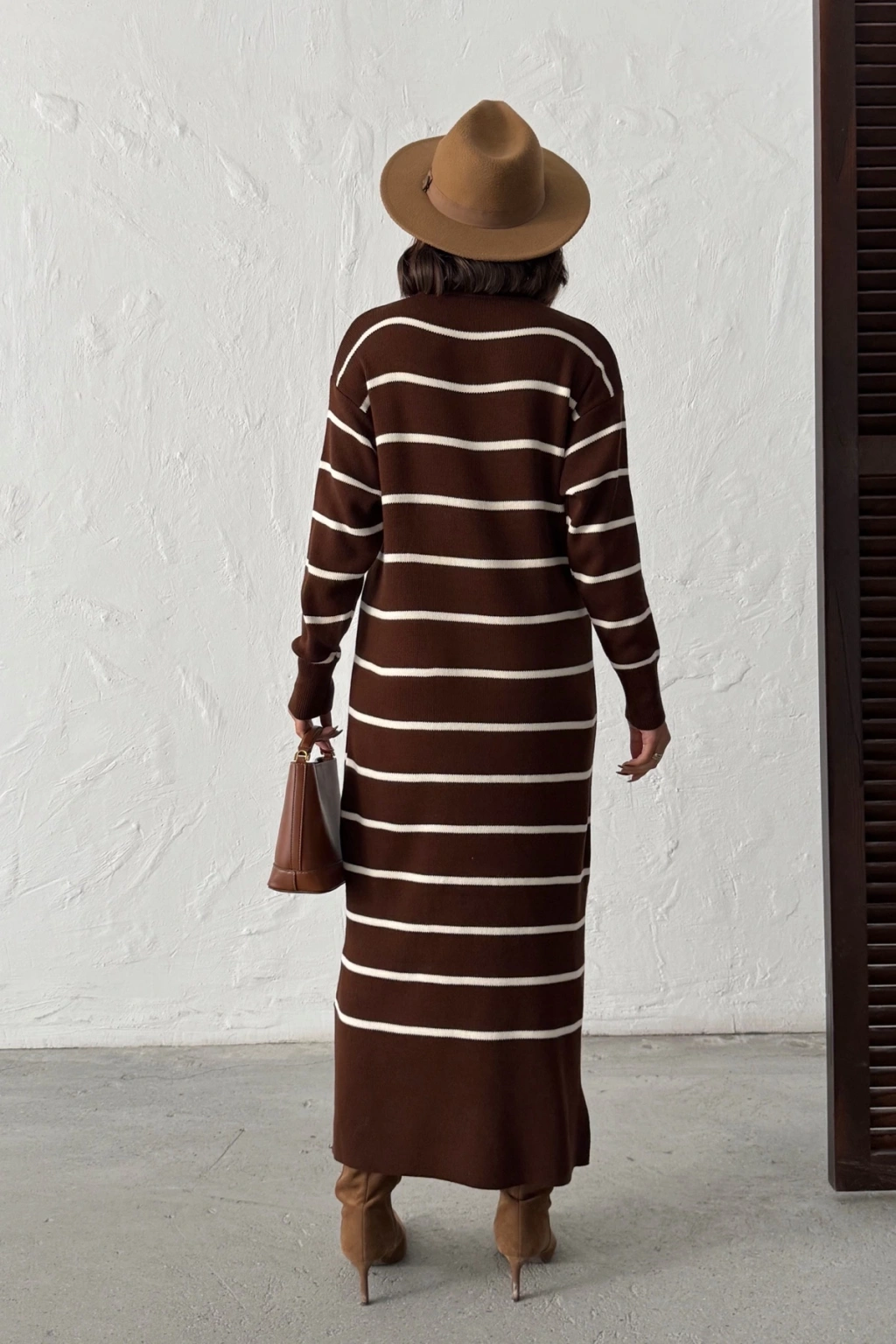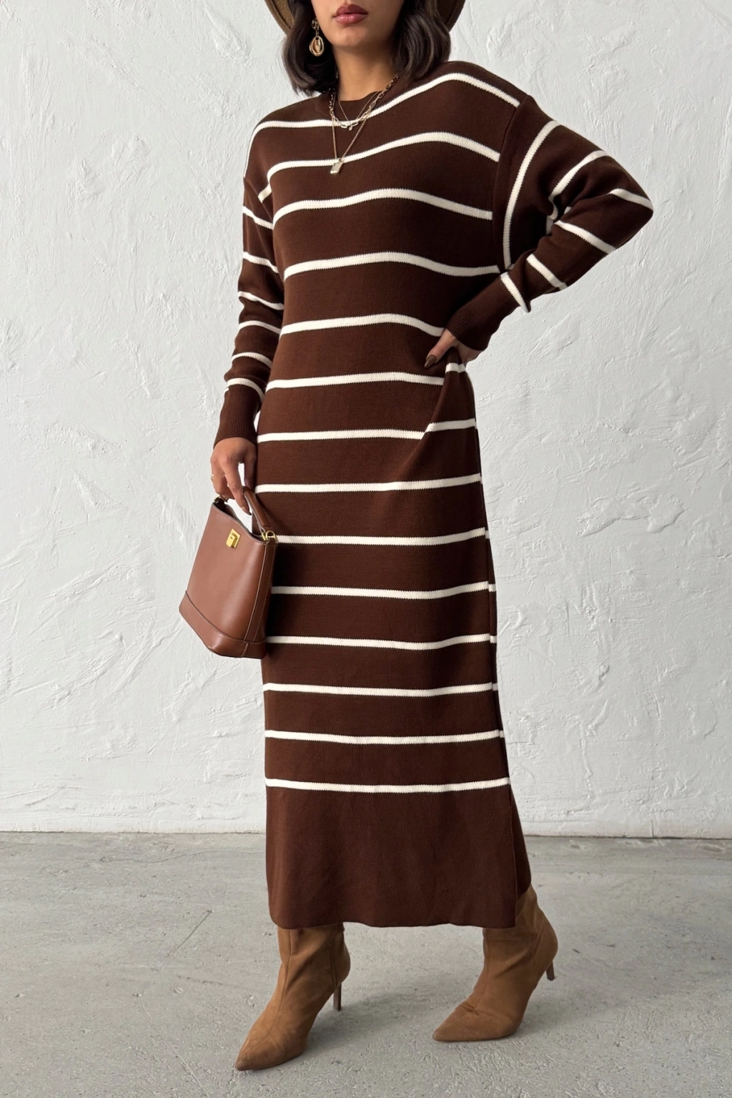 Kadın Kahverengi Çizgili Uzun Kol Triko Elbise (Yeni Renk)