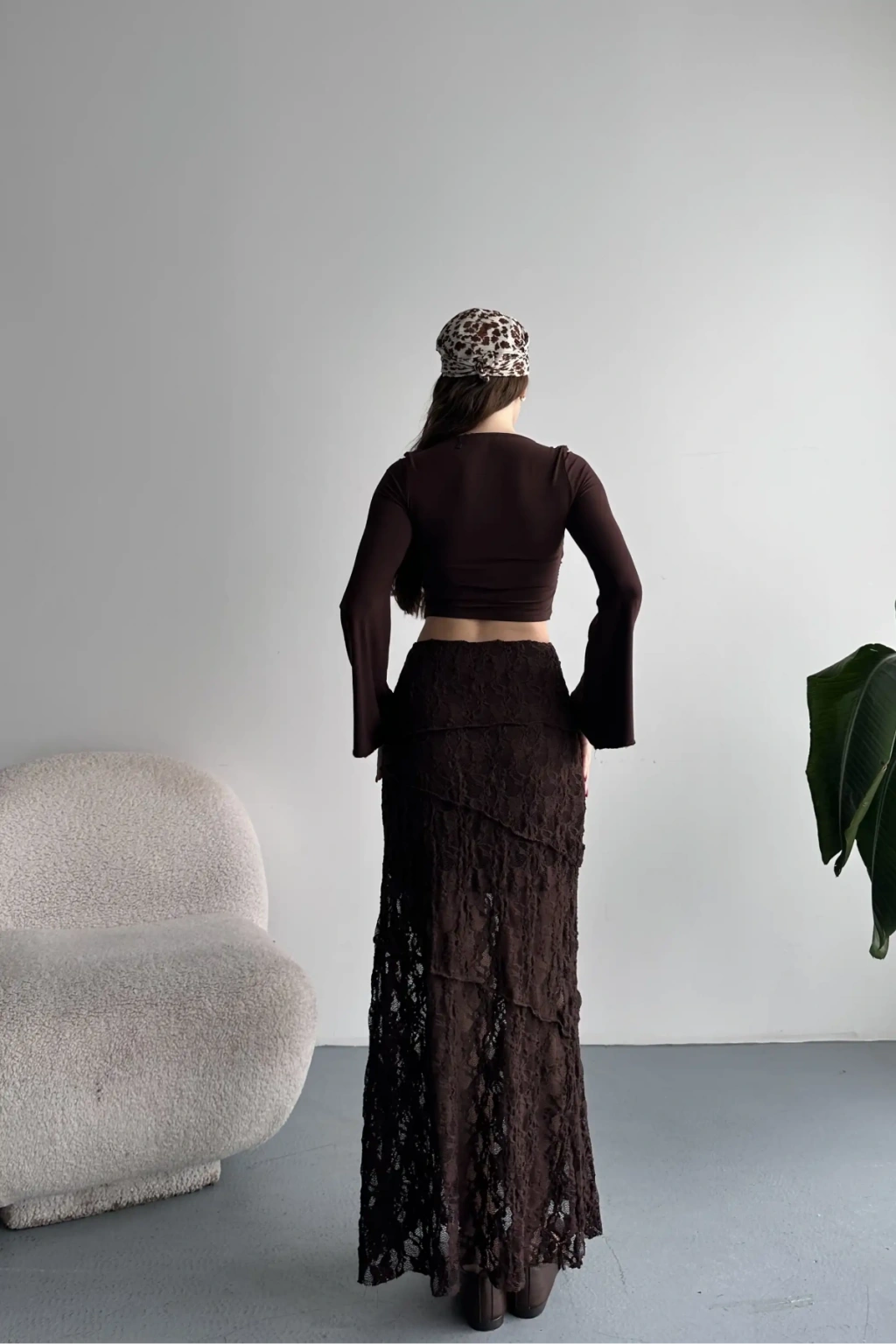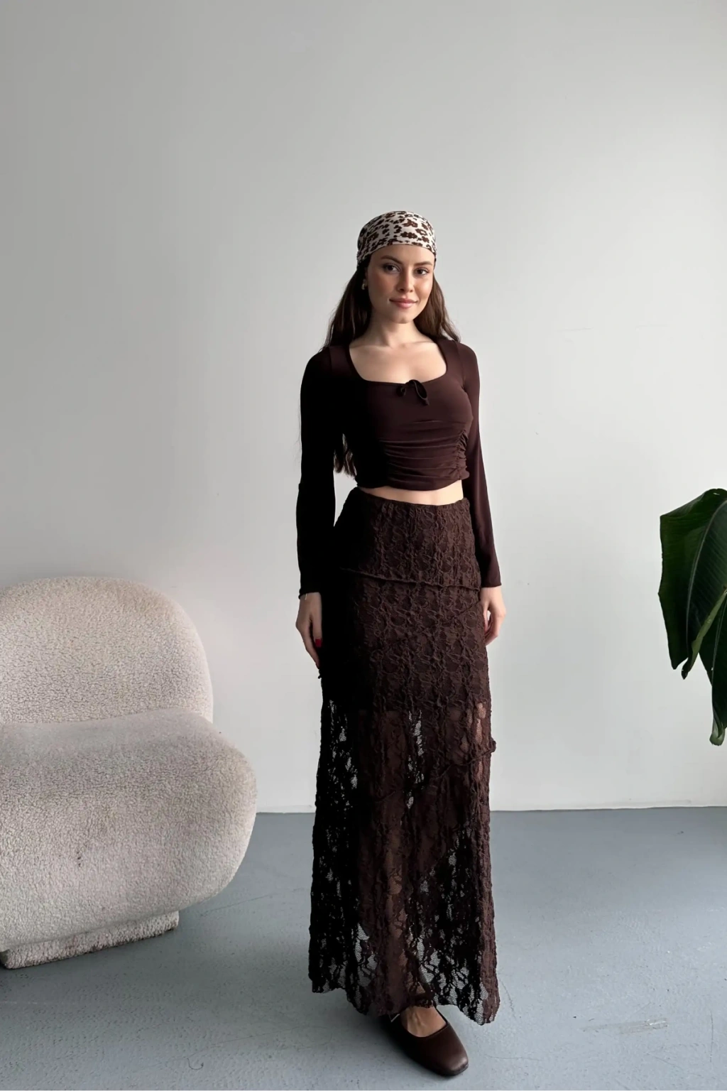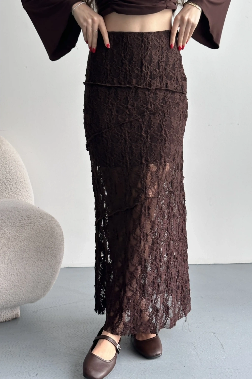 Kadın Kahverengi Dantel Detaylı Yırtmaçlı Yüksek Bel Uzun Etek