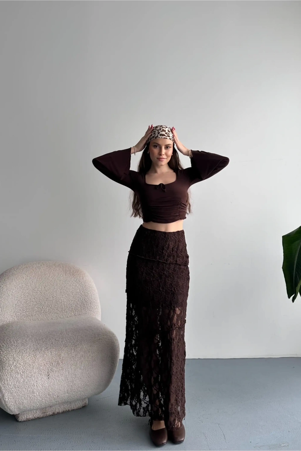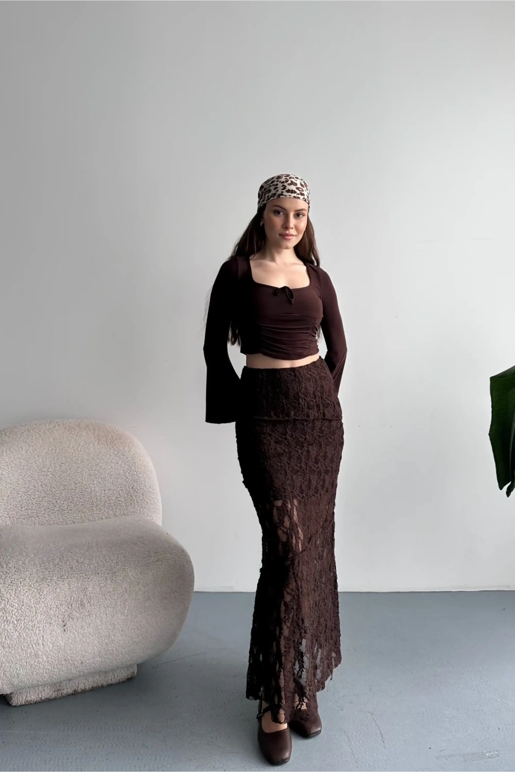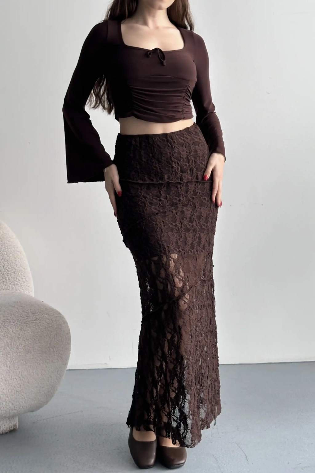 Kadın Kahverengi Dantel Detaylı Yırtmaçlı Yüksek Bel Uzun Etek