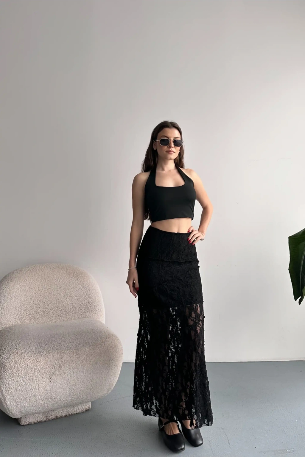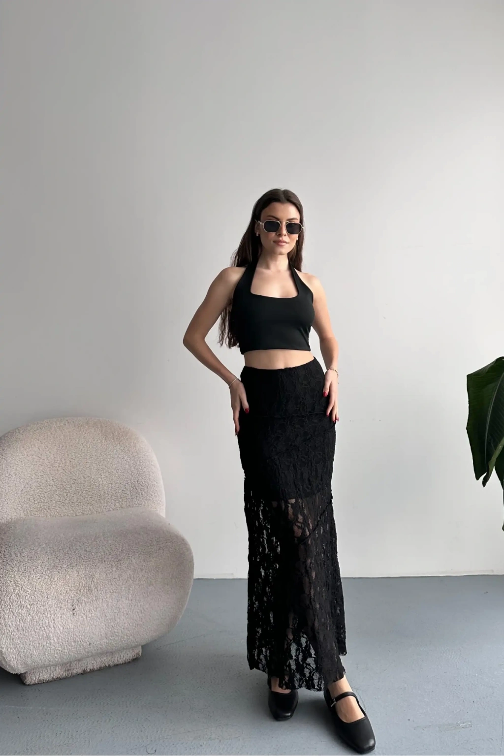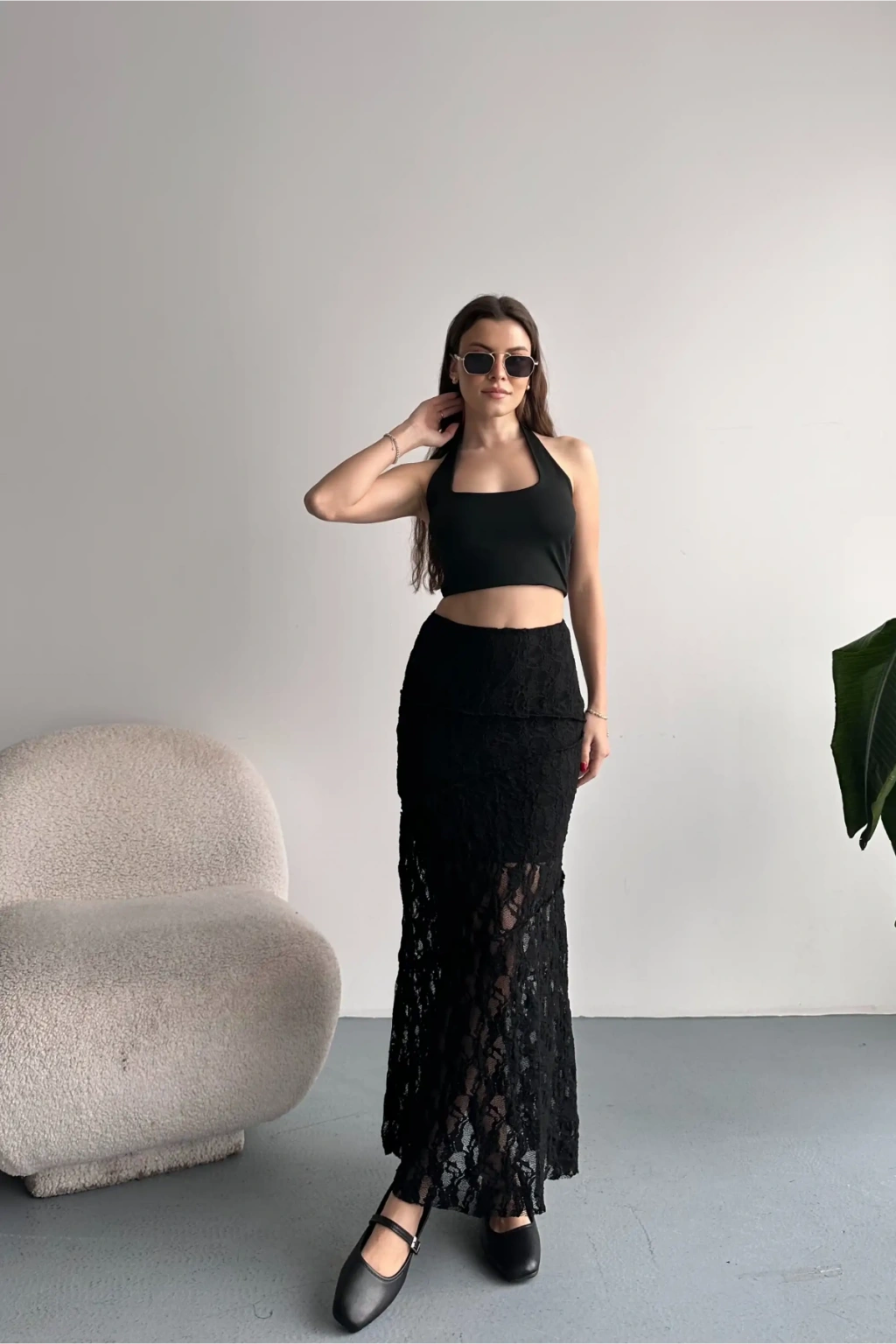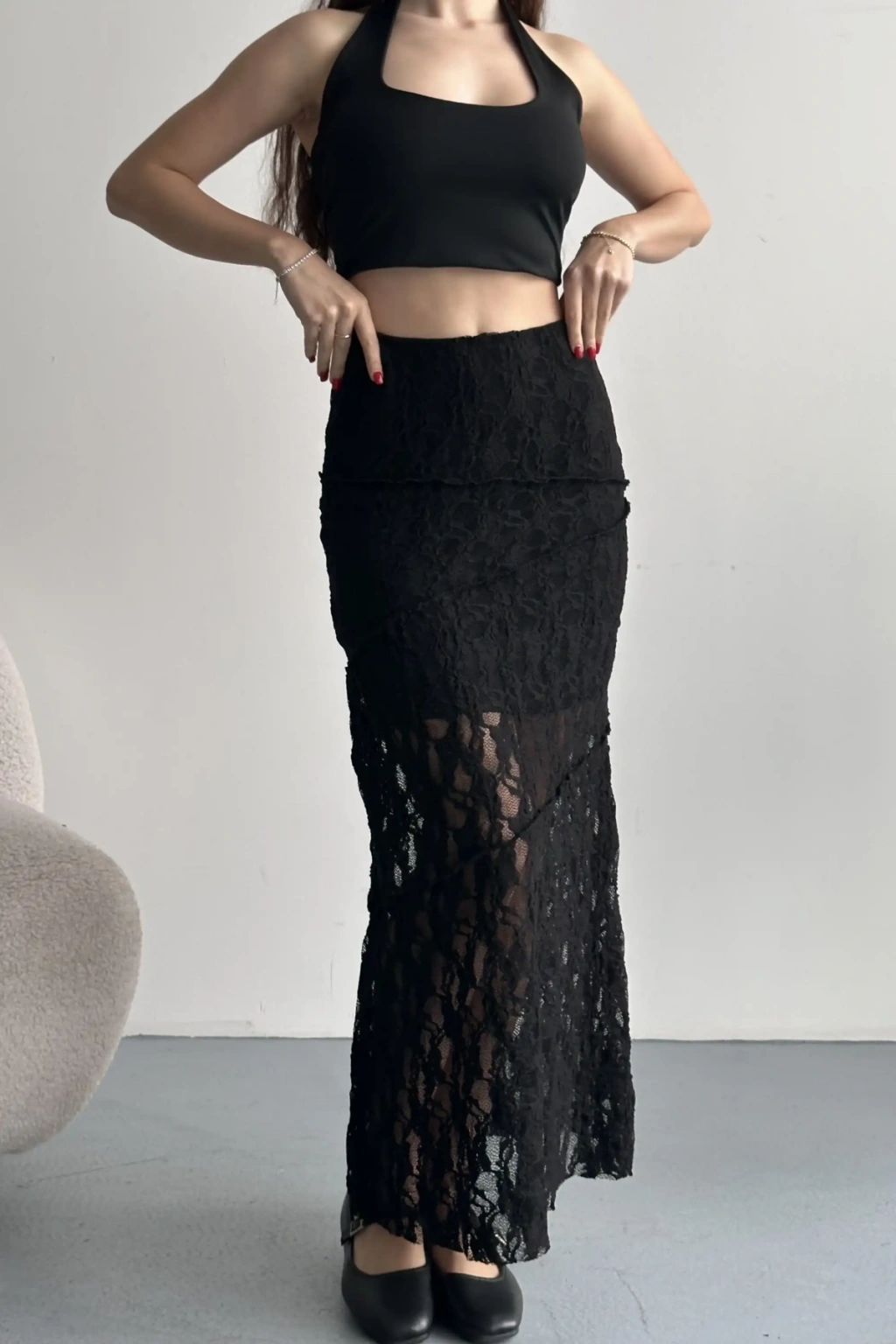 Kadın Siyah Dantel Detaylı Yüksek Bel Astarlı Uzun Yazlık Zarif Etek