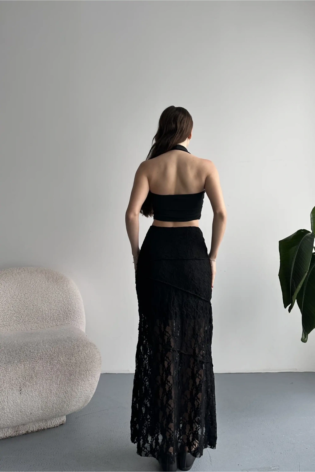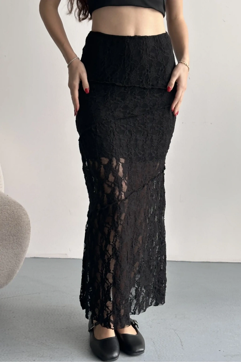 Kadın Siyah Dantel Detaylı Yırtmaçlı Yüksek Bel Uzun Etek