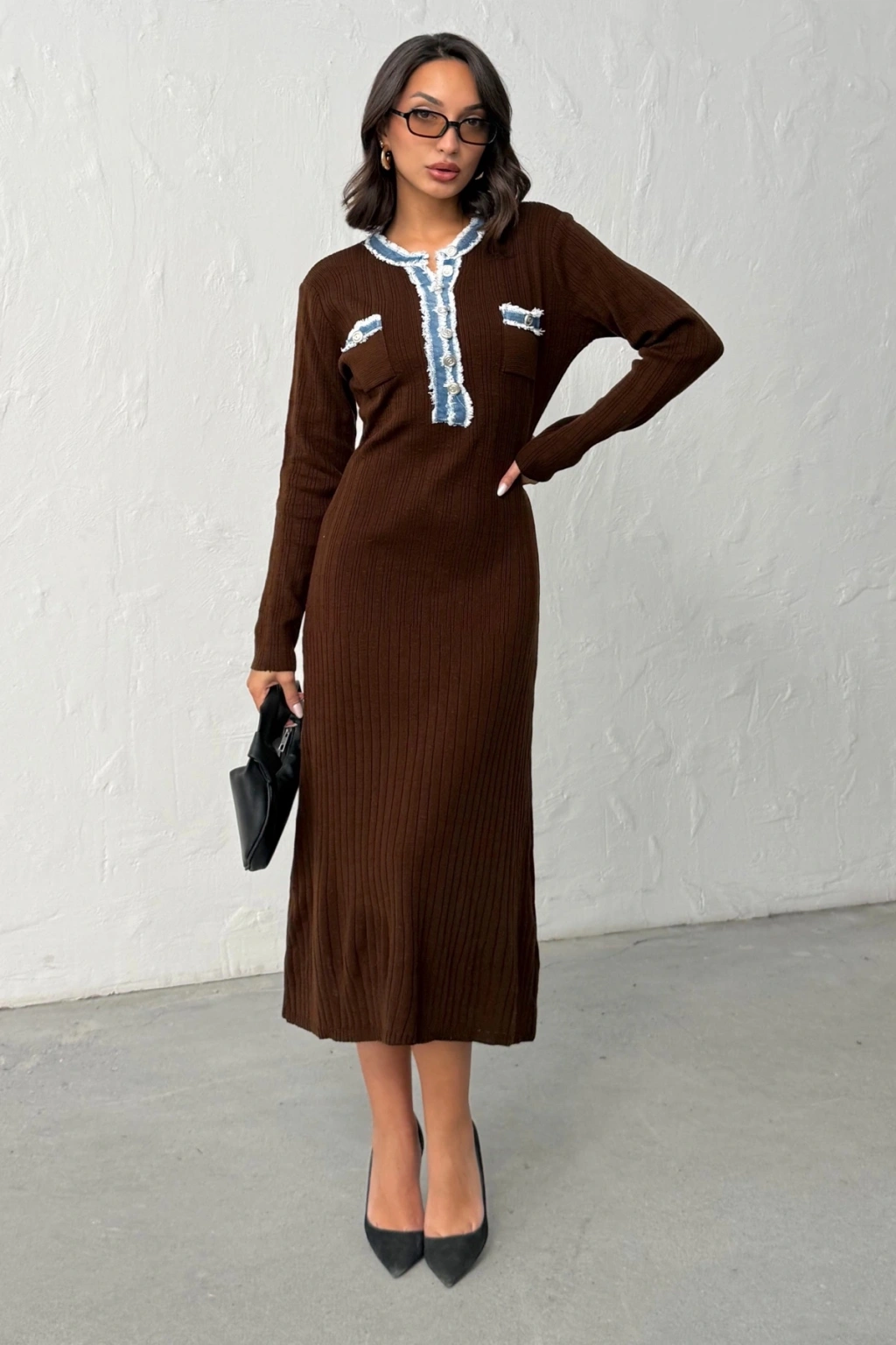 Kadın Kahverengi Düğmeli Jean Detaylı Triko Elbise