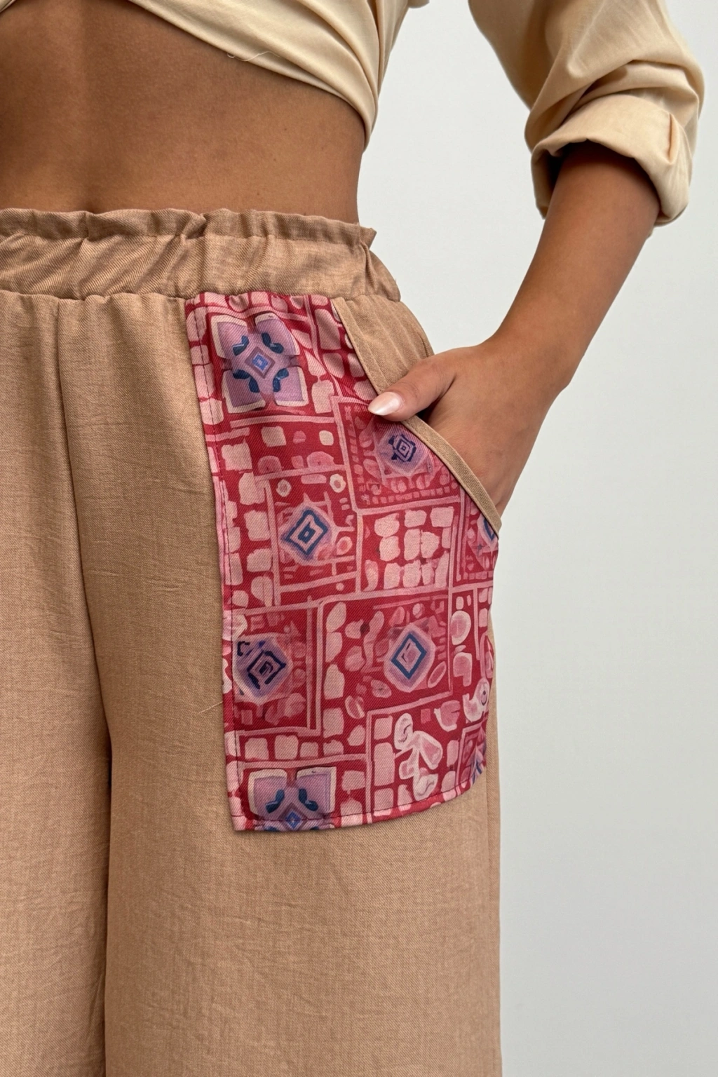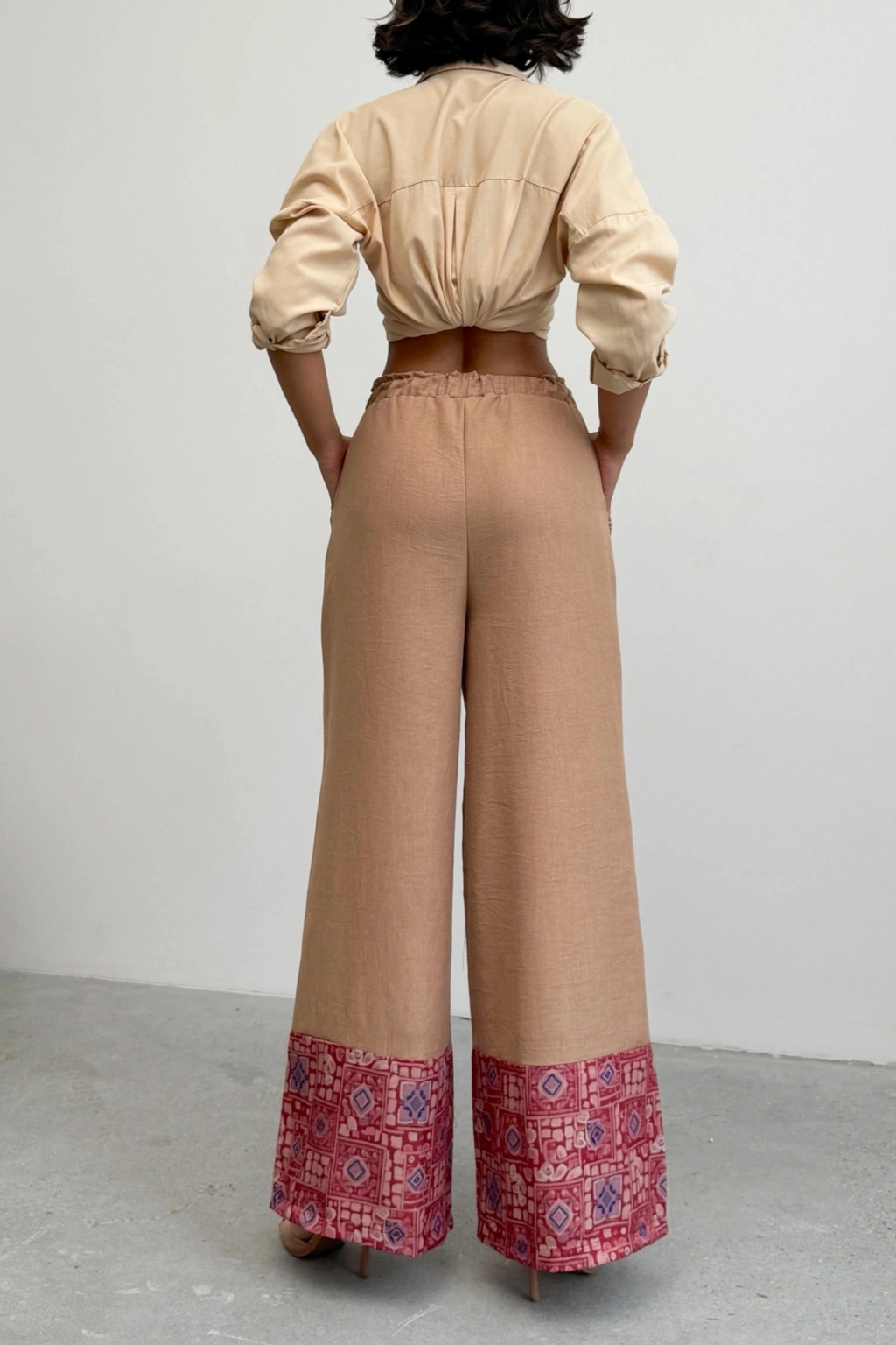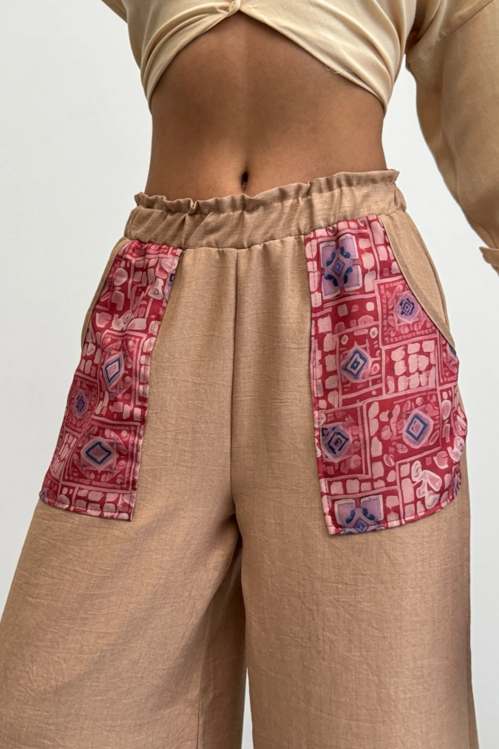 Kadın Bej Etnik Desenli Sofya Keten Pantolon