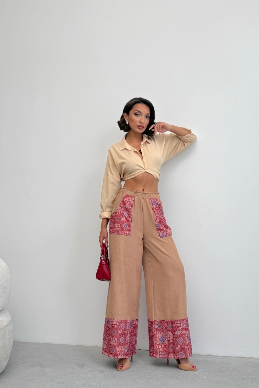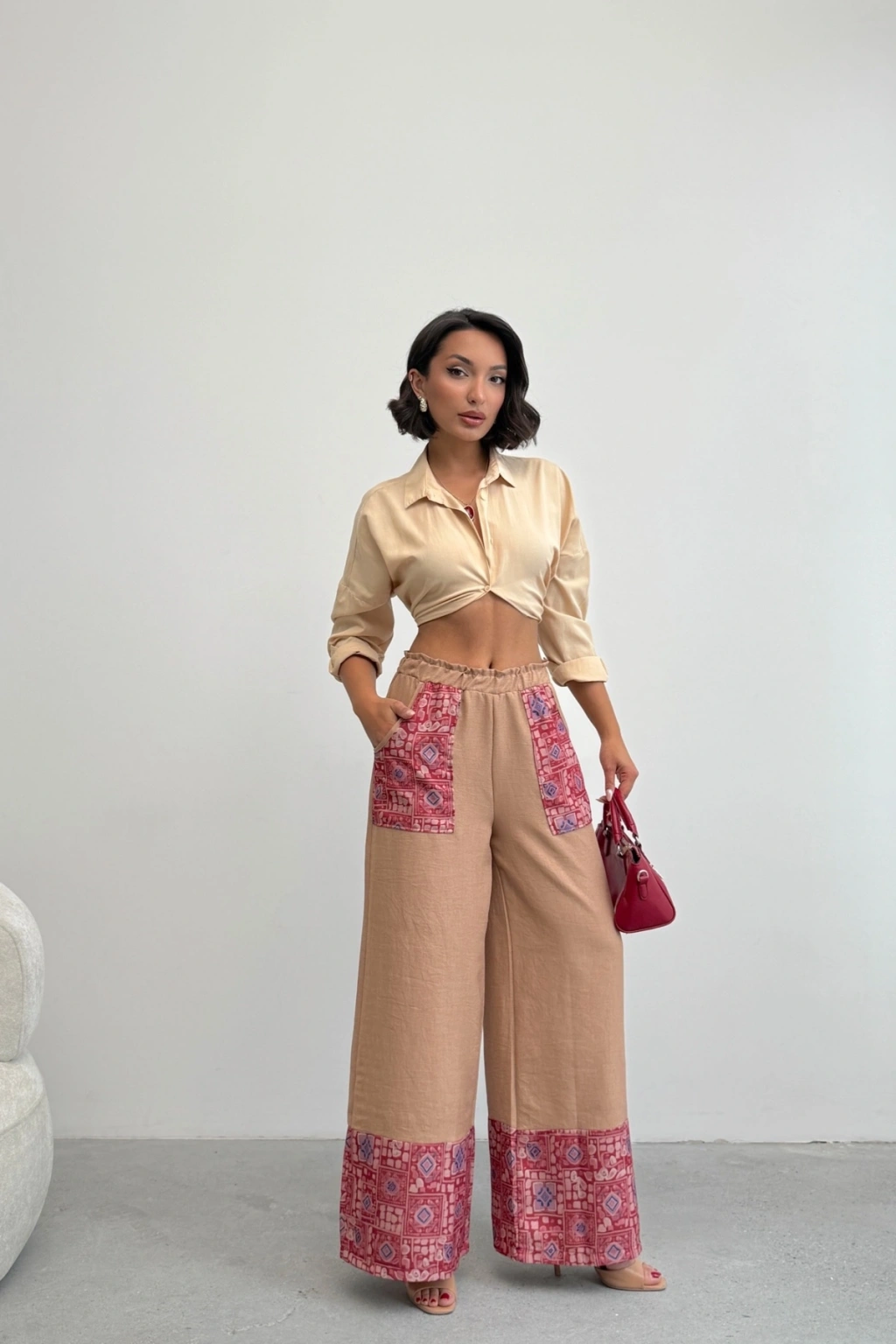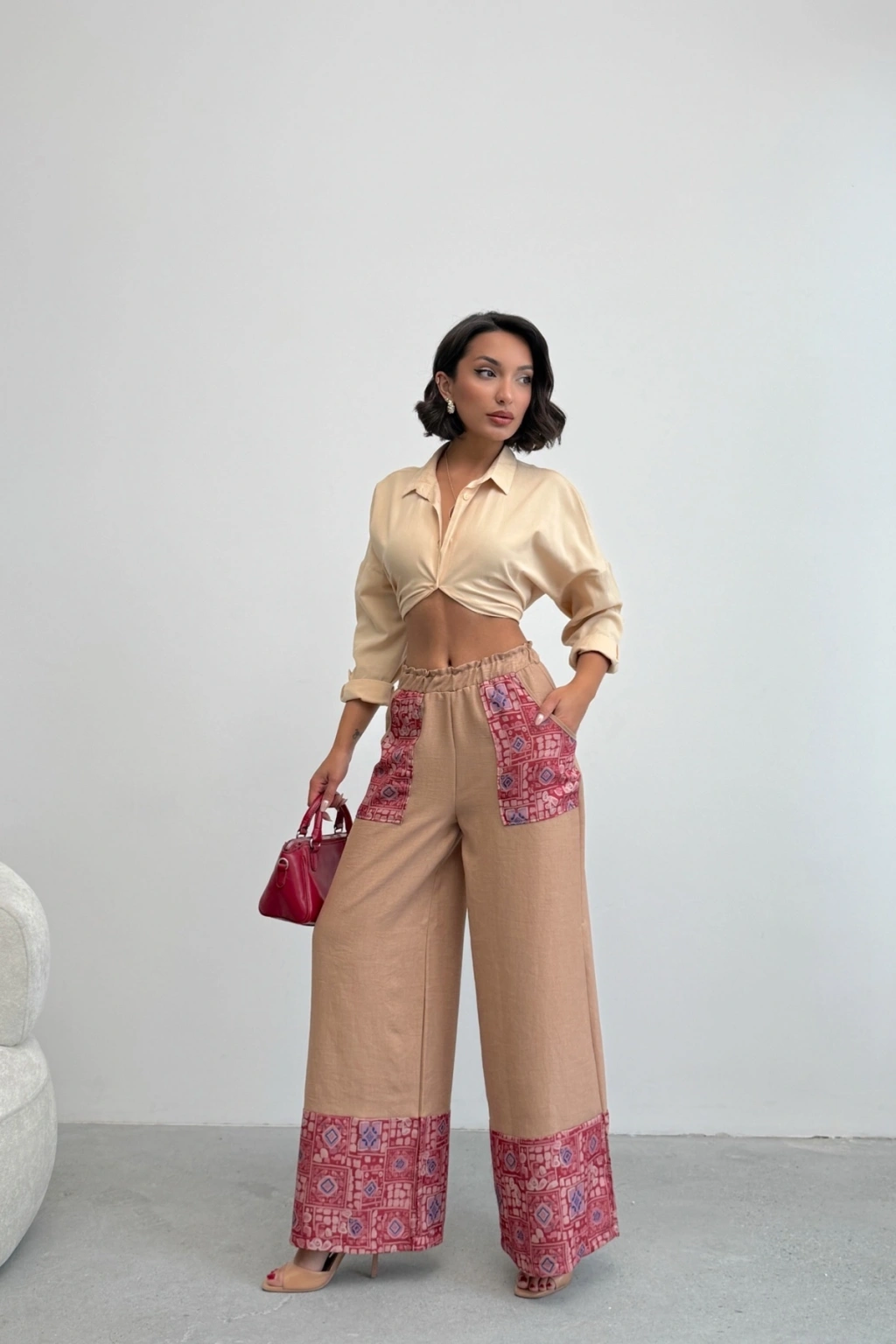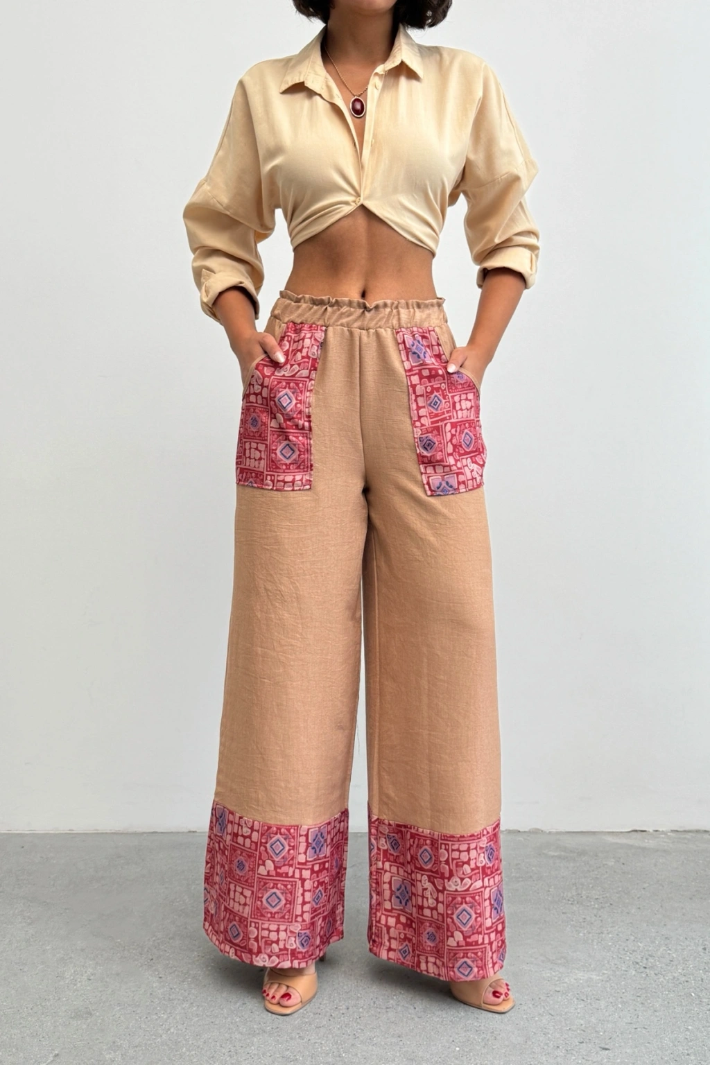 Kadın Bej Etnik Desenli Sofya Keten Pantolon