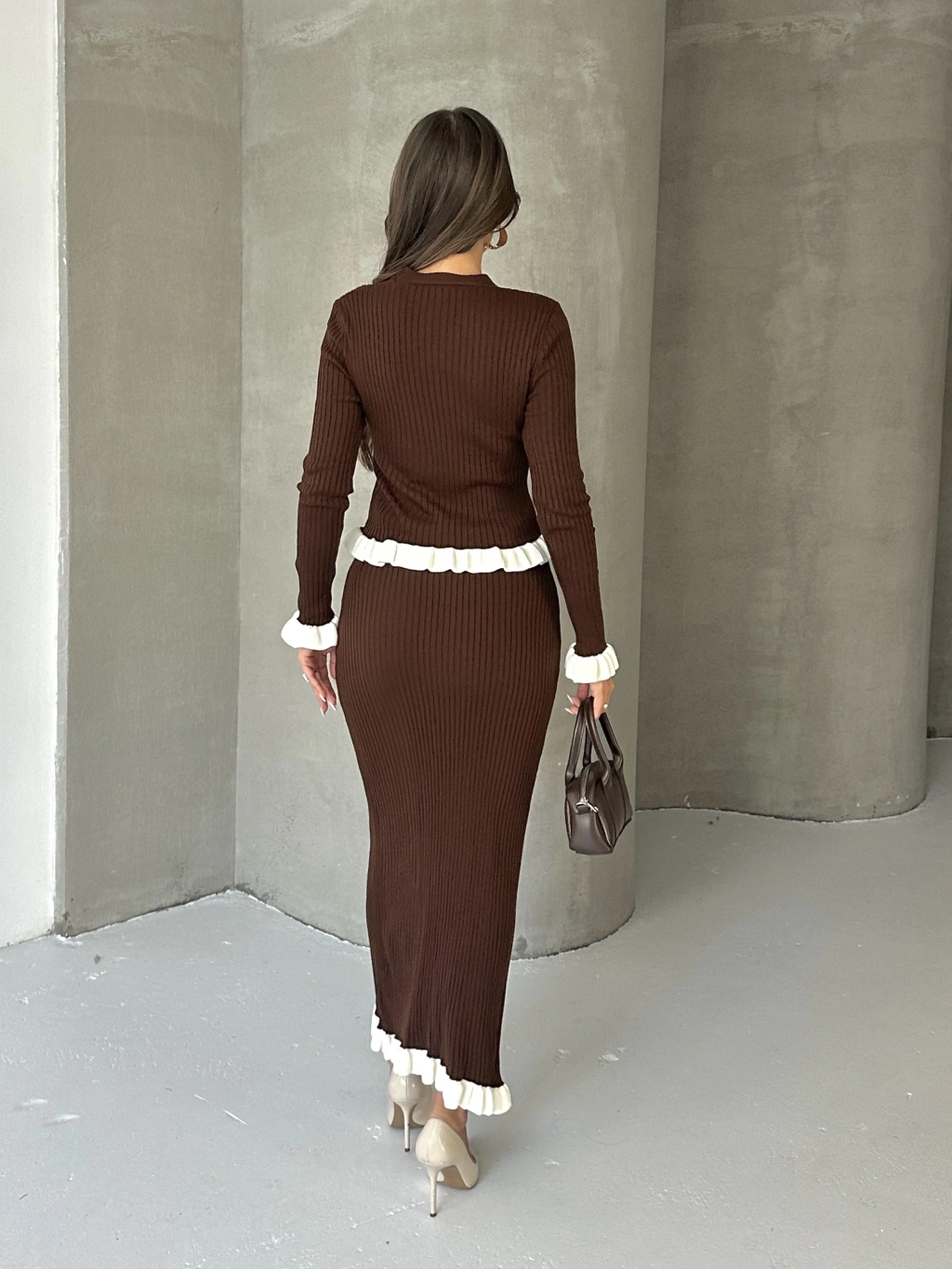 Kadın Kahverengi Fitilli Fırfır Detaylı Etek Bluz Zarif Triko Takım (S Beden)