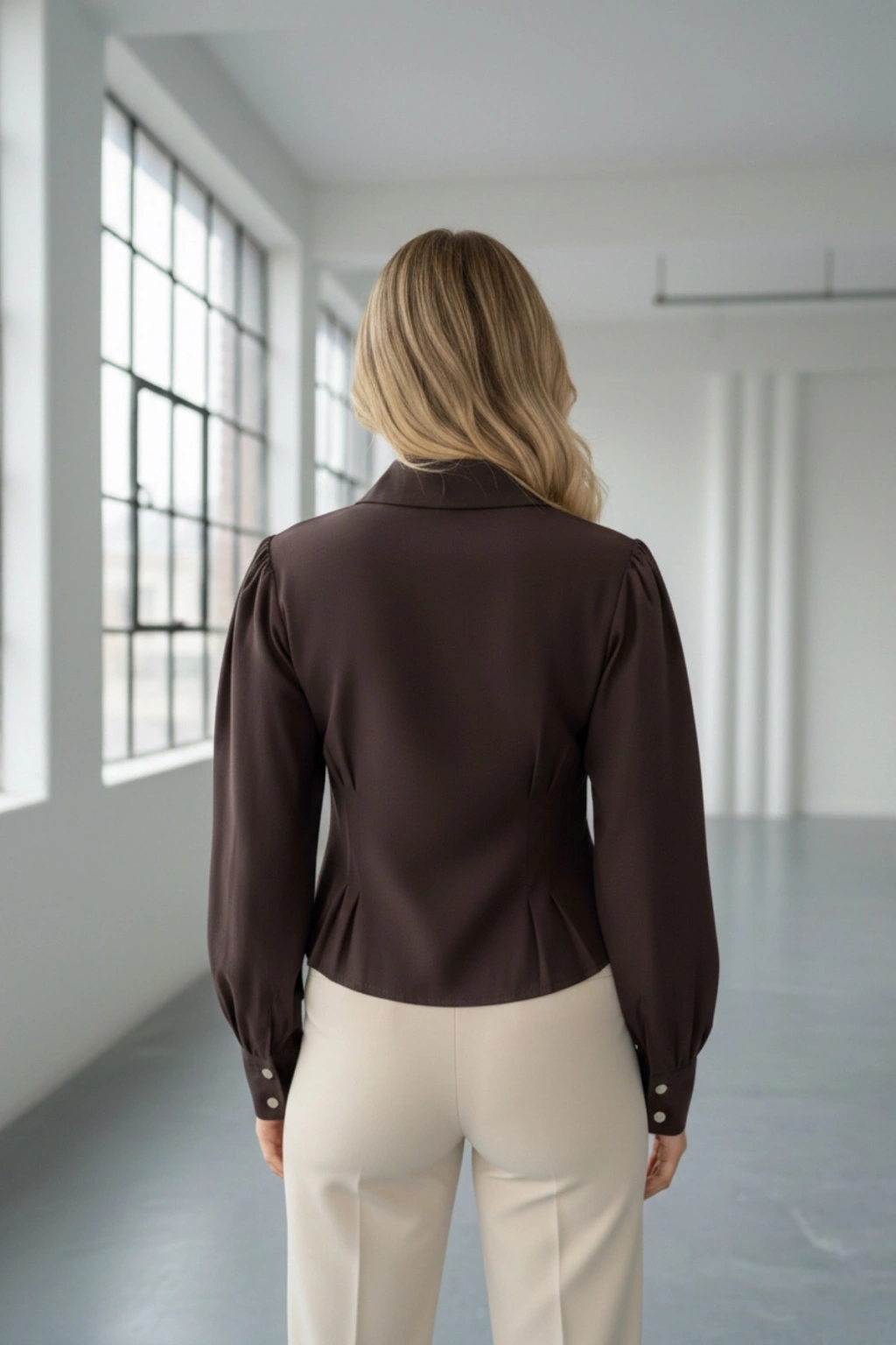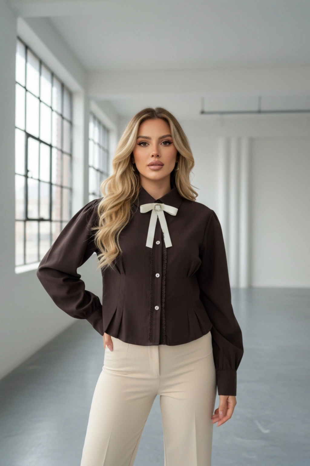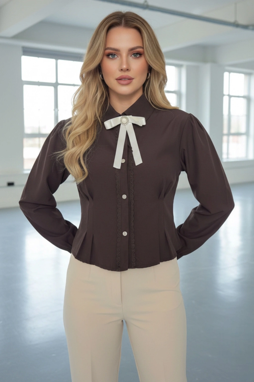 Kadın Kahverengi Fiyonk ve Detaylı Şık Gömlek