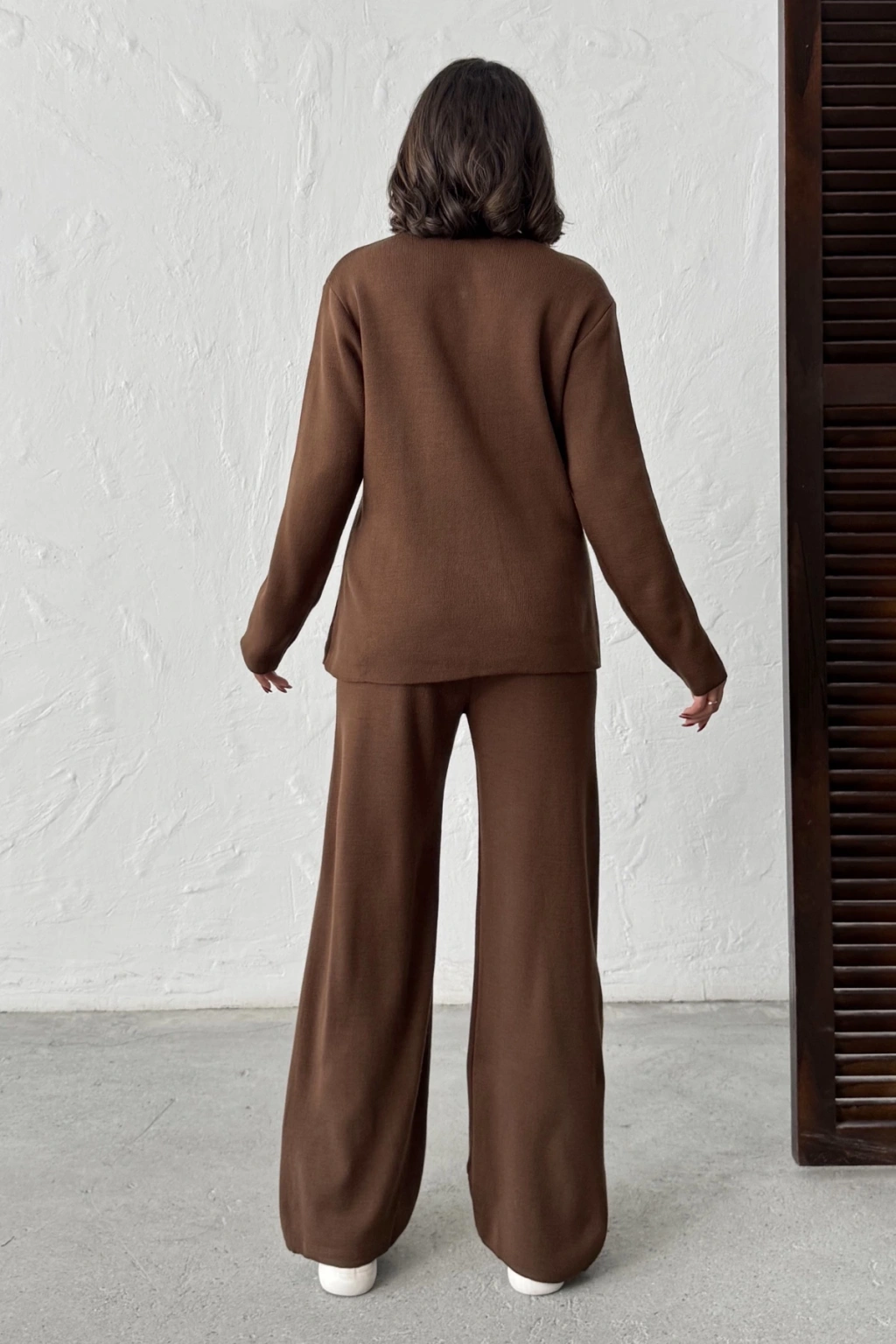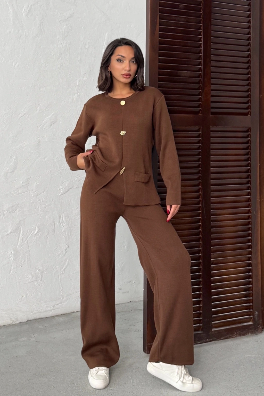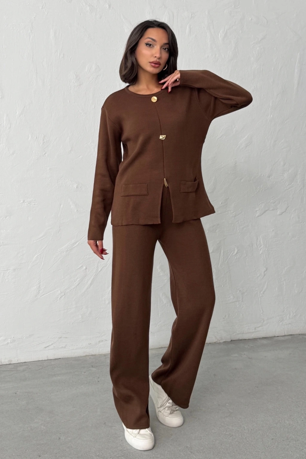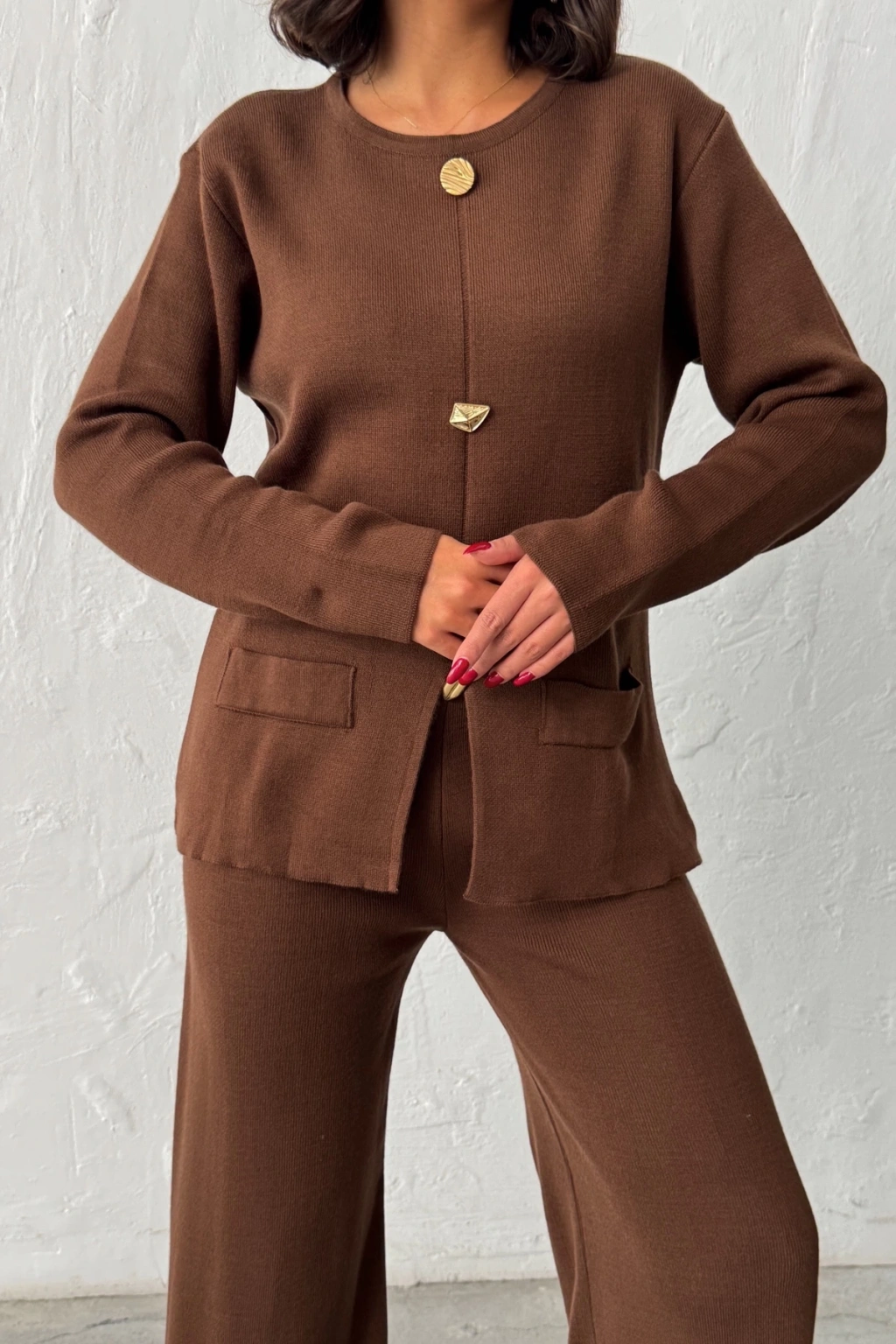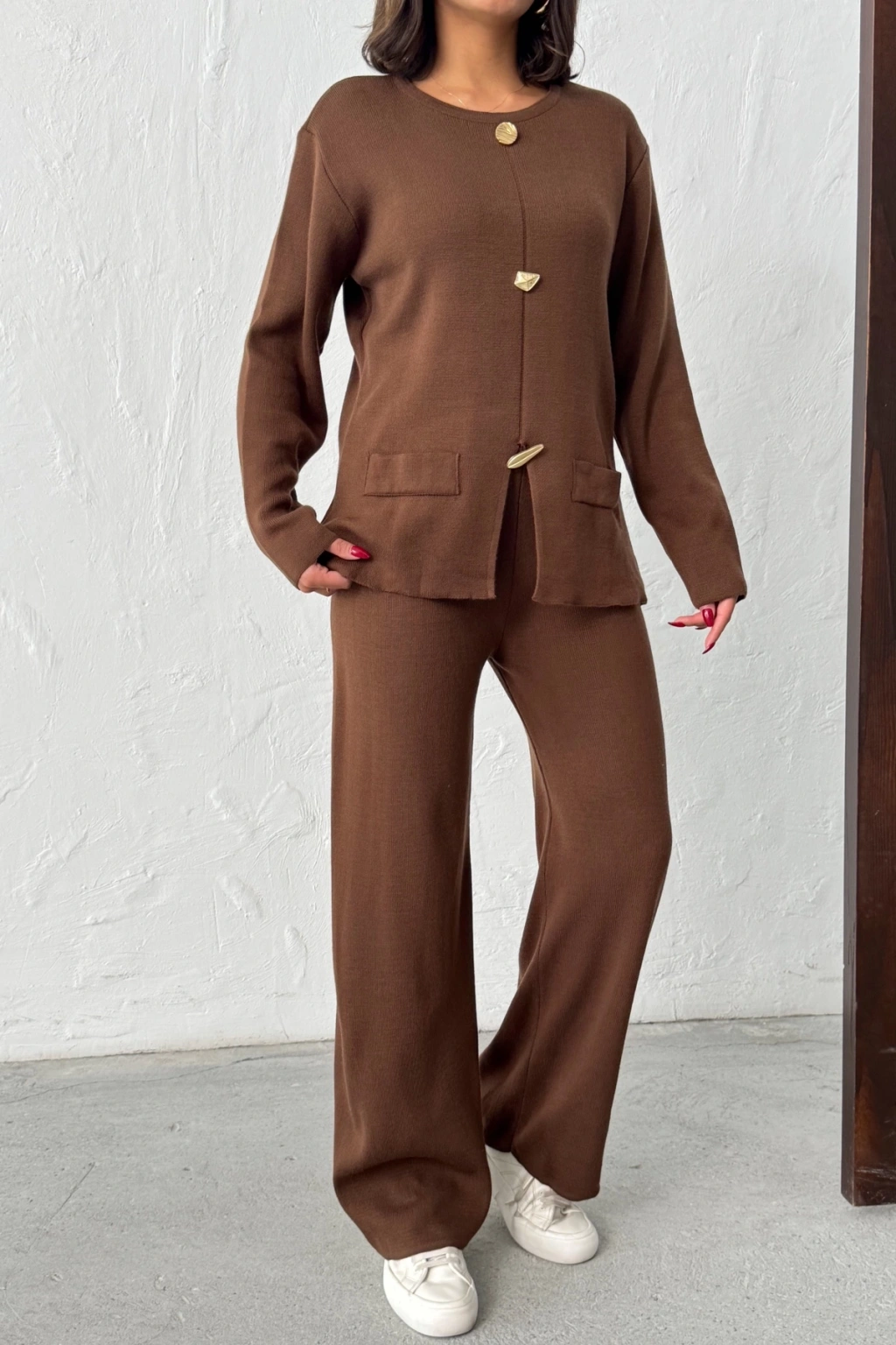 Kadın Kahverengi Gold Düğme Detaylı Alt Üst İkili Triko Takım