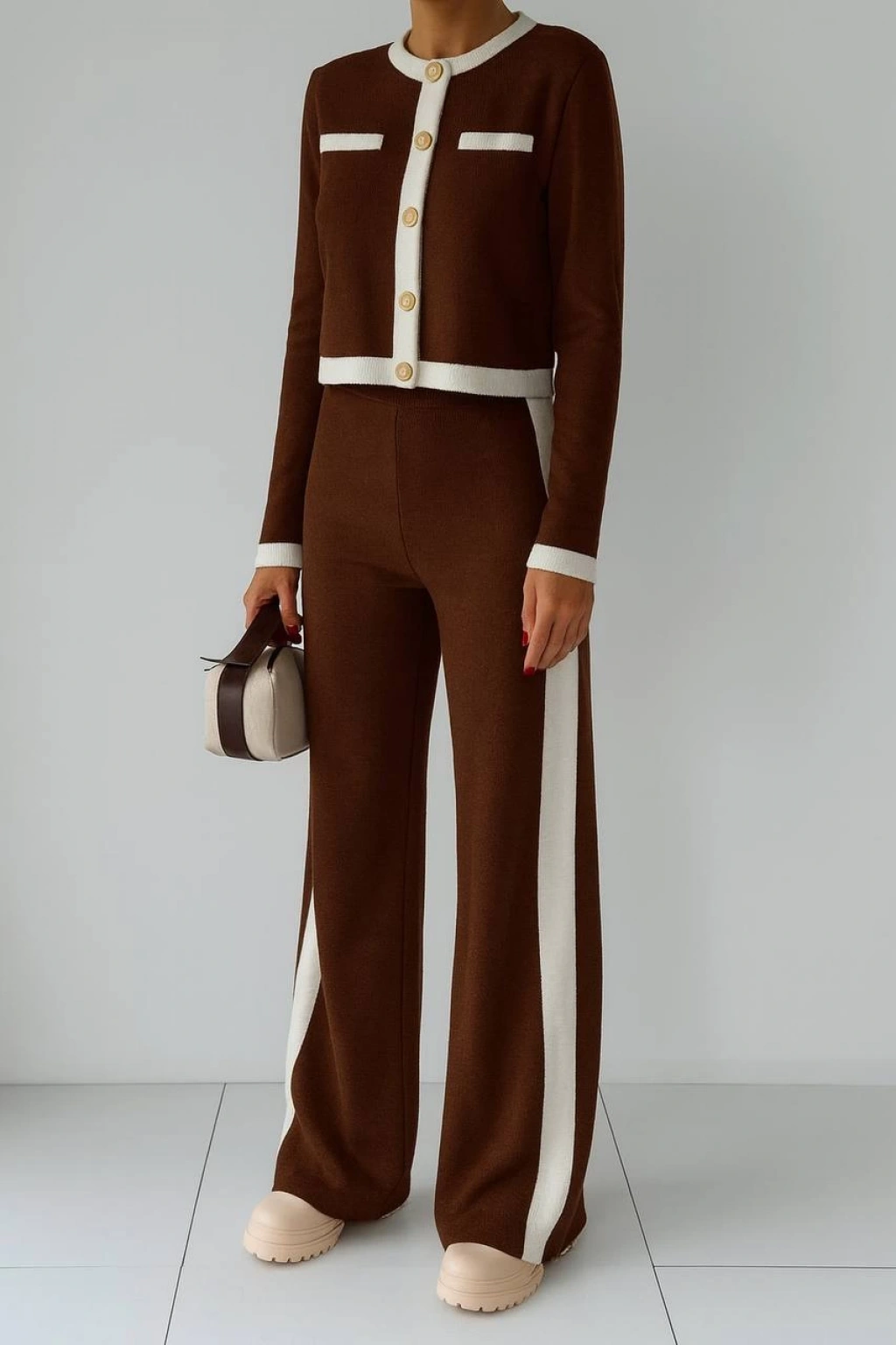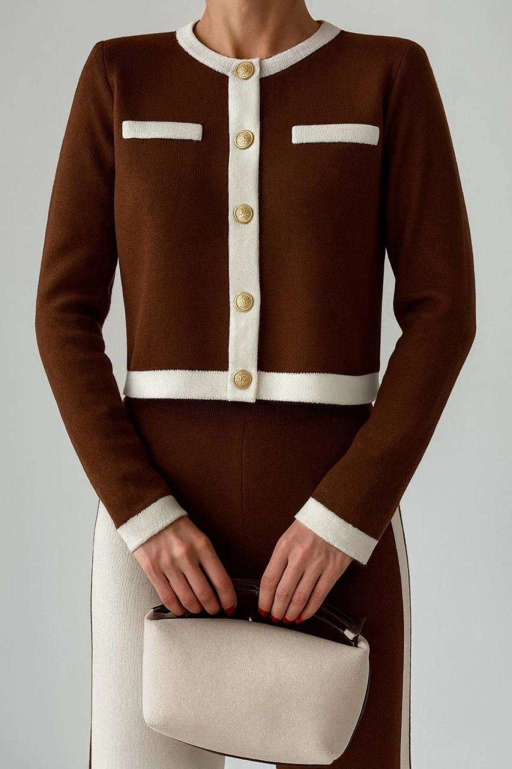 Kadın Kahverengi Gold Düğme Detaylı Hırka Pantolon Alt Üst İkili Triko Takım