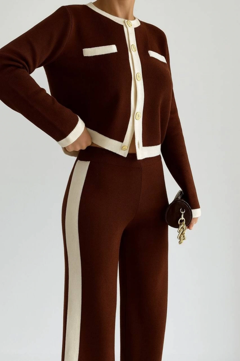Şıklığı ve rahatlığı bir arada sunan bu özel triko takım ile stilinizi bir adım öne taşıyın! Yumuşak dokulu kaliteli triko kumaşı sayesinde gün boyu konfor sağlarken, gold düğme detayları ile zarif ve modern bir görünüm sunar.