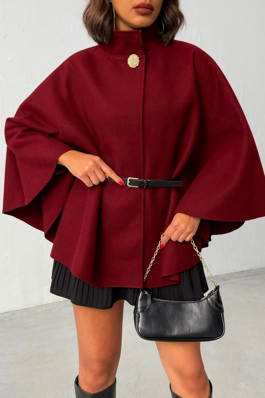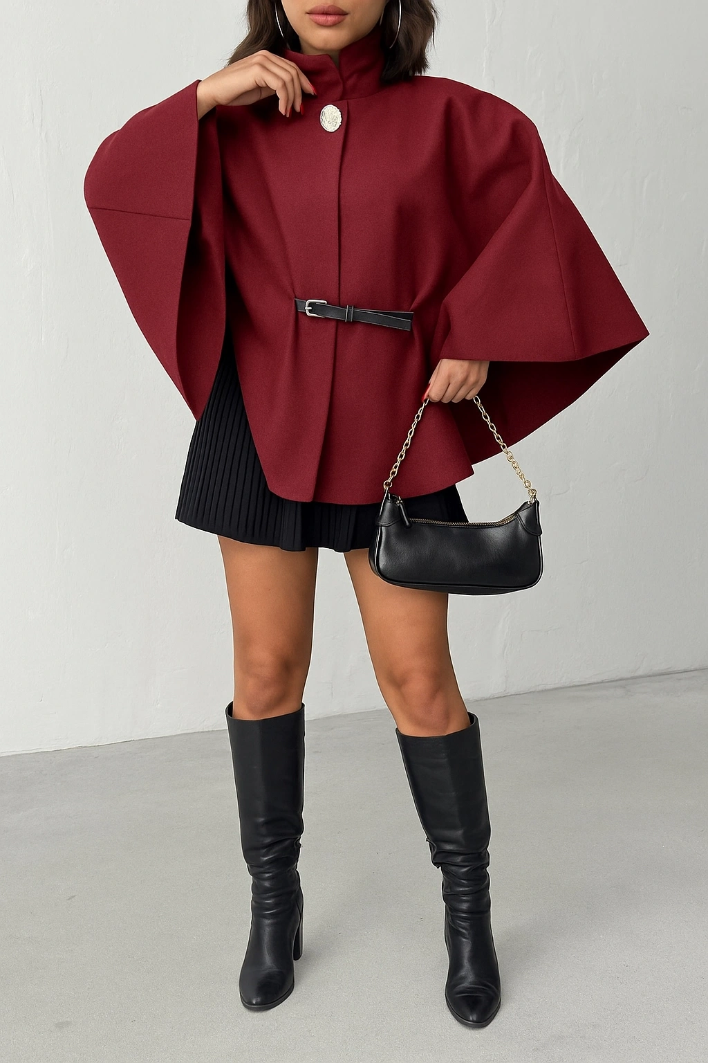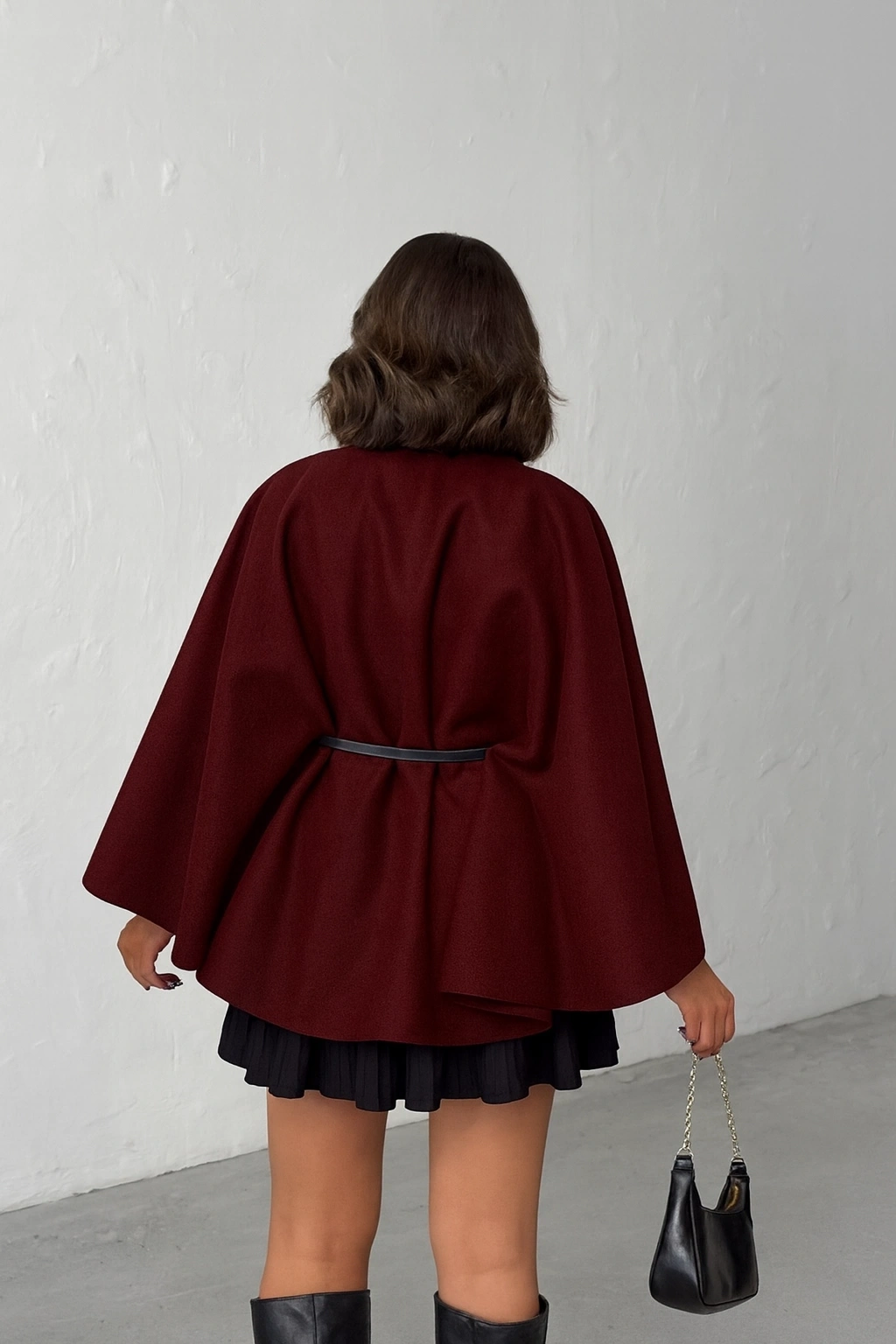 Kadın Bordo Gold Düğme ve Kemer Detaylı Kaşe Panço Ceket
