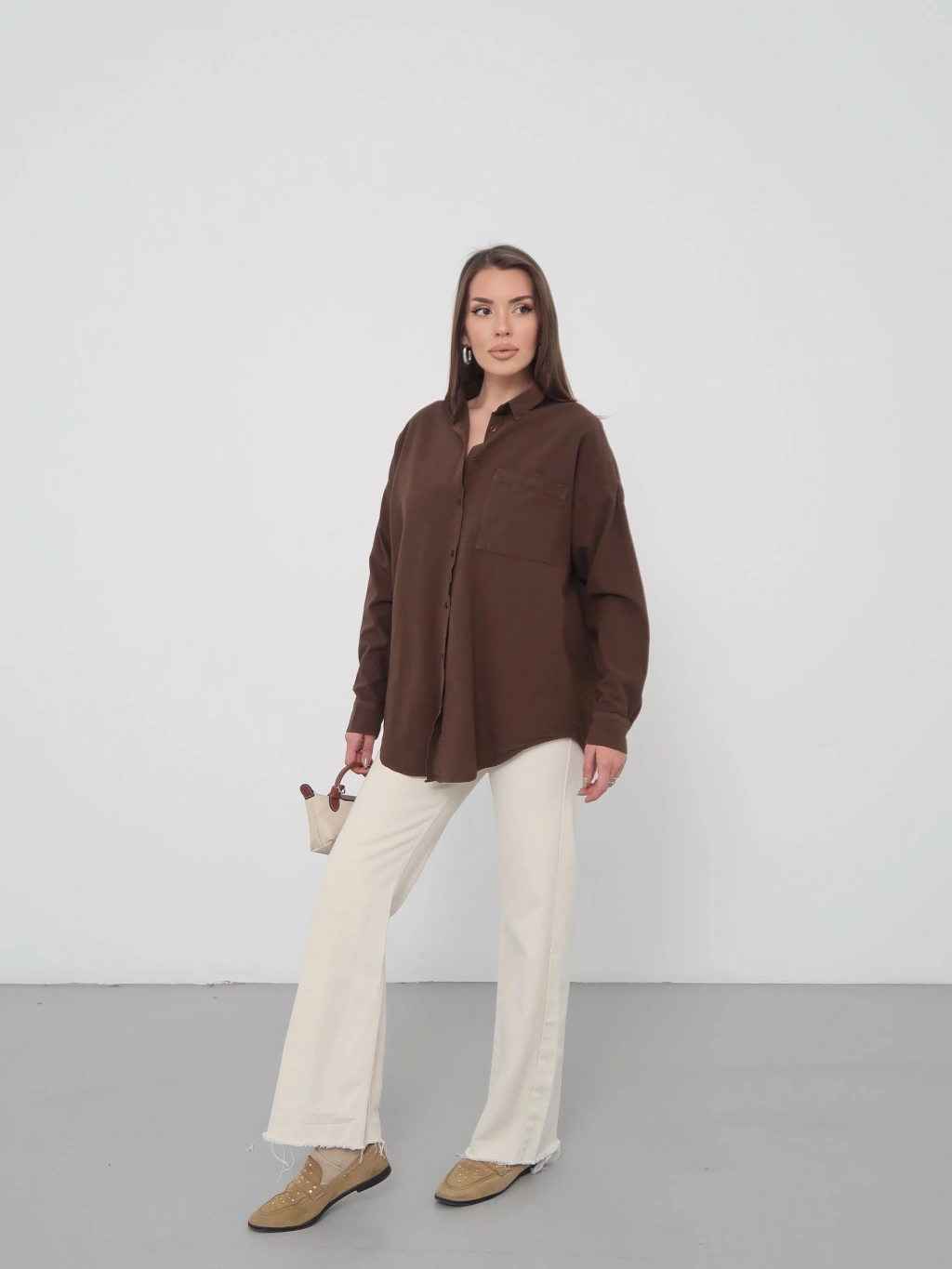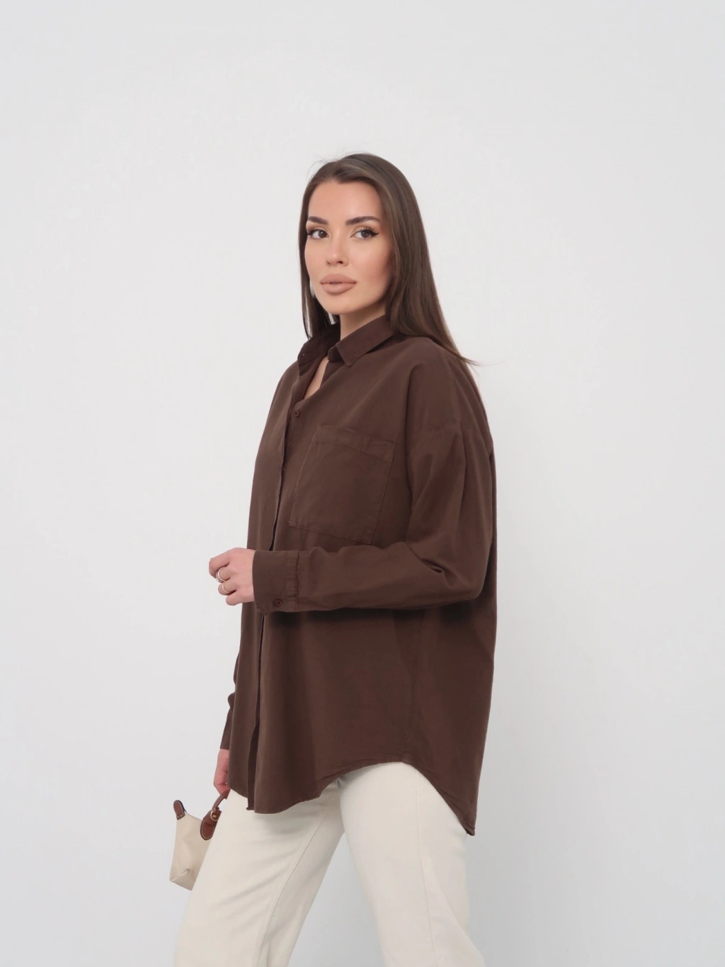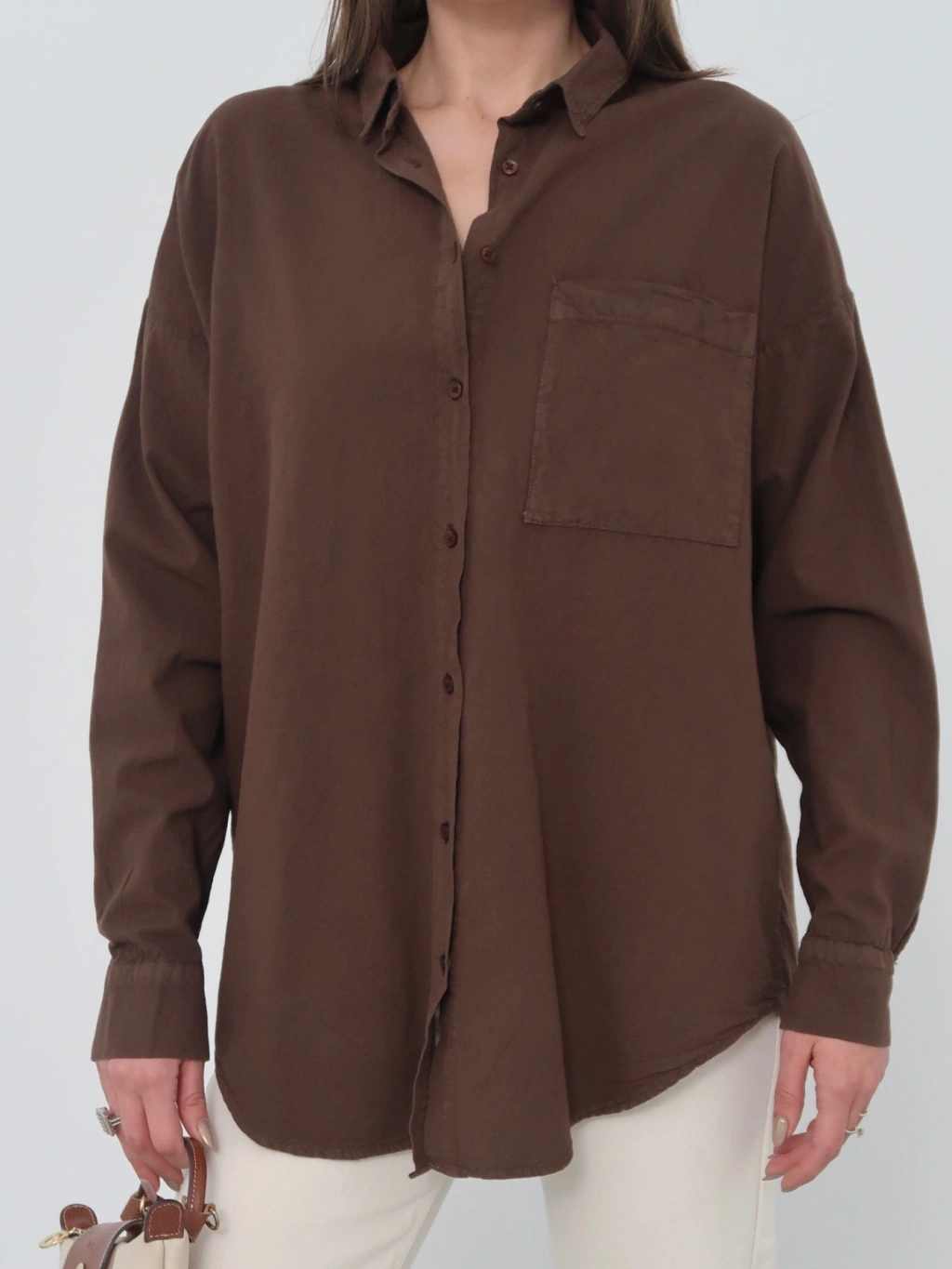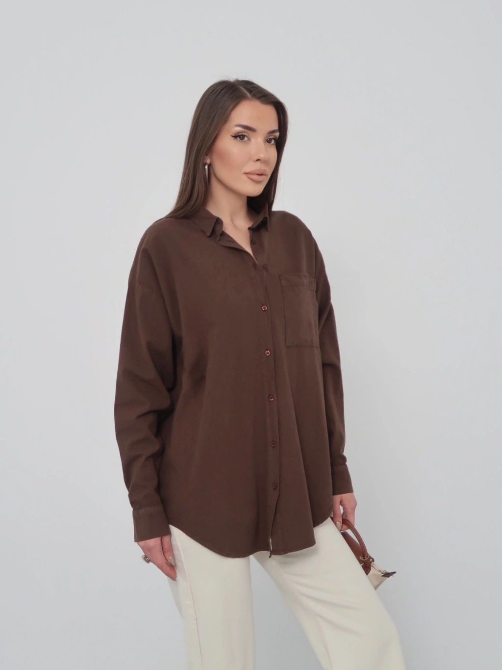 Kadın Kahverengi Ham Kumaş Cepli Gömlek