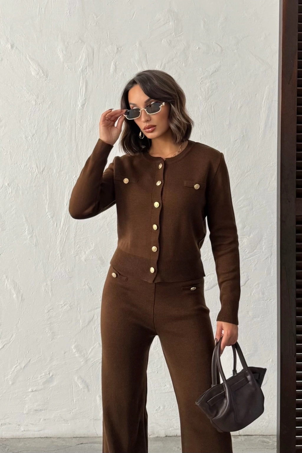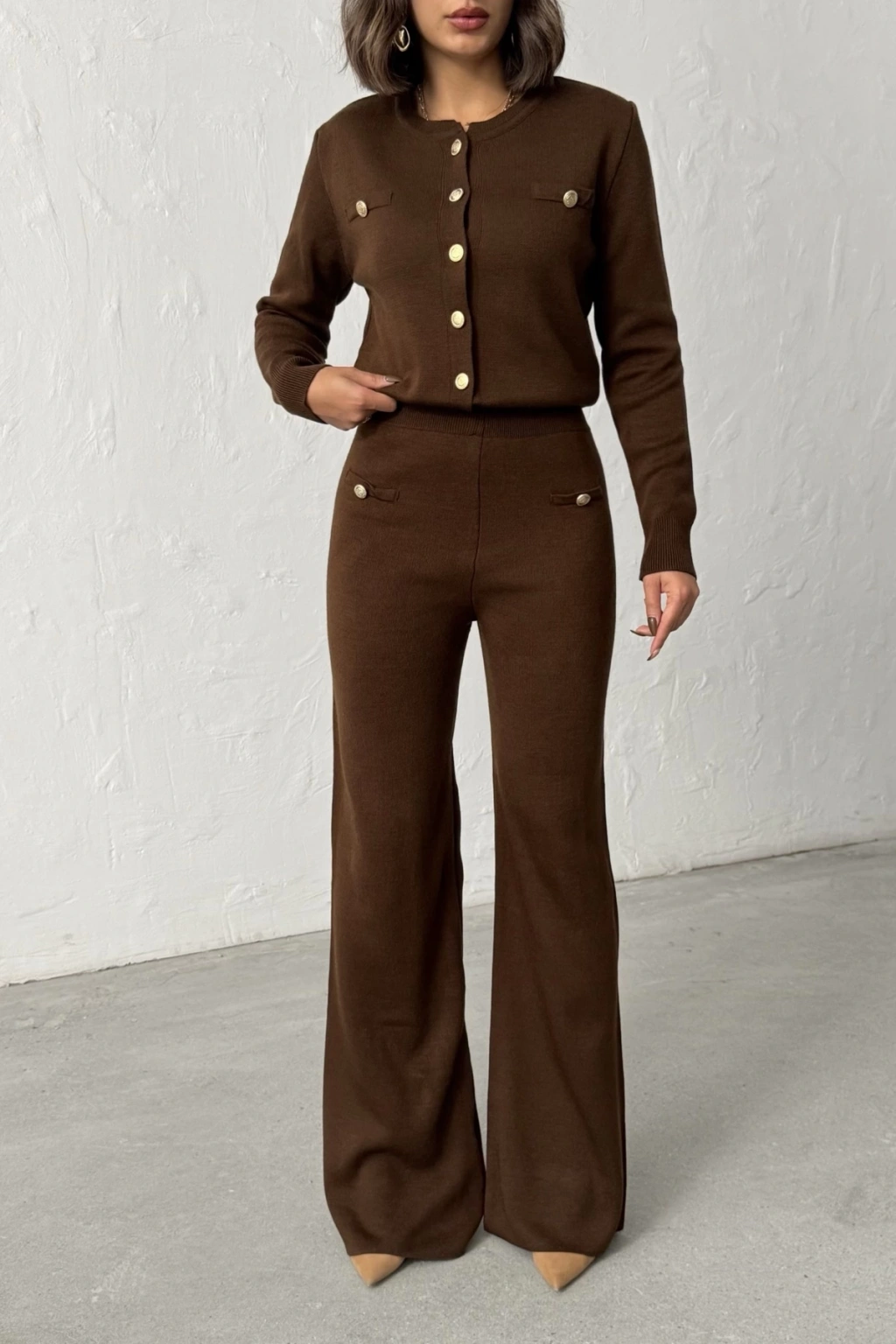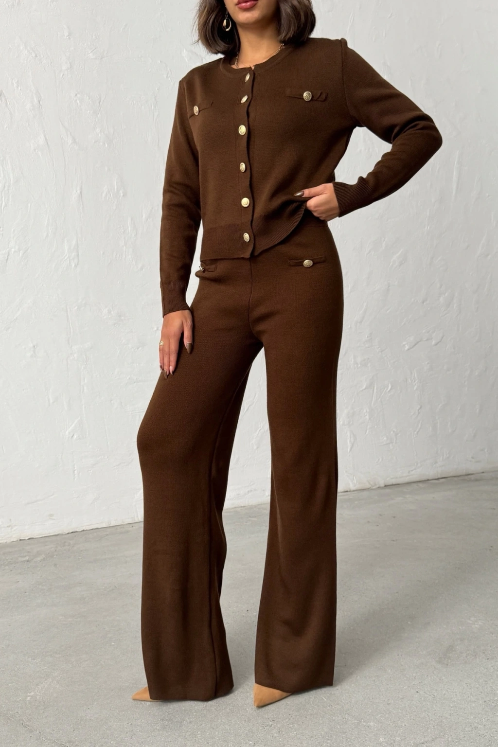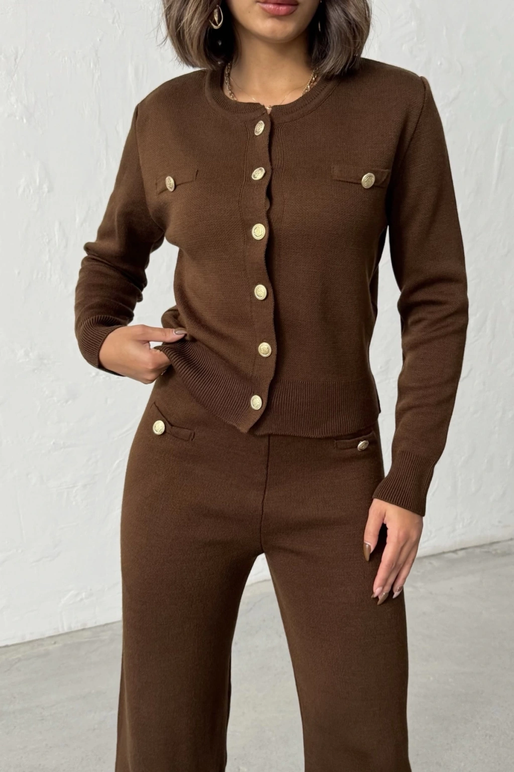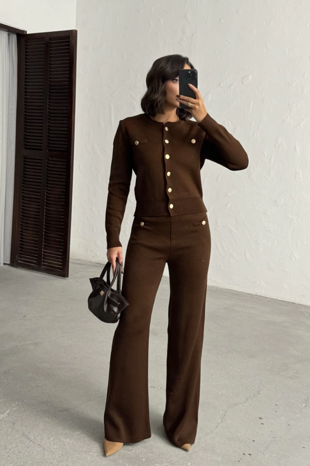 Kadın Kahverengi Hırka Pantolon Alt Üst İkili Triko Takım