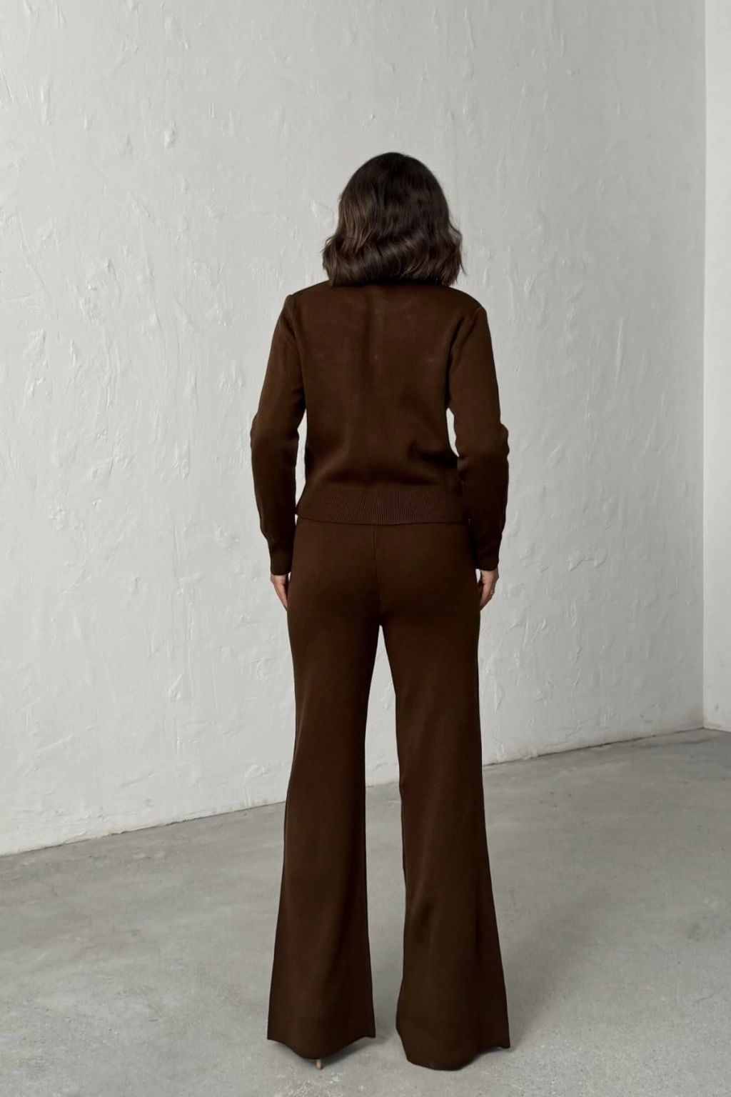 Kadın Kahverengi Şık Yaka Detaylı Kazak Pantolon Alt Üst İkili Triko Takım