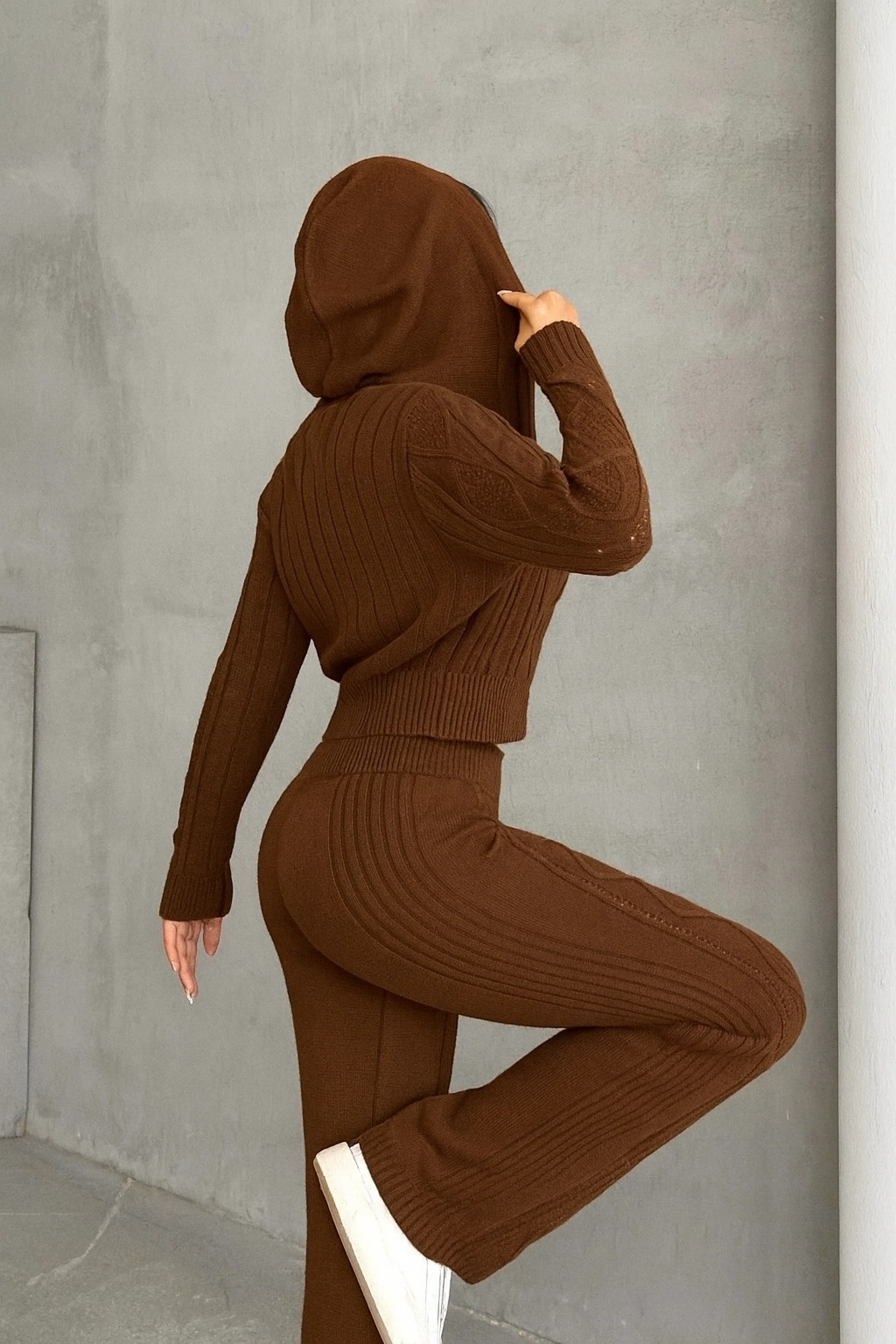 Kadın Kahverengi Kapşonlu Fermuarlı Crop Hırka Pantolon Alt Üst Triko Takım