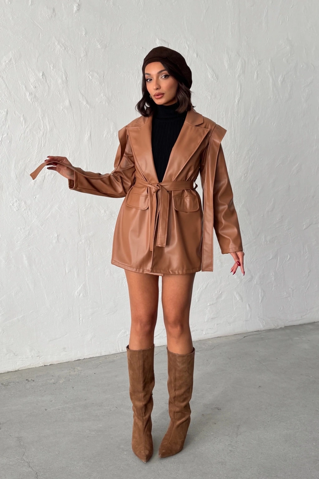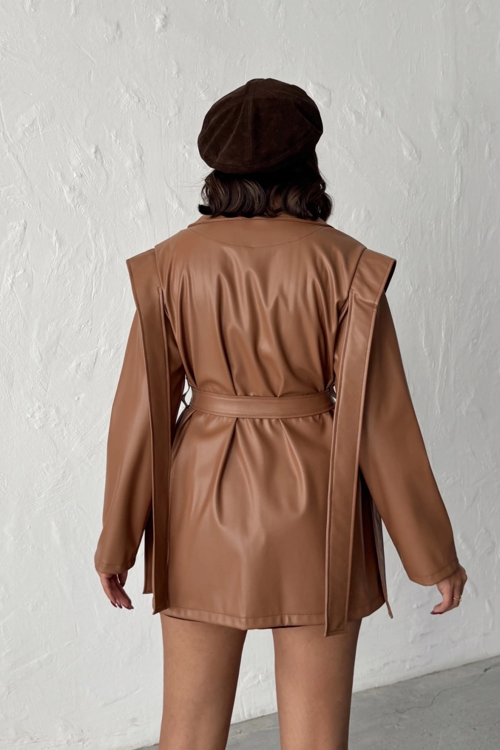 Kadın Kahverengi Kruvaze Yaka Kuşaklı Deri Ceket