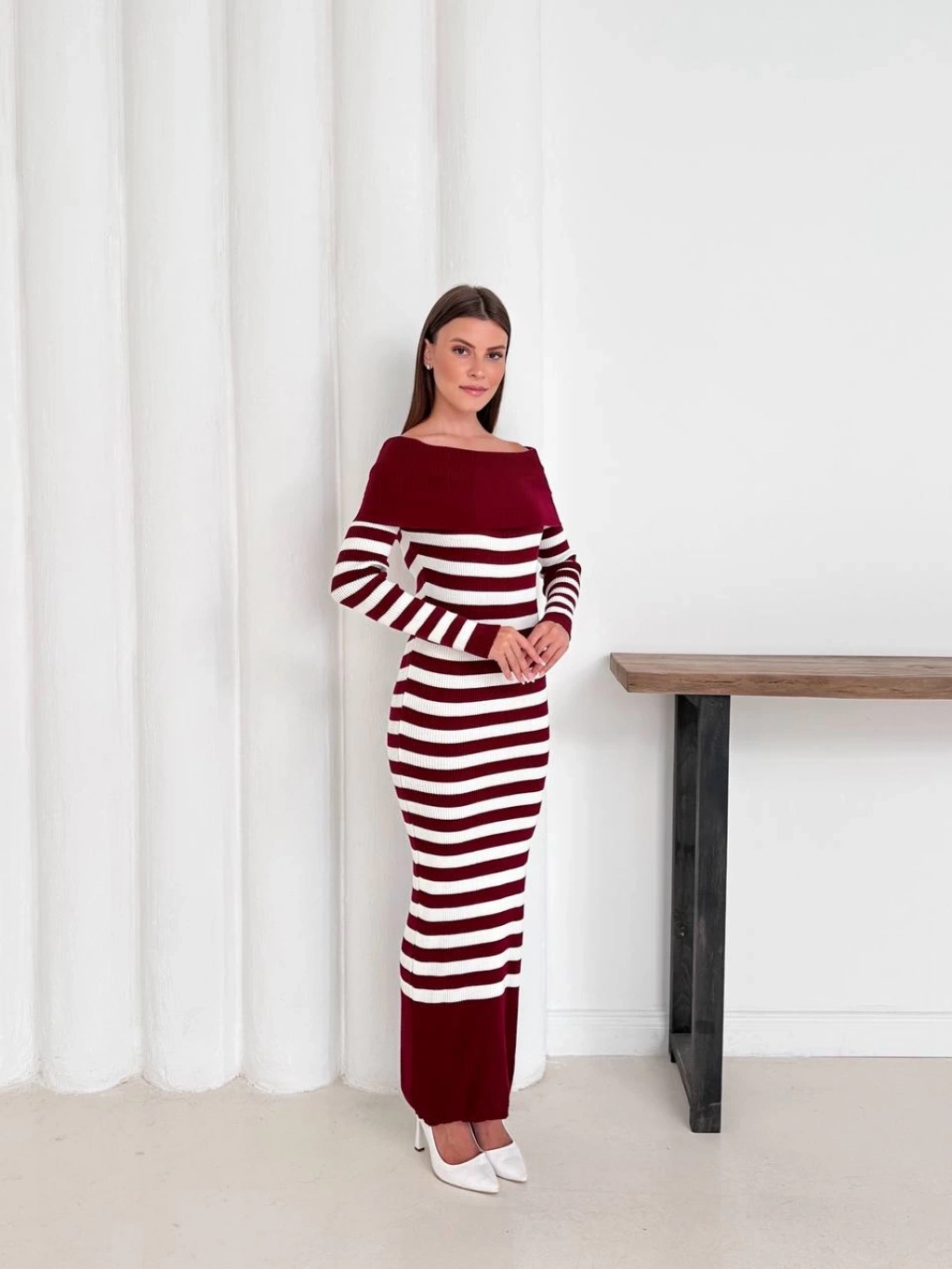 Kadın Bordo Madonna Kayık Yaka Esnek Midi Boy Triko Elbise