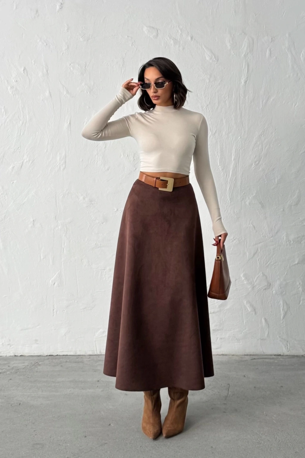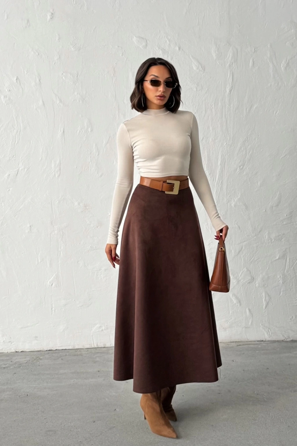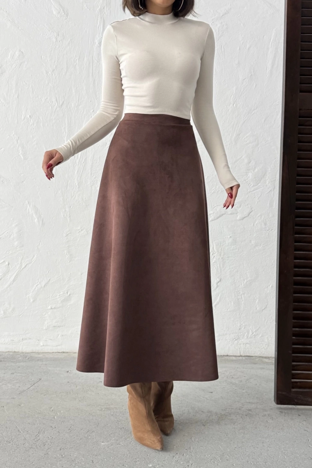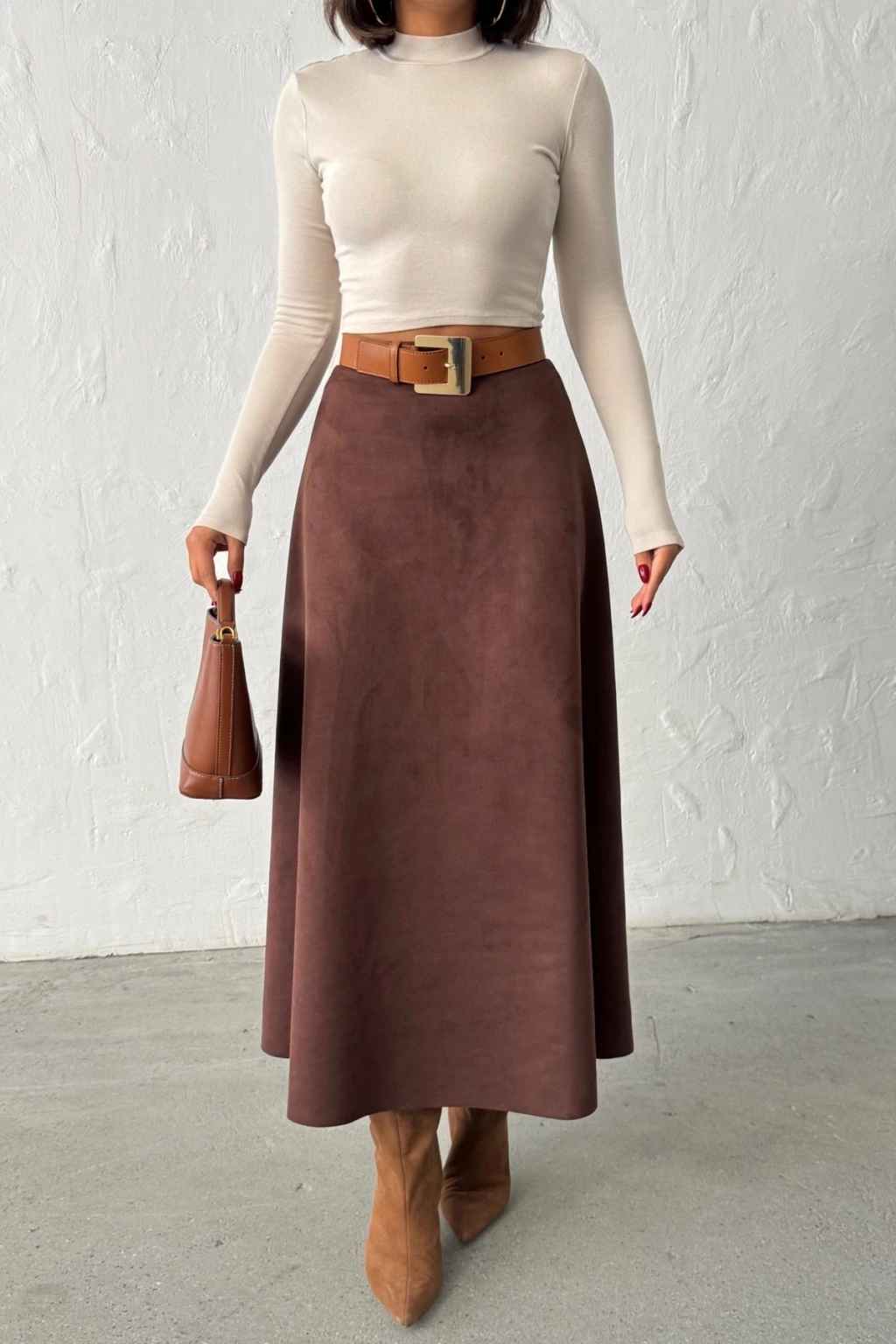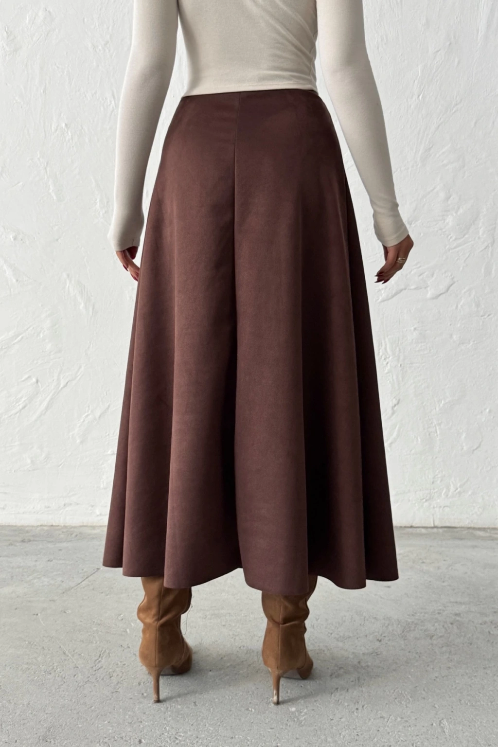 Kadın Kahverengi Midi Boy Süet Etek
