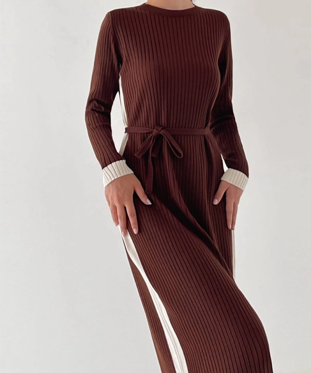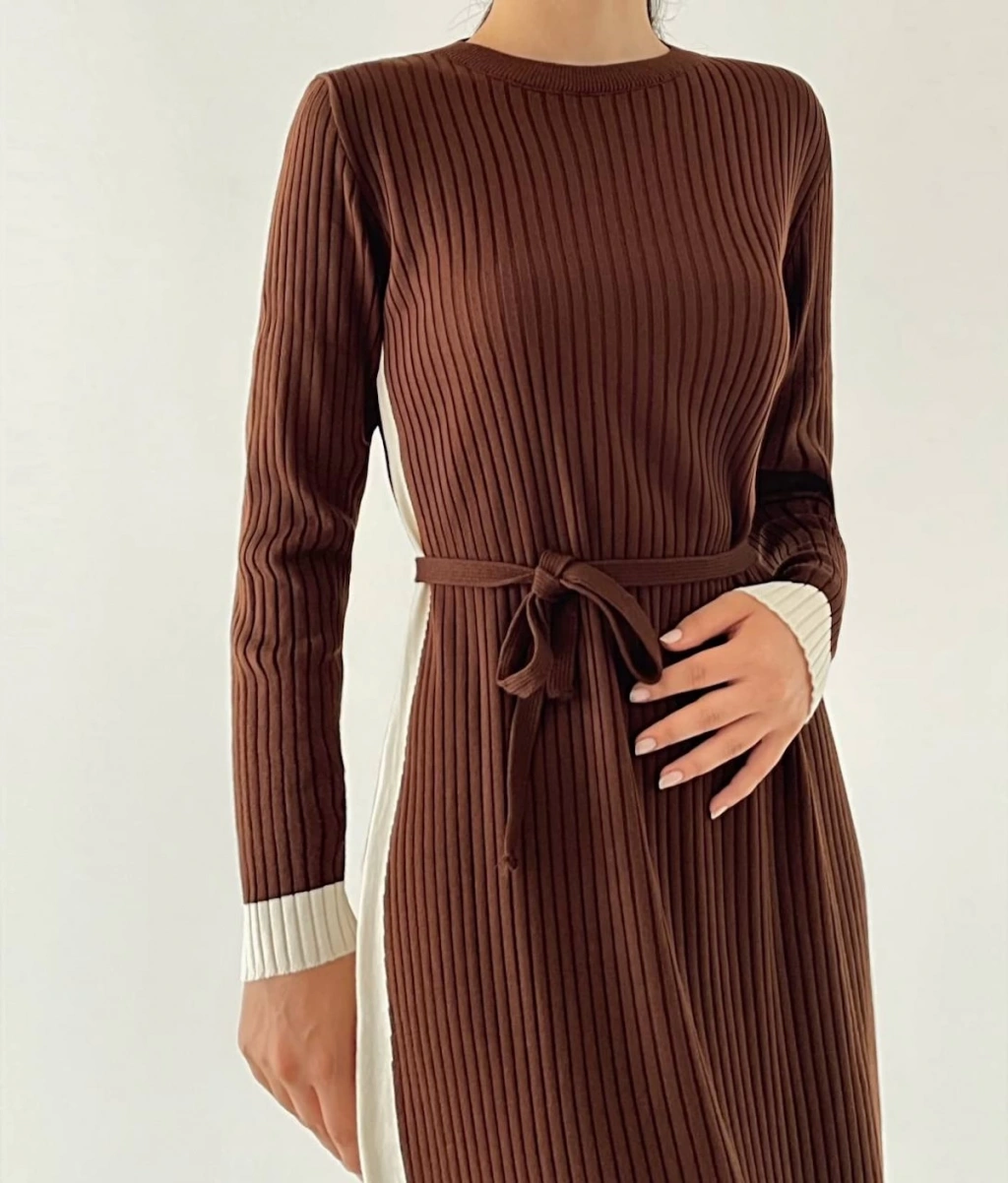 Kadın Kahverengi Şeritli Kuşaklı Triko Elbise