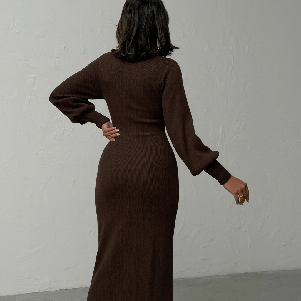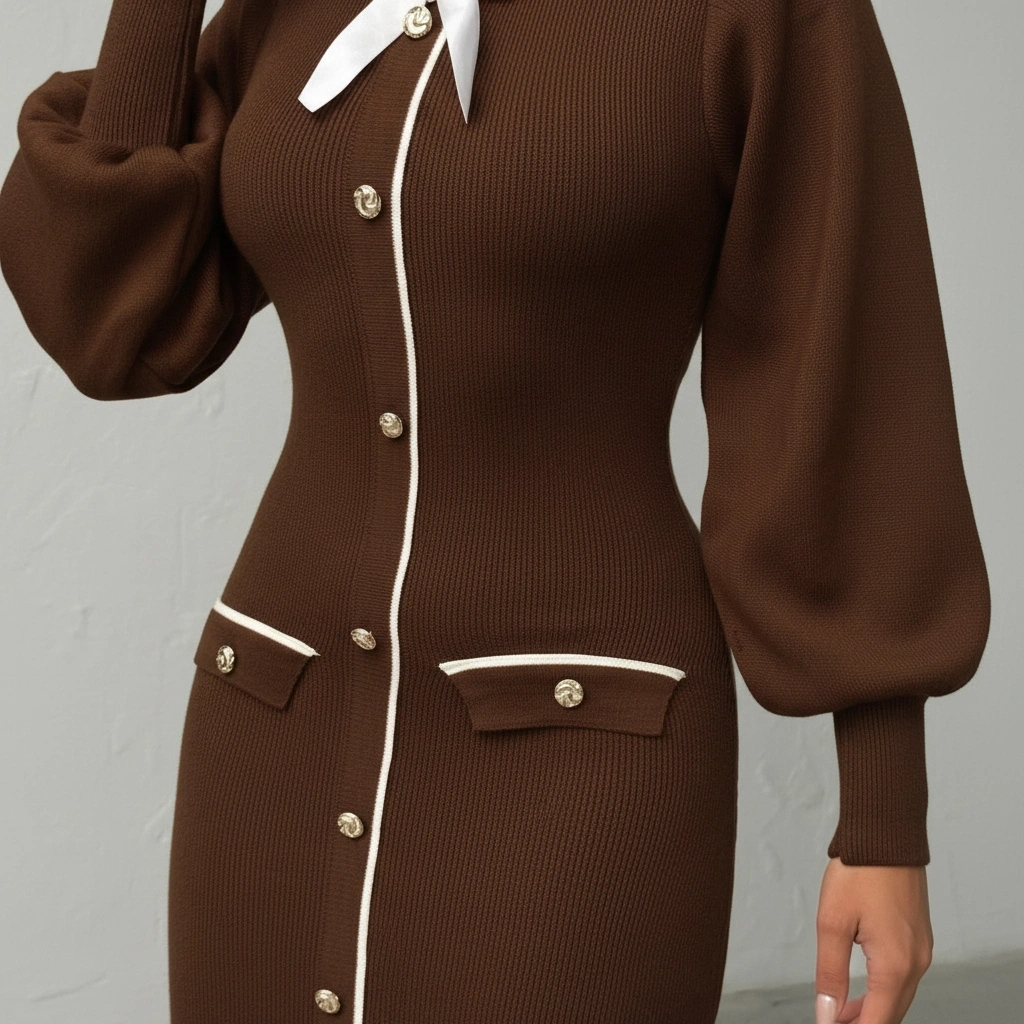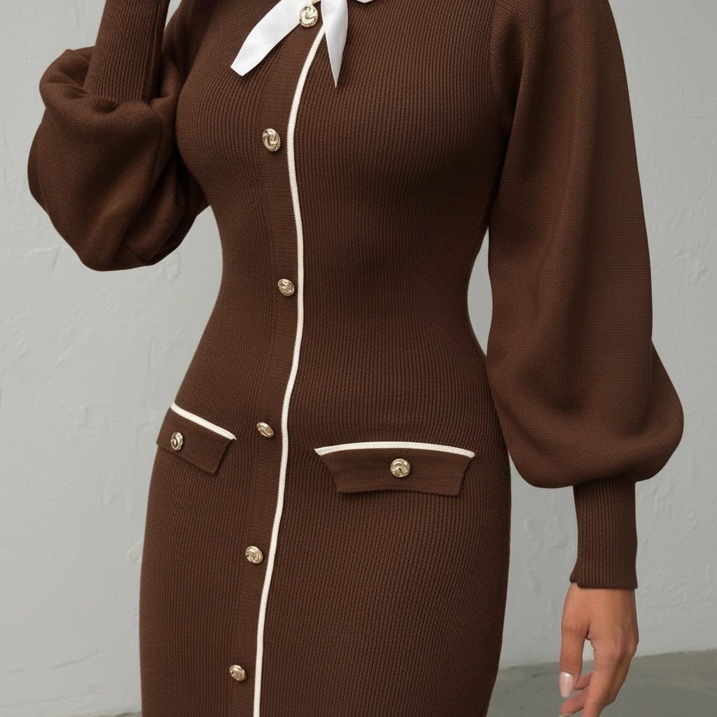 Kadın Kahverengi Şık Fiyonk Detaylı Balon Kol Triko Elbise