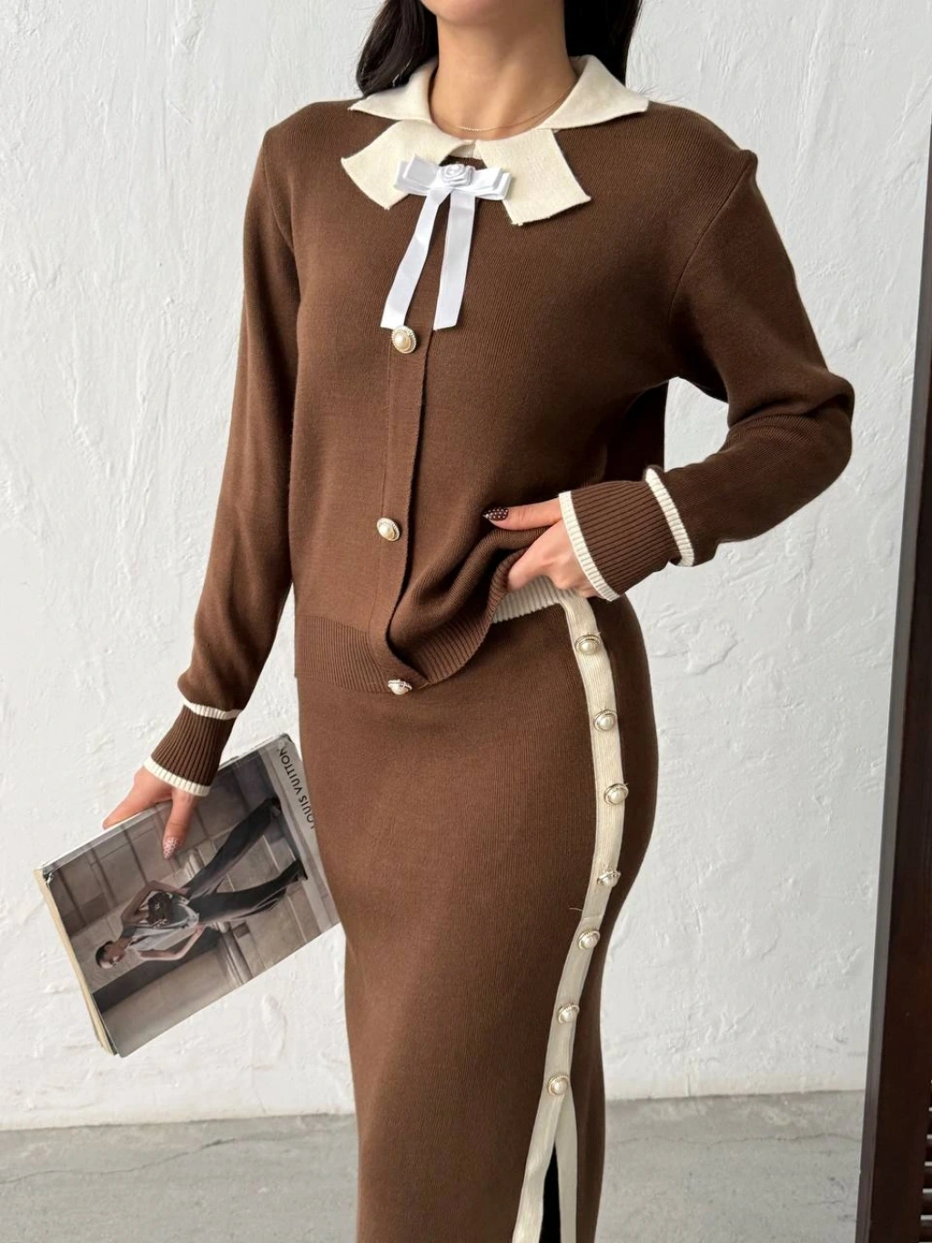 Kadın Kahverengi Şık Gül Fiyonk Detaylı Bluz Etek İkili Triko Takım
