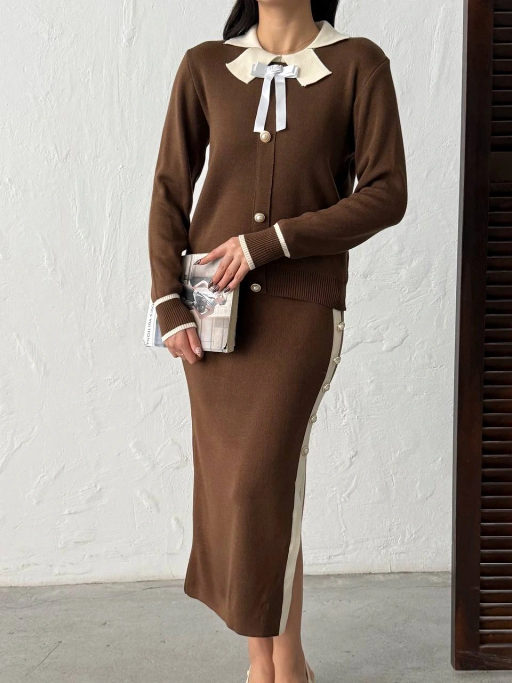 Kadın Acı Kahverengi Kol Düğme Detaylı Bluz Etek Alt Üst İkili Triko Takım