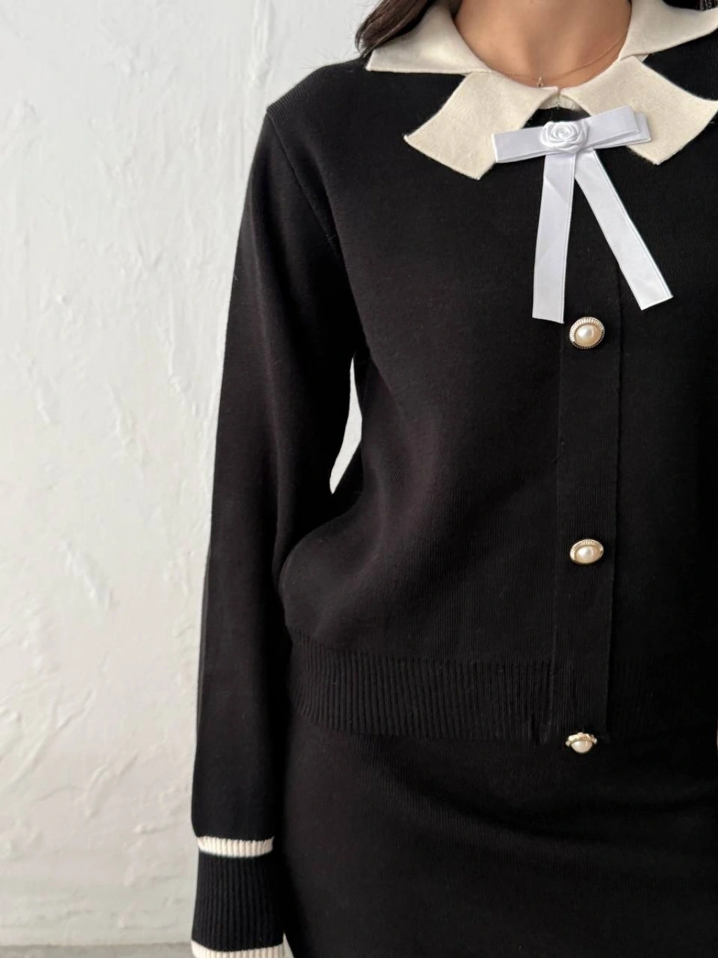 Kadın Siyah Şık Gül Fiyonk Detaylı Bluz Etek İkili Triko Takım
