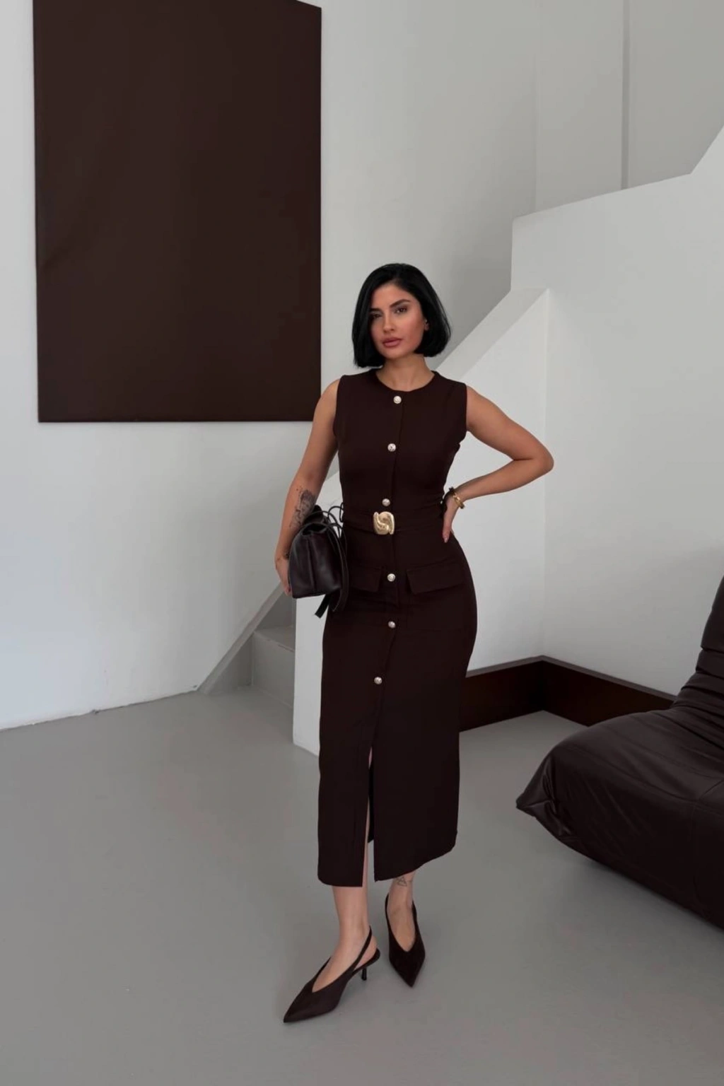 Kadın Kahverengi Şık Kemer Detaylı Kolsuz Slim Midi Boy elbise