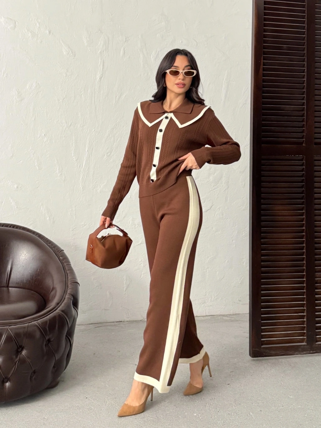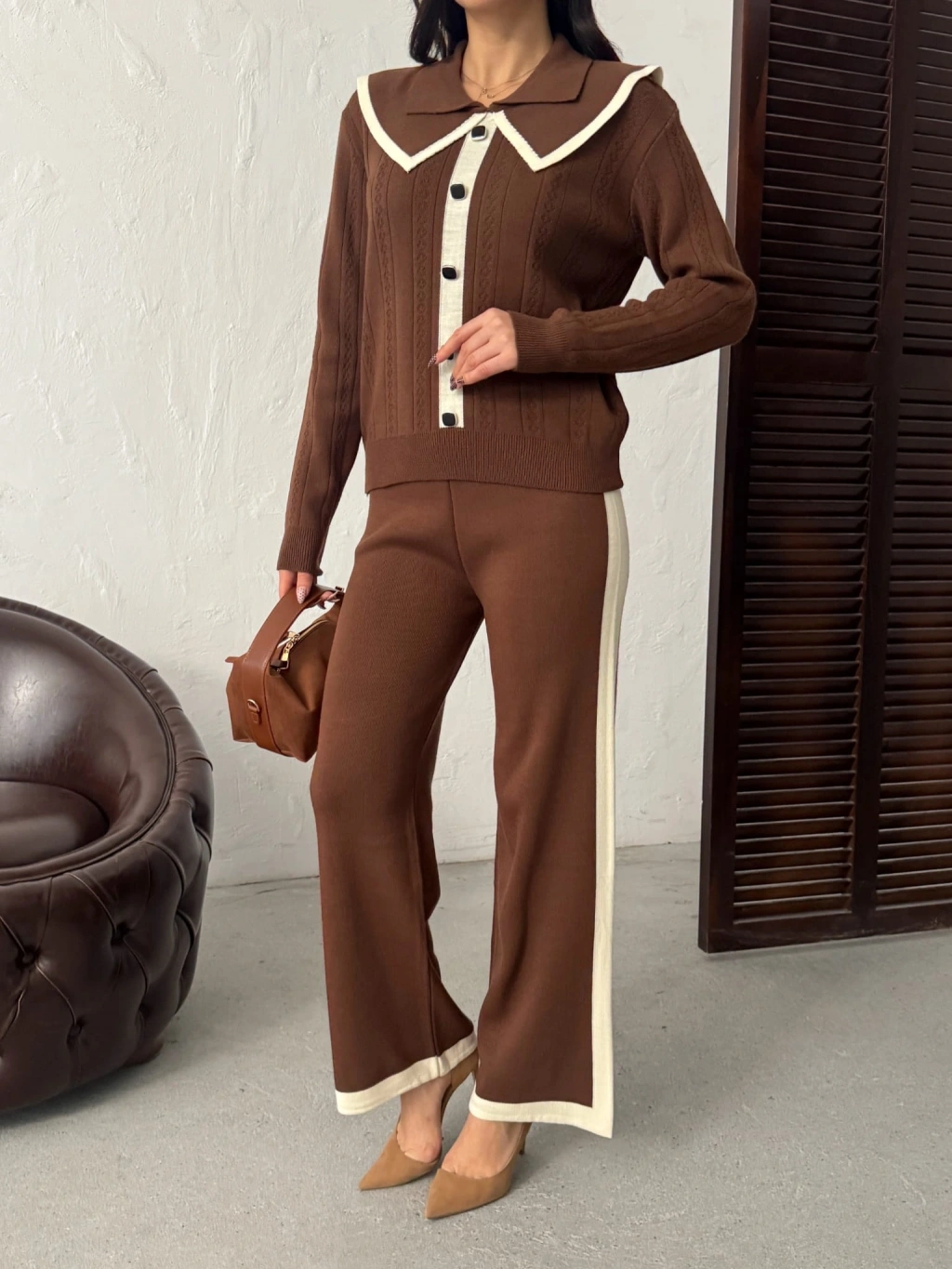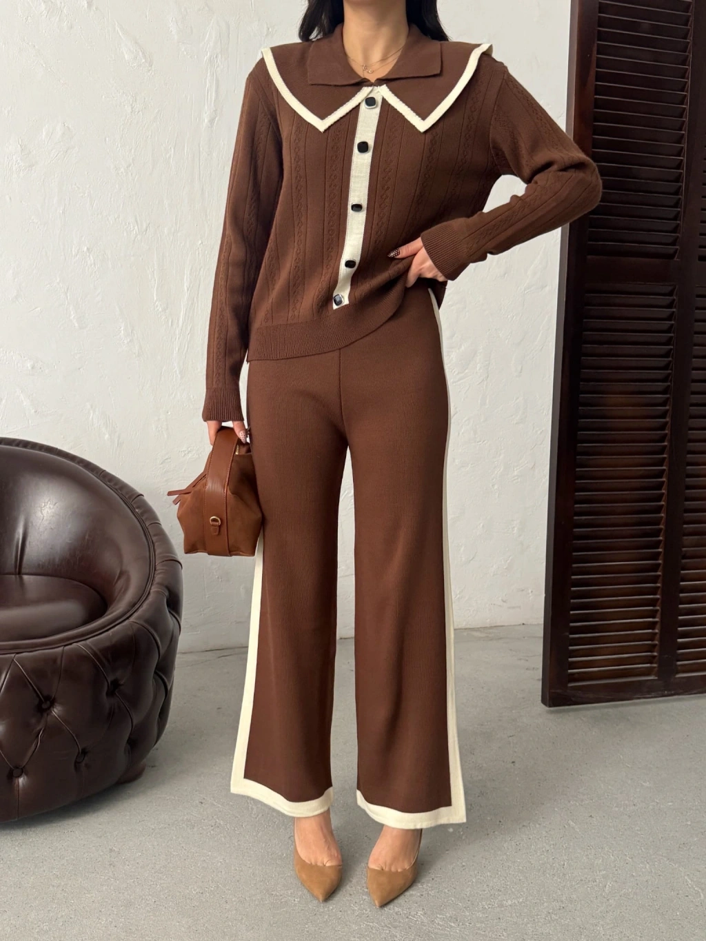 Kadın Kahverengi Şık Yaka Detaylı Düğmeli Bluz Pantolon Alt Üst İkili Triko Takım (Yeni Renk)